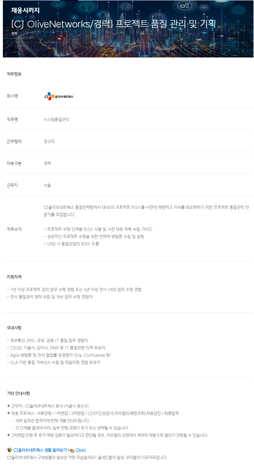 [CJ OliveNetworks/°æ·Â] ÇÁ·ÎÁ§Æ® ǰÁú °ü¸® ¹× ±âȹ
