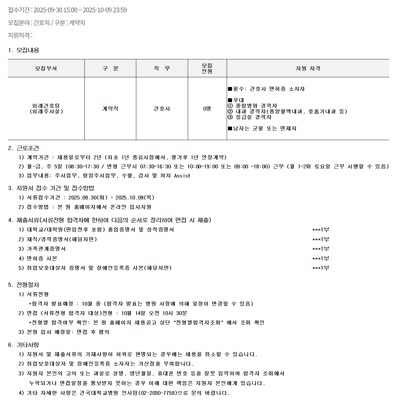 Á¢¼ö±â°£ : 2025-09-30 15:00 ~ 2025-10-09 23:59 ¸ðÁýºÐ¾ß : °£È£Á÷ / ±¸ºÐ : °è¾àÁ÷ Áö¿øÀÚ°Ý : 1. ¸ðÁý³»¿ë ¸ðÁýºÎ¼­ ±¸ ºÐ Á÷ ¹« ¸ðÁý Àοø Áö¿ø ÀÚ°Ý ¿Ü·¡°£È£ÆÀ (¿Ü·¡ÁÖ»ç½Ç) °è¾àÁ÷ °£È£»ç 0¸í ¡áÇʼö: °£È£»ç ¸éÇãÁõ ¼ÒÁöÀÚ ¡á¿ì´ë ¨ç Á¾ÇÕº´¿ø °æ·ÂÀÚ ¨è ³»°ú °æ·ÂÀÚ(Á¾¾çÇ÷¾×³»°ú, È£Èí±â³»°ú µî) ¨é ÀÀ±Þ½Ç °æ·ÂÀÚ ¡á³²ÀÚ´Â ±ºÇÊ ¶Ç´Â ¸éÁ¦ÀÚ 2. ±Ù·ÎÁ¶°Ç 1) °è¾à±â°£ : ä¿ëÀϷκÎÅÍ 2³â (ÃÖÃÊ 1³â Á¾·á½ÃÁ¡¿¡¼­, Æò°¡ÈÄ 1³â ¿¬Àå°è¾à) 2) ¿ù~±Ý, ÁÖ 5ÀÏ (08:30~17:30 / º¯Çü ±Ù¹«½Ã 07:30~16:30 ¶Ç´Â 10:00~19:00 ¶Ç´Â 09:00 ~18:00) ±Ù¹« (¿ù 1~2ȸ Åä¿äÀÏ ±Ù¹« ½ÃÇàÇÒ ¼ö ÀÖÀ½) 3) ¾÷¹«³»¿ë: ÁÖ»ç¾÷¹«, Ç×¾ÏÁÖ»ç¾÷¹«, ¼öÇ÷, °Ë»ç ¹× óġ Assist 3. Áö¿ø¼­ Á¢¼ö ±â°£ ¹× Á¢¼ö¹æ¹ý 1) ¼­·ùÁ¢¼ö±â°£ : 2025.09.30(È­) ~ 2025.10.09(¸ñ) 2) Á¢¼ö¹æ¹ý : º» ¿ø ȨÆäÀÌÁö¿¡¼­ ¿Â¶óÀÎ ÀÔ»çÁö¿ø 4. Á¦Ãâ¼­·ù(¼­·ùÀüÇü ÇÕ°ÝÀÚ¿¡ ÇÑÇÏ¿© ´ÙÀ½ÀÇ ¼ø¼­·Î Á¤¸®ÇÏ¿© ¸éÁ¢ ½Ã Á¦Ãâ) 1) ´ëÇб³/´ëÇпø(ÆíÀÔÀüÈÄ Æ÷ÇÔ) Á¹¾÷Áõ¸í¼­ ¹× ¼ºÀûÁõ¸í¼­ ***1ºÎ 2) ÀçÁ÷/°æ·ÂÁõ¸í¼­(ÇØ´çÀÚ¸¸) ***1ºÎ 3) °¡Á·°ü°èÁõ¸í¼­ ***1ºÎ 4) ¸éÇãÁõ »çº» ***1ºÎ 5) Ãë¾÷º¸È£´ë»óÀÚ Áõ¸í¼­ ¹× Àå¾ÖÀεî·ÏÁõ »çº»(ÇØ´çÀÚ¸¸) ***1ºÎ 5. ÀüÇüÀýÂ÷ 1) ¼­·ùÀüÇü *ÇÕ°ÝÀÚ ¹ßÇ¥¿¹Á¤ : 10¿ù Áß (ÇÕ°ÝÀÚ ¹ßÇ¥´Â º´¿ø »çÁ¤¿¡ ÀÇÇØ ÀÏÁ¤ÀÌ º¯°æµÉ ¼ö ÀÖÀ½) 2) ¸éÁ¢ (¼­·ùÀüÇü ÇÕ°ÝÀÚ ´ë»ó)ÀüÇü : 10¿ù 14ÀÏ ¿ÀÀü 10½Ã 30ºÐ *ÀüÇüº° ÇÕ°Ý¿©ºÎ È®ÀÎ: º» ¿ø ȨÆäÀÌÁö ä¿ë°ø°í »ó´Ü "ÀüÇüº°ÇÕ°ÝÀÚÁ¶È¸" ¿¡¼­ Á¶È¸ È®ÀÎ 3) º»¿ø ÀÔ»ç ¿¹Á¤ÀÏ: ¸éÁ¢ ÈÄ ÇùÀÇ 6. ±âŸ»çÇ× 1) Áö¿ø¼­ ¹× Á¦Ãâ¼­·ùÀÇ ±âÀç»çÇ×ÀÌ ÇãÀ§·Î ÆÇ¸íµÇ´Â °æ¿ì¿¡´Â ä¿ëÀ» Ãë¼ÒÇÒ ¼ö ÀÖ½À´Ï´Ù. 2) Ãë¾÷º¸È£´ë»óÀÚ ¹× Àå¾ÖÀεî·ÏÁõ ¼ÒÁöÀÚ´Â °¡»êÁ¡À» ºÎ¿©ÇÕ´Ï´Ù. 3) Áö¿øÀÚ º»ÀÎÀÇ °íÀÇ ¶Ç´Â °ú½Ç·Î ¼º¸í, »ý³â¿ùÀÏ, ÈÞ´ëÆù ¹øÈ£ µîÀ» À߸ø ÀÔ·ÂÇÏ¿© ÇÕ°ÝÀÚ Á¶È¸¿¡¼­ ´©¶ôµÇ°Å³ª ¸éÁ¢ÀÏÁ¤À» Å뺸¹ÞÁö ¸øÇÏ´Â °æ¿ì ÀÌ¿¡ ´ëÇÑ Ã¥ÀÓÀº Áö¿øÀÚ º»Àο¡°Ô ÀÖ½À´Ï´Ù. 4) ±âŸ ÀÚ¼¼ÇÑ »çÇ×Àº °Ç±¹´ëÇб³º´¿ø ÀλçÆÀ(***-****-****)À¸·Î ¹®ÀÇ ¹Ù¶ø´Ï´Ù.