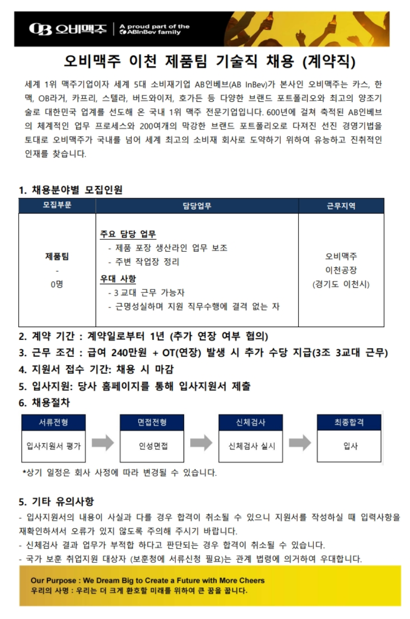 [ABInbev Korea ¿Àºñ¸ÆÁÖ] ÀÌõ°øÀå Á¦Ç°ÆÀ ±â¼úÁ÷ ä¿ë (°è¾àÁ÷)