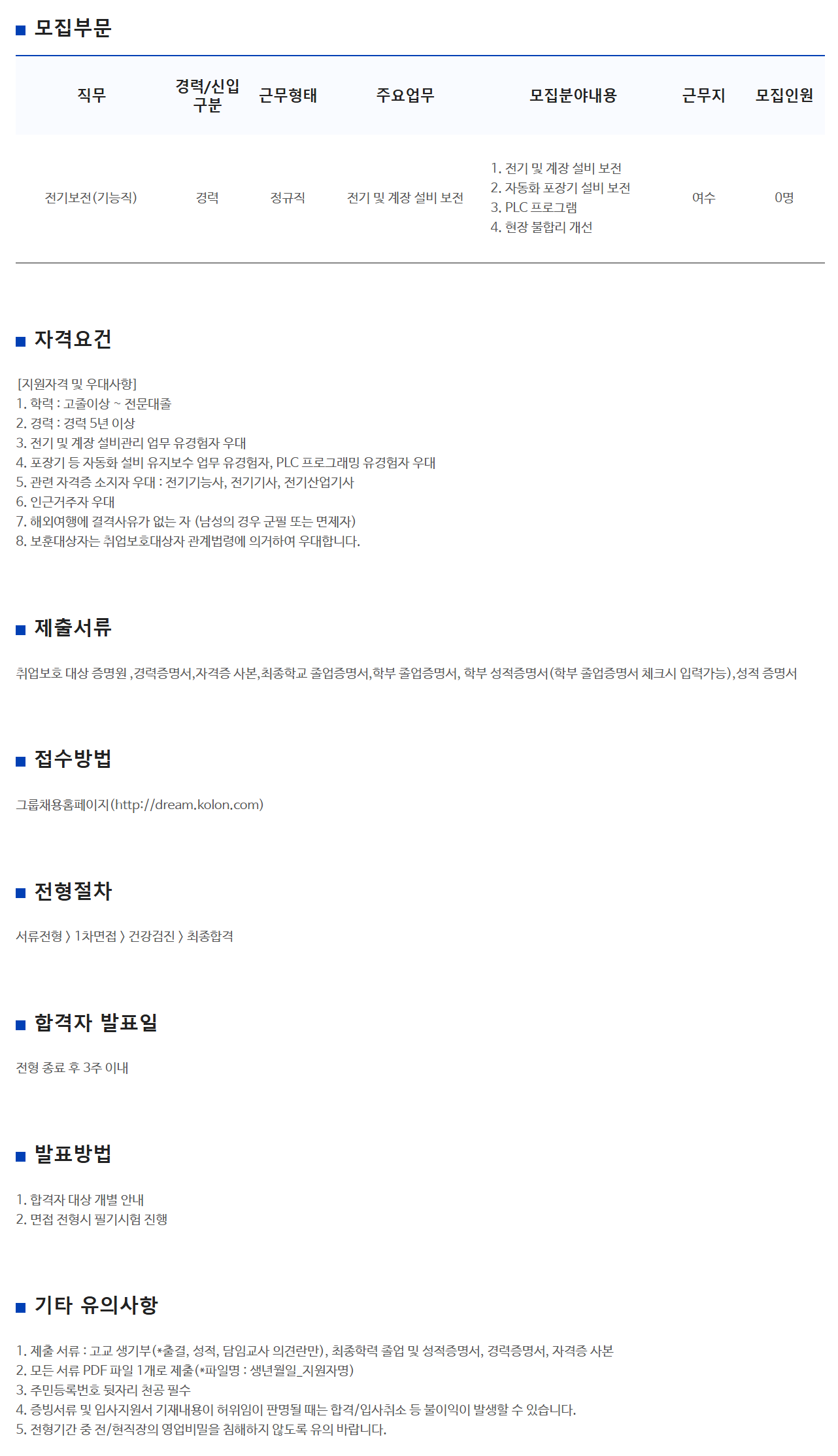 Á÷¹« °æ·Â/½ÅÀÔ ±¸ºÐ ±Ù¹«ÇüÅ ÁÖ¿ä¾÷¹« ¸ðÁýºÐ¾ß³»¿ë ±Ù¹«Áö ¸ðÁýÀοø Àü±âº¸Àü(±â´ÉÁ÷) °æ·Â Á¤±ÔÁ÷ Àü±â ¹× °èÀå ¼³ºñ º¸Àü 1. Àü±â ¹× °èÀå ¼³ºñ º¸Àü 2. ÀÚµ¿È Æ÷Àå±â ¼³ºñ º¸Àü 3. PLC ÇÁ·Î±×·¥ 4. ÇöÀå ºÒÇÕ¸® °³¼± ¿©¼ö 0¸í