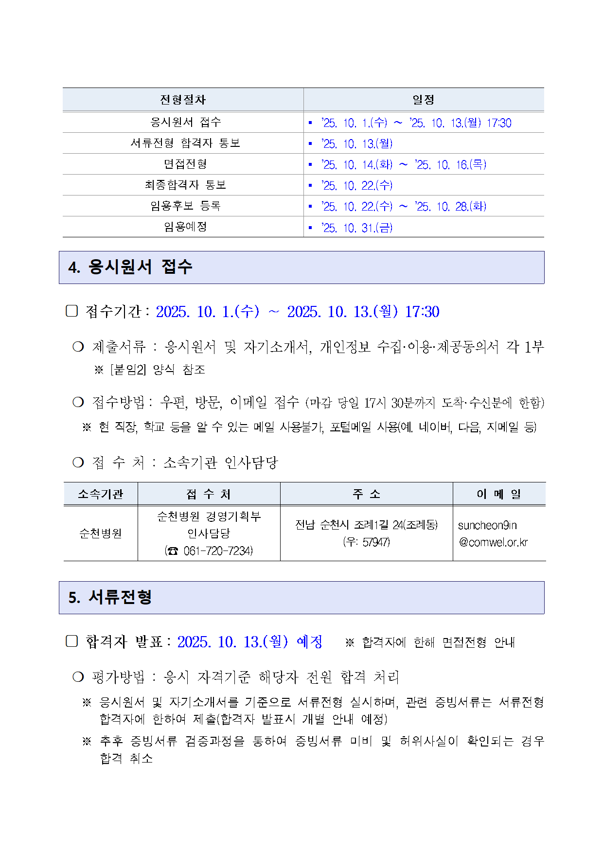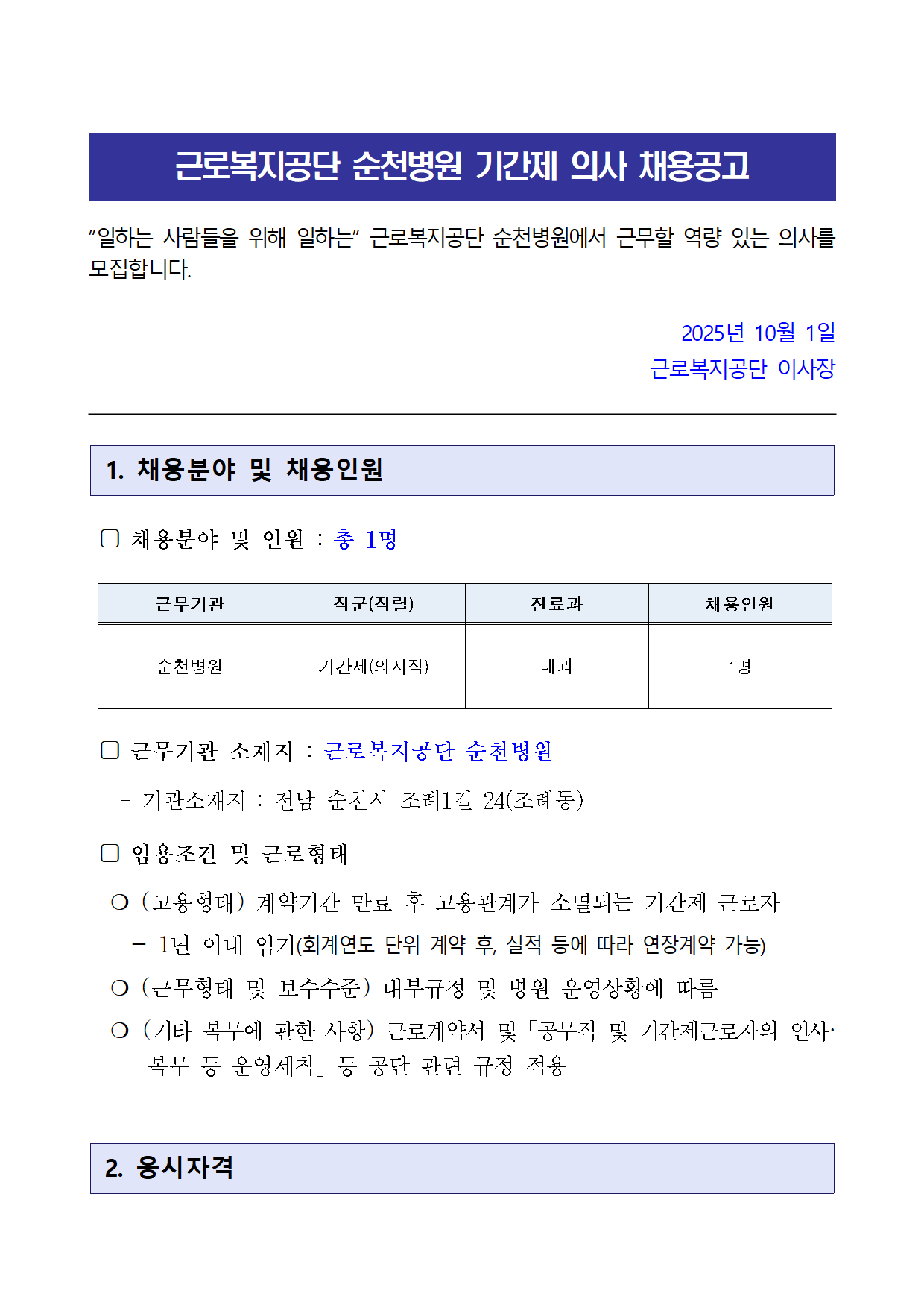 ±Ù·Îº¹Áö°ø´Ü ¼øÃµº´¿ø ±â°£Á¦ ÀÇ»ç ä¿ë°ø°í ¡±ÀÏÇÏ´Â »ç¶÷µéÀ» À§ÇØ ÀÏÇϴ¡± ±Ù·Îº¹Áö°ø´Ü ¼øÃµº´¿ø¿¡¼ ±Ù¹«ÇÒ ¿ª·® ÀÖ´Â Àǻ縦 ¸ðÁýÇÕ´Ï´Ù. 2025³â 10¿ù 1ÀÏ ±Ù·Îº¹Áö°ø´Ü ÀÌ»çÀå 1. ä¿ëºÐ¾ß ¹× ä¿ëÀοø ▢ ä¿ëºÐ¾ß ¹× Àοø : ÃÑ 1¸í ±Ù¹«±â°ü Á÷±º(Á÷·Ä) Áø·á°ú ä¿ëÀοø ¼øÃµº´¿ø ±â°£Á¦(ÀÇ»çÁ÷) ³»°ú 1¸í ▢ ±Ù¹«±â°ü ¼ÒÀçÁö : ±Ù·Îº¹Áö°ø´Ü ¼øÃµº´¿ø - ±â°ü¼ÒÀçÁö : Àü³² ¼øÃµ½Ã Á¶·Ê1±æ 24(Á¶·Êµ¿) ▢ ÀÓ¿ëÁ¶°Ç ¹× ±Ù·ÎÇüÅ ❍ (°í¿ëÇüÅÂ) °è¾à±â°£ ¸¸·á ÈÄ °í¿ë°ü°è°¡ ¼Ò¸êµÇ´Â ±â°£Á¦ ±Ù·ÎÀÚ - 1³â À̳» ÀÓ±â(ȸ°è¿¬µµ ´ÜÀ§ °è¾à ÈÄ, ½ÇÀû µî¿¡ µû¶ó ¿¬Àå°è¾à °¡´É) ❍ (±Ù¹«ÇüÅ ¹× º¸¼ö¼öÁØ) ³»ºÎ±ÔÁ¤ ¹× º´¿ø ¿î¿µ»óȲ¿¡ µû¸§ ❍ (±âŸ º¹¹«¿¡ °üÇÑ »çÇ×) ±Ù·Î°è¾à¼ ¹×¡¸°ø¹«Á÷ ¹× ±â°£Á¦±Ù·ÎÀÚÀÇ Àλ硤 º¹¹« µî ¿î¿µ¼¼Ä¢¡¹µî °ø´Ü °ü·Ã ±ÔÁ¤ Àû¿ë
