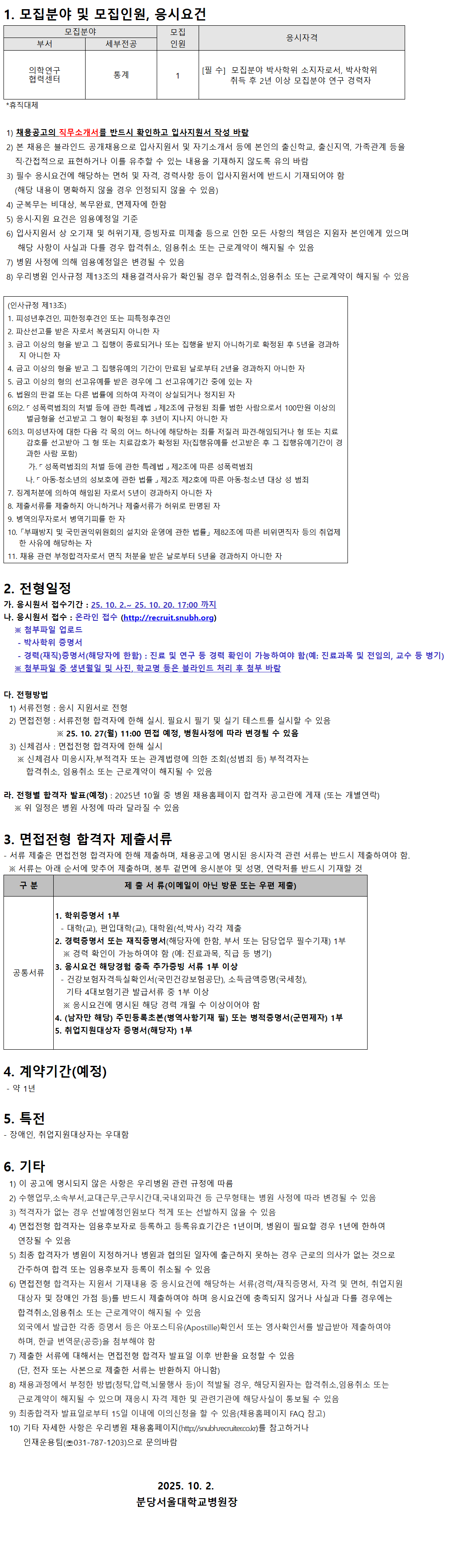 10) ±âŸ ÀÚ¼¼ÇÑ »çÇ×Àº ¿ì¸®º´¿ø ä¿ëȨÆäÀÌÁö(http://snubh.recruiter.co.kr)¸¦ Âü°íÇϰųª