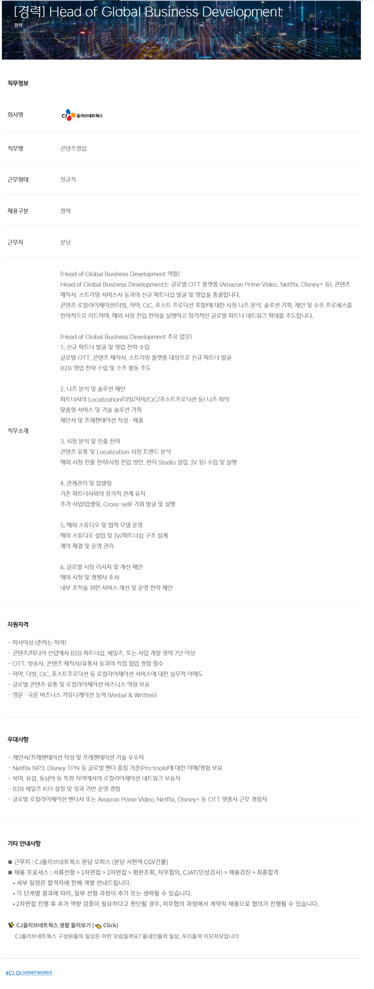 Head of Global Business Development´Â ±Û·Î¹ú OTT Ç÷§Æû (Amazon Prime Video, Netflix, Disney+ µî), ÄÜÅÙÃ÷ Á¦ÀÛ»ç, ½ºÆ®¸®¹Ö ¼ºñ½º»ç µî°úÀÇ ½Å±Ô ÆÄÆ®³Ê½Ê ¹ß±¼ ¹× ¿µ¾÷À» ÃѰýÇÕ´Ï´Ù.