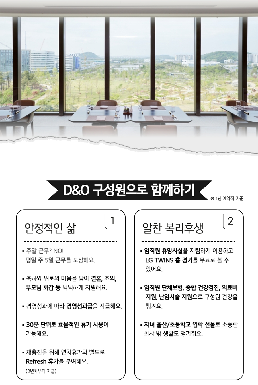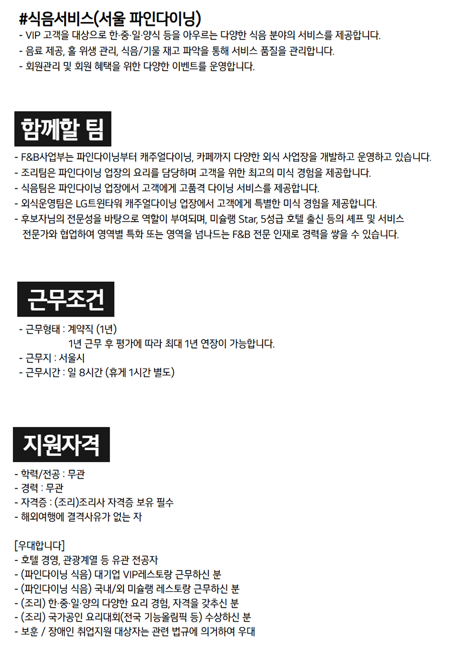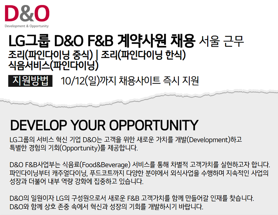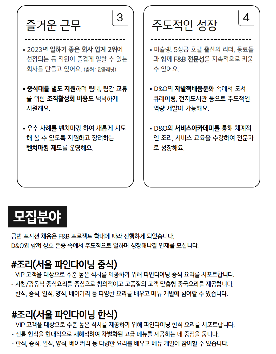 D&O Development & Opportunity LG±×·ì D&O F&B °è¾à»ç¿ø ä¿ë ¼­¿ï ±Ù¹« Á¶¸®(ÆÄÀδÙÀÌ´× Áß½Ä) Á¶¸®(ÆÄÀδÙÀÌ´× ÇѽÄ) ½ÄÀ½¼­ºñ½º(ÆÄÀδÙÀÌ´×) Áö¿ø¹æ¹ý 10/12(ÀÏ)±îÁö ä¿ë»çÀÌÆ® Áï½Ã Áö¿ø DEVELOP YOUR OPPORTUNITY LG±×·ìÀÇ ¼­ºñ½º Çõ½Å ±â¾÷ D&O´Â °í°´À» À§ÇÑ »õ·Î¿î °¡Ä¡¸¦ °³¹ß(Development)ÇÏ°í Æ¯º°ÇÑ °æÇèÀÇ ±âȸ(Opportunity)¸¦ Á¦°øÇÕ´Ï´Ù. D&O F&B»ç¾÷ºÎ´Â ½ÄÀ½·á(Food&Beverage) ¼­ºñ½º¸¦ ÅëÇØ Â÷º°Àû °í°´°¡Ä¡¸¦ ½ÇÇöÇϰíÀÚ ÇÕ´Ï´Ù. ÆÄÀδÙÀ̴׺ÎÅÍ Ä³ÁÖ¾ó´ÙÀÌ´×, ǪµåÄÚÆ®±îÁö ´Ù¾çÇÑ ºÐ¾ß¿¡¼­ ¿Ü½Ä»ç¾÷À» ¼öÇàÇϸç Áö¼ÓÀûÀÎ »ç¾÷ÀÇ ¼ºÀå°ú ´õºÒ¾î ³»ºÎ ¿ª·® °­È­¿¡ ÁýÁßÇϰí ÀÖ½À´Ï´Ù. D&OÀÇ ÀÏ¿øÀÌÀÚ LGÀÇ ±¸¼º¿øÀ¸·Î¼­ »õ·Î¿î F&B °í°´°¡Ä¡¸¦ ÇÔ²² ¸¸µé¾î°¥ ÀÎÀ縦 ã½À´Ï´Ù. D&O¿Í ÇÔ²² »óÈ£ Á¸Áß ¼Ó¿¡¼­ Çõ½Å°ú ¼ºÀåÀÇ ±âȸ¸¦ °³¹ßÇϽñ⠹ٶø´Ï´Ù. D&O ±¸¼º¿øÀ¸·Î ÇÔ²²ÇÏ±â ¡Ø 1³â °è¾àÁ÷ ±âÁØ I 2 ¾ÈÁ¤ÀûÀÎ »î ¾ËÂù º¹¸®ÈÄ»ý ¡á ÁÖ¸» ±Ù¹«? NO! ÀÓÁ÷¿ø ÈÞ¾ç½Ã¼³À» Àú·ÅÇÏ°Ô ÀÌ¿ëÇÏ°í ÆòÀÏ ÁÖ 5ÀÏ ±Ù¹«¸¦ º¸ÀåÇØ¿ä. LG TWINS Ȩ °æ±â¸¦ ¹«·á·Î º¼ ¼ö ÀÖ¾î¿ä. ¡¤ ÃàÇÏ¿Í À§·ÎÀÇ ¸¶À½À» ´ã¾Æ °áÈ¥, Á¶ÀÇ, ºÎ¸ð´Ô ȸ°© µî ³Ë³ËÇÏ°Ô Áö¿øÇØ¿ä. ¡á ÀÓÁ÷¿ø ´Üüº¸Çè, Á¾ÇÕ °Ç°­°ËÁø, ÀÇ·áºñ Áö¿ø, ³­Àӽüú Áö¿øÀ¸·Î ±¸¼º¿ø °Ç°­À» ¡¤ °æ¿µ¼º°ú¿¡ µû¶ó °æ¿µ¼º°ú±ÞÀ» Áö±ÞÇØ¿ä. ì°Ü¿ä. ¡¤ 30ºÐ ´ÜÀ§·Î È¿À²ÀûÀÎ ÈÞ°¡ »ç¿ëÀÌ ¡¤ ÀÚ³à Ãâ»ê/ÃʵîÇб³ ÀÔÇÐ ¼±¹°·Î ¼ÒÁßÇÑ °¡´ÉÇØ¿ä. ȸ»ç ¹Û »ýȰµµ ì°ÜÁà¿ä. ¡¤ ÀçÃæÀüÀ» À§ÇØ ¿¬Â÷ÈÞ°¡¿Í º°µµ·Î Refresh ÈÞ°¡¸¦ ºÎ¿©ÇØ¿ä. (2³âÂ÷ºÎÅÍ Áö±Þ) 3 4 Áñ°Å¿î ±Ù¹« ÁÖµµÀûÀÎ ¼ºÀå 2023³â ÀÏÇϱâ ÁÁÀº ȸ»ç ¾÷°è 2À§¿¡ ¡á ¹Ì½¶·©, 5¼º±Þ È£ÅÚ Ãâ½ÅÀÇ ¸®´õ, µ¿·áµé ¼±Á¤µÇ´Â µî Á÷¿øÀÌ Áñ°Ì°Ô ÀÏÇÒ ¼ö ÀÖ´Â °ú ÇÔ²² F&B Àü¹®¼ºÀ» Áö¼ÓÀûÀ¸·Î Ű¿ï ȸ»ç¸¦ ¸¸µé°í ÀÖ¾î¿ä. (Ãâó : ÀâÇ÷¡´Ö) ¼ö ÀÖ¾î¿ä. ¡áÁ߽Ĵ븦 º°µµ Áö¿øÇÏ¸ç ÆÀ³», ÆÀ°£ ±³·ù D&OÀÇ ÀÚ¹ßÀû¹è¿ò¹®È­ ¼Ó¿¡¼­ µµ¼­ ¸¦ À§ÇÑ Á¶Á÷Ȱ¼ºÈ­ ºñ¿ëµµ ³Ë³ËÇÏ°Ô Å¥·¹ÀÌÆÃ, ÀüÀÚµµ¼­°ü µîÀ¸·Î ÁÖµµÀûÀÎ Áö¿øÇØ¿ä. ¿ª·® °³¹ßÀÌ °¡´ÉÇØ¿ä. ¡á¿ì¼ö »ç·Ê¸¦ º¥Ä¡¸¶Å· ÇÏ¿© »õ·Ó°Ô ½Ãµµ D&OÀÇ ¼­ºñ½º¾ÆÄ«µ¥¹Ì¸¦ ÅëÇØ ü°èÀû ÇØ º¼ ¼ö ÀÖµµ·Ï Áö¿øÇϰí Àå·ÁÇÏ´Â ÀÎ Á¶¸®, ¼­ºñ½º ±³À°À» ¼ö°­ÇÏ¿© Àü¹®°¡ º¥Ä¡¸¶Å· Á¦µµ¸¦ ¿î¿µÇØ¿ä. ·Î ¼ºÀåÇØ¿ä. ¸ðÁýºÐ¾ß ±Ý¹ø Æ÷Áö¼Ç ä¿ëÀº F&B ÇÁ·ÎÁ§Æ® È®´ë¿¡ µû¶ó ÁøÇàÇÏ°Ô µÇ¾ú½À´Ï´Ù. D&O¿Í ÇÔ²² »óÈ£ Á¸Áß ¼Ó¿¡¼­ ÁÖµµÀûÀ¸·Î ÀÏÇÏ¸ç ¼ºÀåÇØ³ª°¥ ÀÎÀ縦 ¸ð½Ê´Ï´Ù. #Á¶¸®(¼­¿ï ÆÄÀδÙÀÌ´× Áß½Ä) - VIP °í°´À» ´ë»óÀ¸·Î ¼öÁØ ³ôÀº ½Ä»ç¸¦ Á¦°øÇϱâ À§ÇØ ÆÄÀδÙÀÌ´× Áᫎ ¿ä¸®¸¦ ¼­Æ÷Æ®ÇÕ´Ï´Ù. - »çõ/±¤µ¿½Ä Á߽Ŀ丮¸¦ Áß½ÉÀ¸·Î âÀÇÀûÀÌ°í °íǰÁúÀÇ °í°´ ¸ÂÃãÇü Áß±¹¿ä¸®¸¦ Á¦°øÇÕ´Ï´Ù. - ÇѽÄ, Áß½Ä, ÀϽÄ, ¾ç½Ä, º£ÀÌÄ¿¸® µî ´Ù¾çÇÑ ¿ä¸®¸¦ ¹è¿ì°í ¸Þ´º °³¹ß¿¡ Âü¿©ÇÒ ¼ö ÀÖ½À´Ï´Ù. #Á¶¸®(¼­¿ï ÆÄÀδÙÀÌ´× ÇѽÄ) - VIP °í°´À» ´ë»óÀ¸·Î ¼öÁØ ³ôÀº ½Ä»ç¸¦ Á¦°øÇϱâ À§ÇØ ÆÄÀδÙÀÌ´× ÇÑ½Ä ¿ä¸®¸¦ ¼­Æ÷Æ®ÇÕ´Ï´Ù. - ÀüÅë ÇѽÄÀ» Çö´ëÀûÀ¸·Î ÀçÇØ¼®ÇÏ¿© Â÷º°È­µÈ °í±Þ ¸Þ´º¸¦ Á¦°øÇÏ´Â µ¥ ÁßÁ¡À» µÓ´Ï´Ù. - ÇѽÄ, Áß½Ä, ÀϽÄ, ¾ç½Ä, º£ÀÌÄ¿¸® µî ´Ù¾çÇÑ ¿ä¸®¸¦ ¹è¿ì°í ¸Þ´º °³¹ß¿¡ Âü¿©ÇÒ ¼ö ÀÖ½À´Ï´Ù. #½ÄÀ½¼­ºñ½º(¼­¿ï ÆÄÀδÙÀÌ´×) - VIP °í°´À» ´ë»óÀ¸·Î ÇÑ¡¤Áß¡¤ÀÏ¡¤¾ç½Ä µîÀ» ¾Æ¿ì¸£´Â ´Ù¾çÇÑ ½ÄÀ½ ºÐ¾ßÀÇ ¼­ºñ½º¸¦ Á¦°øÇÕ´Ï´Ù. - À½·á Á¦°ø, Ȧ À§»ý °ü¸®, ½ÄÀ½/±â¹° Àç°í ÆÄ¾ÇÀ» ÅëÇØ ¼­ºñ½º ǰÁúÀ» °ü¸®ÇÕ´Ï´Ù. - ȸ¿ø°ü¸® ¹× ȸ¿ø ÇýÅÃÀ» À§ÇÑ ´Ù¾çÇÑ À̺¥Æ®¸¦ ¿î¿µÇÕ´Ï´Ù. ÇÔ²²ÇÒ ÆÀ - F&B»ç¾÷ºÎ´Â ÆÄÀδÙÀ̴׺ÎÅÍ Ä³ÁÖ¾ó´ÙÀÌ´×, Ä«Æä±îÁö ´Ù¾çÇÑ ¿Ü½Ä »ç¾÷ÀåÀ» °³¹ßÇÏ°í ¿î¿µÇϰí ÀÖ½À´Ï´Ù. - Á¶¸®ÆÀÀº ÆÄÀδÙÀÌ´× ¾÷ÀåÀÇ ¿ä¸®¸¦ ´ã´çÇÏ¸ç °í°´À» À§ÇÑ ÃÖ°íÀÇ ¹Ì½Ä °æÇèÀ» Á¦°øÇÕ´Ï´Ù. - ½ÄÀ½ÆÀÀº ÆÄÀδÙÀÌ´× ¾÷Àå¿¡¼­ °í°´¿¡°Ô °íǰ°Ý ´ÙÀÌ´× ¼­ºñ½º¸¦ Á¦°øÇÕ´Ï´Ù. - ¿Ü½Ä¿î¿µÆÀÀº LGÆ®À©Å¸¿ö ijÁÖ¾ó´ÙÀÌ´× ¾÷Àå¿¡¼­ °í°´¿¡°Ô Ưº°ÇÑ ¹Ì½Ä °æÇèÀ» Á¦°øÇÕ´Ï´Ù. - Èĺ¸ÀÚ´ÔÀÇ Àü¹®¼ºÀ» ¹ÙÅÁÀ¸·Î ¿ªÇÒÀÌ ºÎ¿©µÇ¸ç, ¹Ì½¶·© Star, 5¼º±Þ È£ÅÚ Ãâ½Å µîÀÇ ¼ÎÇÁ ¹× ¼­ºñ½º Àü¹®°¡¿Í Çù¾÷ÇÏ¿© ¿µ¿ªº° Ưȭ ¶Ç´Â ¿µ¿ªÀ» ³Ñ³ªµå´Â F&B Àü¹® ÀÎÀç·Î °æ·ÂÀ» ½×À» ¼ö ÀÖ½À´Ï´Ù. ±Ù¹«Á¶°Ç - ±Ù