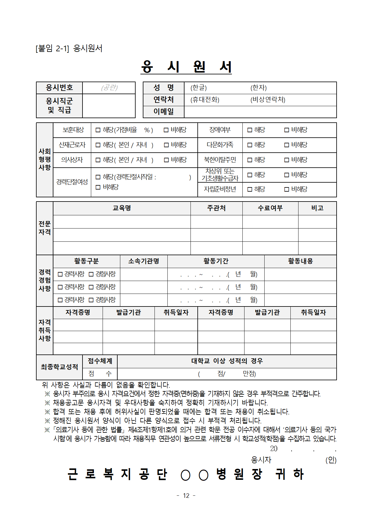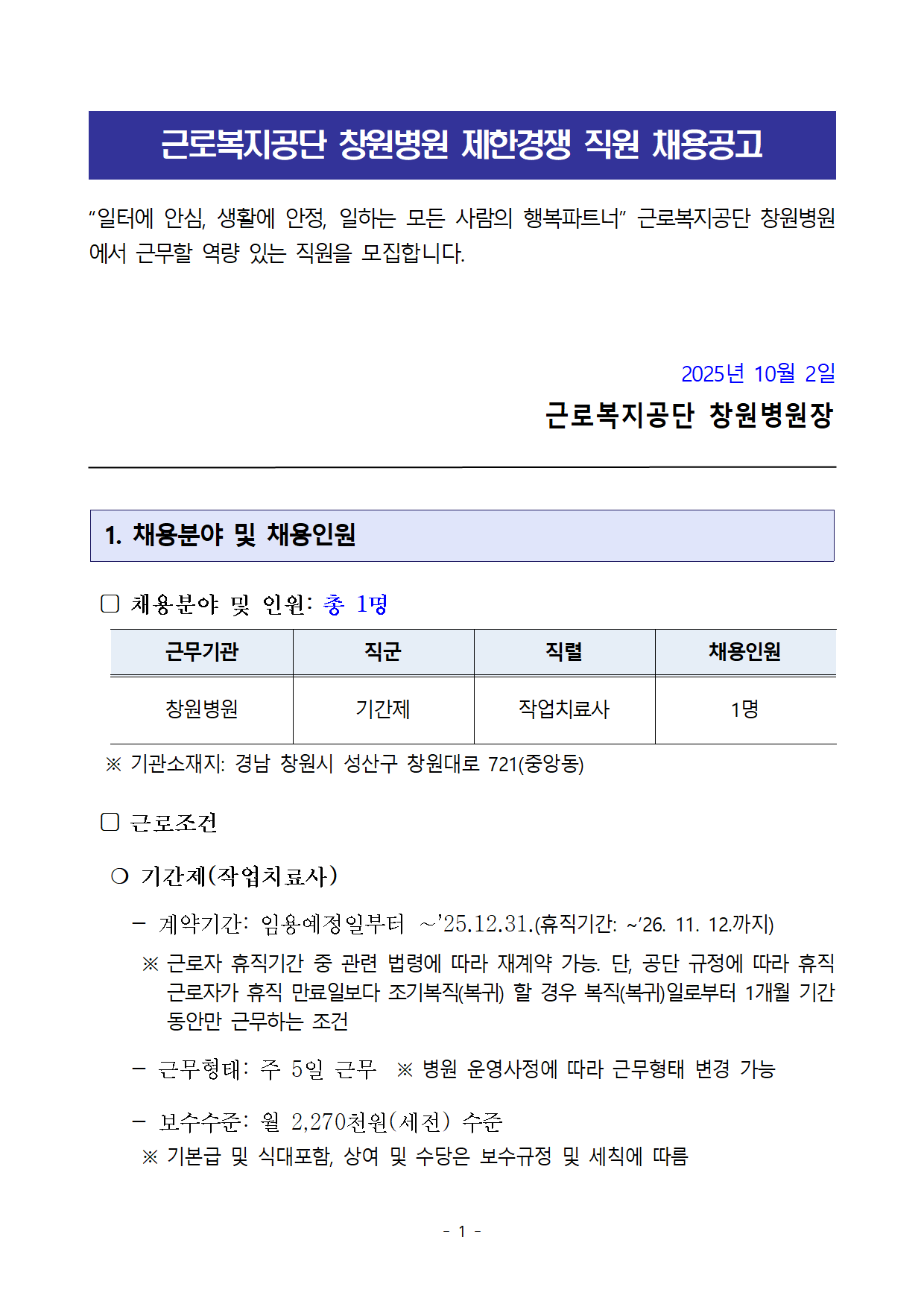 ¡°ÀÏÅÍ¿¡ ¾È½É, »ýȰ¿¡ ¾ÈÁ¤, ÀÏÇÏ´Â ¸ðµç »ç¶÷ÀÇ ÇູÆÄÆ®³Ê¡± ±Ù·Îº¹Áö°ø´Ü â¿øº´¿ø ¿¡¼ ±Ù¹«ÇÒ ¿ª·® ÀÖ´Â Á÷¿øÀ» ¸ðÁýÇÕ´Ï´Ù. 2025³â 10¿ù 2ÀÏ ±Ù·Îº¹Áö°ø´Ü â¿øº´¿øÀå 1. ä¿ëºÐ¾ß ¹× ä¿ëÀοø ▢ ä¿ëºÐ¾ß ¹× Àοø: ÃÑ 1¸í ±Ù¹«±â°ü Á÷±º Á÷·Ä ä¿ëÀοø â¿øº´¿ø ±â°£Á¦ ÀÛ¾÷Ä¡·á»ç 1¸í ¡Ø ±â°ü¼ÒÀçÁö: °æ³² â¿ø½Ã ¼º»ê±¸ â¿ø´ë·Î 721(Áß¾Óµ¿) ▢ ±Ù·ÎÁ¶°Ç ❍ ±â°£Á¦(ÀÛ¾÷Ä¡·á»ç) - °è¾à±â°£: Àӿ뿹Á¤ÀϺÎÅÍ ¡¡¯25.12.31.(ÈÞÁ÷±â°£: ¡¡¯26. 11. 12.±îÁö) ¡Ø ±Ù·ÎÀÚ ÈÞÁ÷±â°£ Áß °ü·Ã ¹ý·É¿¡ µû¶ó Àç°è¾à °¡´É. ´Ü, °ø´Ü ±ÔÁ¤¿¡ µû¶ó ÈÞÁ÷ ±Ù·ÎÀÚ°¡ ÈÞÁ÷ ¸¸·áÀϺ¸´Ù Á¶±âº¹Á÷(º¹±Í) ÇÒ °æ¿ì º¹Á÷(º¹±Í)ÀϷκÎÅÍ 1°³¿ù ±â°£ µ¿¾È¸¸ ±Ù¹«ÇÏ´Â Á¶°Ç - ±Ù¹«ÇüÅÂ: ÁÖ 5ÀÏ ±Ù¹« ¡Ø º´¿ø ¿î¿µ»çÁ¤¿¡ µû¶ó ±Ù¹«ÇüÅ º¯°æ °¡´É - º¸¼ö¼öÁØ: ¿ù 2,270õ¿ø(¼¼Àü) ¼öÁØ ¡Ø ±âº»±Þ ¹× ½Ä´ëÆ÷ÇÔ, »ó¿© ¹× ¼ö´çÀº º¸¼ö±ÔÁ¤ ¹× ¼¼Ä¢¿¡ µû¸§