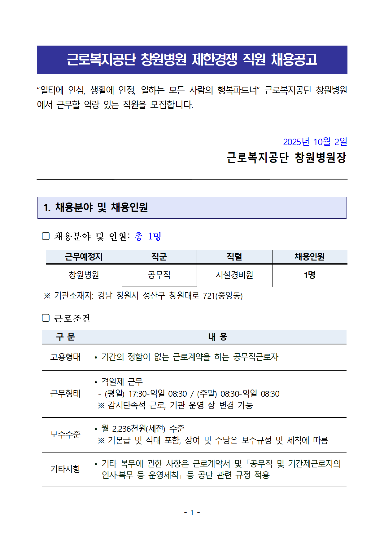 ¡°ÀÏÅÍ¿¡ ¾È½É, »ýȰ¿¡ ¾ÈÁ¤, ÀÏÇÏ´Â ¸ðµç »ç¶÷ÀÇ ÇູÆÄÆ®³Ê¡± ±Ù·Îº¹Áö°ø´Ü â¿øº´¿ø ¿¡¼ ±Ù¹«ÇÒ ¿ª·® ÀÖ´Â Á÷¿øÀ» ¸ðÁýÇÕ´Ï´Ù. 2025³â 10¿ù 2ÀÏ ±Ù·Îº¹Áö°ø´Ü â¿øº´¿øÀå 1. ä¿ëºÐ¾ß ¹× ä¿ëÀοø ▢ ä¿ëºÐ¾ß ¹× Àοø: ÃÑ 1¸í ±Ù¹«¿¹Á¤Áö Á÷±º Á÷·Ä ä¿ëÀοø â¿øº´¿ø °ø¹«Á÷ ½Ã¼³°æºñ¿ø 1¸í ¡Ø ±â°ü¼ÒÀçÁö: °æ³² â¿ø½Ã ¼º»ê±¸ â¿ø´ë·Î 721(Áß¾Óµ¿) ▢ ±Ù·ÎÁ¶°Ç ±¸ ºÐ ³» ¿ë °í¿ëÇüÅ • ±â°£ÀÇ Á¤ÇÔÀÌ ¾ø´Â ±Ù·Î°è¾àÀ» ÇÏ´Â °ø¹«Á÷±Ù·ÎÀÚ ±Ù¹«ÇüÅ • °ÝÀÏÁ¦ ±Ù¹« - (ÆòÀÏ) 17:30-ÀÍÀÏ 08:30 / (ÁÖ¸») 08:30-ÀÍÀÏ 08:30 ¡Ø °¨½Ã´Ü¼ÓÀû ±Ù·Î, ±â°ü ¿î¿µ »ó º¯°æ °¡´É º¸¼ö¼öÁØ • ¿ù 2,236õ¿ø(¼¼Àü) ¼öÁØ ¡Ø ±âº»±Þ ¹× ½Ä´ë Æ÷ÇÔ, »ó¿© ¹× ¼ö´çÀº º¸¼ö±ÔÁ¤ ¹× ¼¼Ä¢¿¡ µû¸§ ±âŸ»çÇ× • ±âŸ º¹¹«¿¡ °üÇÑ »çÇ×Àº ±Ù·Î°è¾à¼ ¹× ¡¸°ø¹«Á÷ ¹× ±â°£Á¦±Ù·ÎÀÚÀÇ Àλ硤º¹¹« µî ¿î¿µ¼¼Ä¢¡¹ µî °ø´Ü °ü·Ã ±ÔÁ¤ Àû¿ë