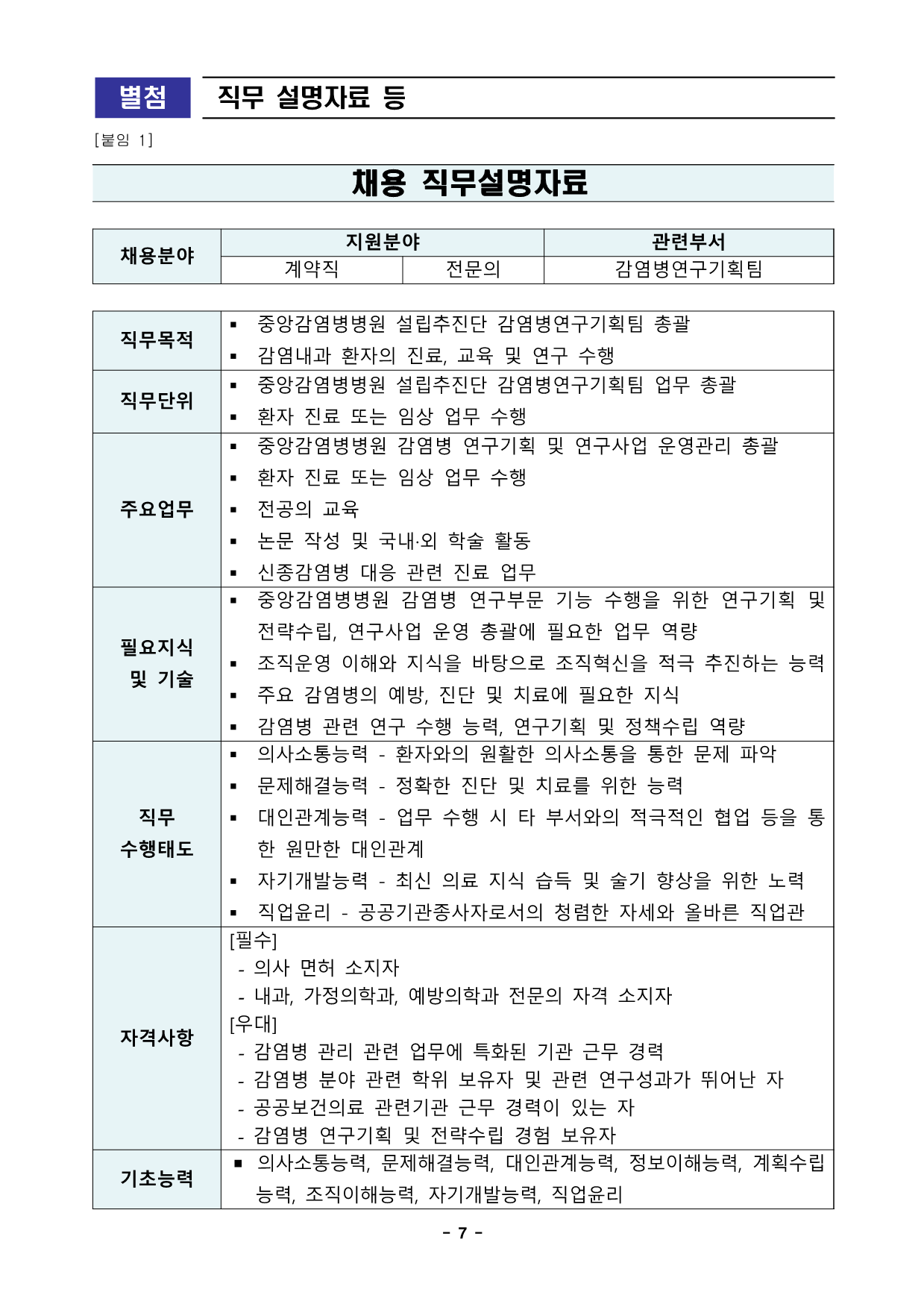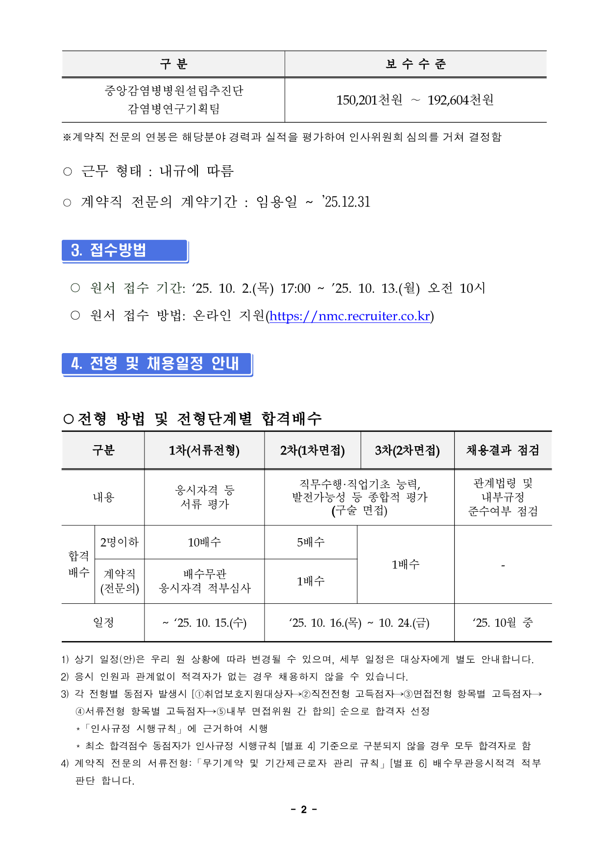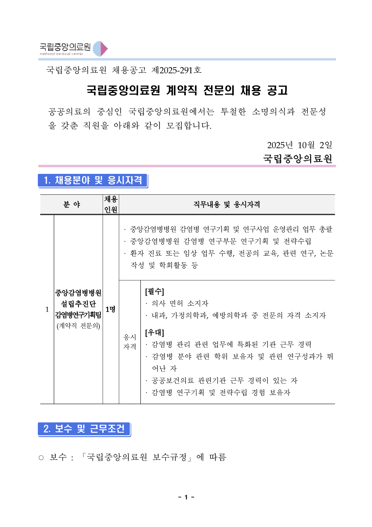 ±¹¸³Áß¾ÓÀÇ·á¿ø ä¿ë°ø°í Á¦2025-291È£ ±¹¸³Áß¾ÓÀÇ·á¿ø °è¾àÁ÷ Àü¹®ÀÇ Ã¤¿ë °ø°í °ø°øÀÇ·áÀÇ Áß½ÉÀÎ ±¹¸³Áß¾ÓÀÇ·á¿ø¿¡¼´Â ÅõöÇÑ ¼Ò¸íÀǽİú Àü¹®¼ºÀ» °®Ãá Á÷¿øÀ» ¾Æ·¡¿Í °°ÀÌ ¸ðÁýÇÕ´Ï´Ù. 2025³â 10¿ù 2Àϱ¹¸³Áß¾ÓÀÇ·á¿ø1. ä¿ëºÐ¾ß ¹× ÀÀ½ÃÀÚ°Ý 2. º¸¼ö ¹× ±Ù¹«Á¶°Ç ¡Û º¸¼ö : ¡¸±¹¸³Áß¾ÓÀÇ·á¿ø º¸¼ö±ÔÁ¤¡¹¿¡ µû¸§ ºÐ ¾ß ä¿ë Àοø Á÷¹«³»¿ë ¹× ÀÀ½ÃÀÚ°Ý 1 Áß¾Ó°¨¿°º´º´¿ø ¼³¸³ÃßÁø´Ü °¨¿°º´¿¬±¸±âȹÆÀ (°è¾àÁ÷ Àü¹®ÀÇ) 1¸í ¡¤ Áß¾Ó°¨¿°º´º´¿ø °¨¿°º´ ¿¬±¸±âȹ ¹× ¿¬±¸»ç¾÷ ¿î¿µ°ü¸® ¾÷¹« ÃѰý¡¤ Áß¾Ó°¨¿°º´º´¿ø °¨¿°º´ ¿¬±¸ºÎ¹® ¿¬±¸±âȹ ¹× Àü·«¼ö¸³ ¡¤ ȯÀÚ Áø·á ¶Ç´Â ÀÓ»ó ¾÷¹« ¼öÇà, Àü°øÀÇ ±³À°, °ü·Ã ¿¬±¸, ³í¹®ÀÛ¼º ¹× ÇÐȸȰµ¿ µî ÀÀ½Ã ÀÚ°Ý [Çʼö] ¡¤ ÀÇ»ç ¸éÇã ¼ÒÁöÀÚ ¡¤ ³»°ú, °¡Á¤ÀÇÇаú, ¿¹¹æÀÇÇаú Áß Àü¹®ÀÇ ÀÚ°Ý ¼ÒÁöÀÚ[¿ì´ë] ¡¤ °¨¿°º´ °ü¸® °ü·Ã ¾÷¹«¿¡ Æ¯ÈµÈ ±â°ü ±Ù¹« °æ·Â ¡¤ °¨¿°º´ ºÐ¾ß °ü·Ã ÇÐÀ§ º¸À¯ÀÚ ¹× °ü·Ã ¿¬±¸¼º°ú°¡ ¶Ù¾î³ ÀÚ ¡¤ °ø°øº¸°ÇÀÇ·á °ü·Ã±â°ü ±Ù¹« °æ·ÂÀÌ ÀÖ´Â ÀÚ ¡¤ °¨¿°º´ ¿¬±¸±âȹ ¹× Àü·«¼ö¸³ °æÇè º¸À¯ÀÚ