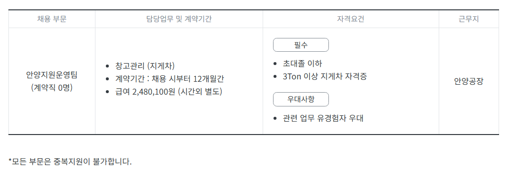 ¸ðÁý ºÎ¹® ¹× ³»¿ë ä¿ë ºÎ¹® ´ã´ç¾÷¹« ¹× °è¾à±â°£ ÀÚ°Ý¿ä°Ç ±Ù¹«Áö ¾È¾çÁö¿ø¿î¿µÆÀ (°è¾àÁ÷ 0¸í) â°í°ü¸® (Áö°ÔÂ÷) °è¾à±â°£ : ä¿ë ½ÃºÎÅÍ 12°³¿ù°£ ±Þ¿© 2,480,100¿ø (½Ã°£¿Ü º°µµ) Çʼö ÃÊ´ëÁ¹ ÀÌÇÏ 3Ton ÀÌ»ó Áö°ÔÂ÷ ÀÚ°ÝÁõ ¿ì´ë»çÇ× °ü·Ã ¾÷¹« À¯°æÇèÀÚ ¿ì´ë ¾È¾ç°øÀå *¸ðµç ºÎ¹®Àº Áߺ¹Áö¿øÀÌ ºÒ°¡ÇÕ´Ï´Ù.