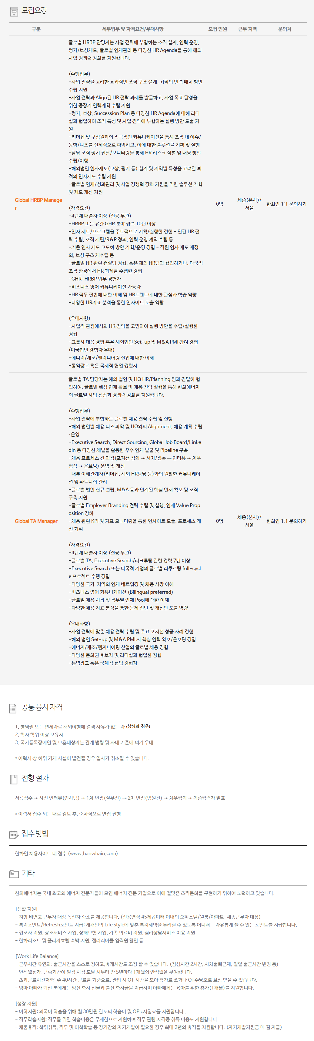 Global TA Manager ±Û·Î¹ú TA ´ã´çÀÚ´Â ÇØ¿Ü ¹ýÀÎ ¹× HQ HR/Planning ÆÀ°ú ±ä¹ÐÈ÷ Çù¾÷ÇÏ¿©, ±Û·Î¹ú ÇÙ½É ÀÎÀç È®º¸ ¹× ä¿ë Àü·« ½ÇÇàÀ» ÅëÇØ ÇÑÈ¿¡³ÊÁöÀÇ ±Û·Î¹ú »ç¾÷ ¼ºÀå°ú °æÀï·Â °È¸¦ Áö¿øÇÕ´Ï´Ù.