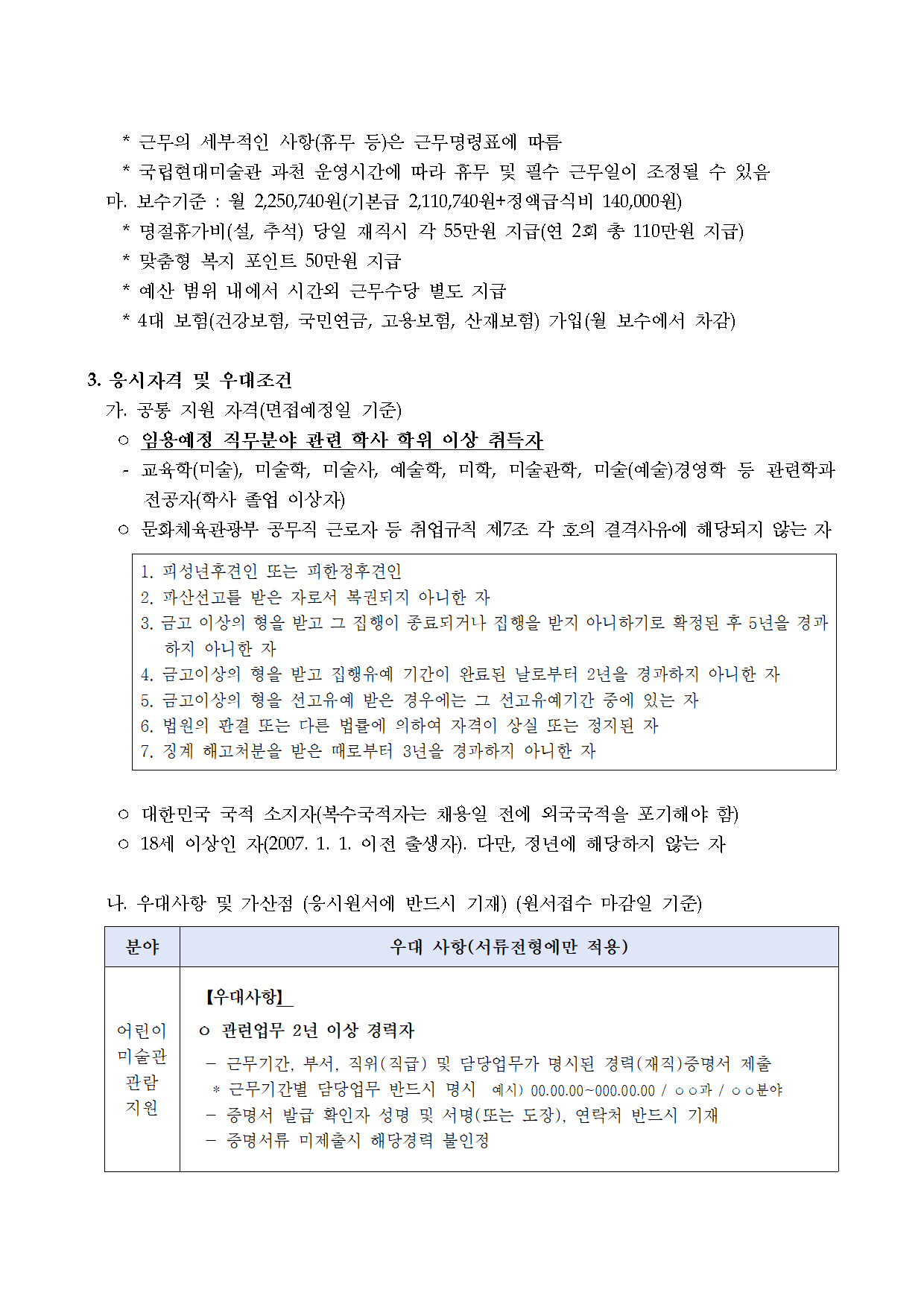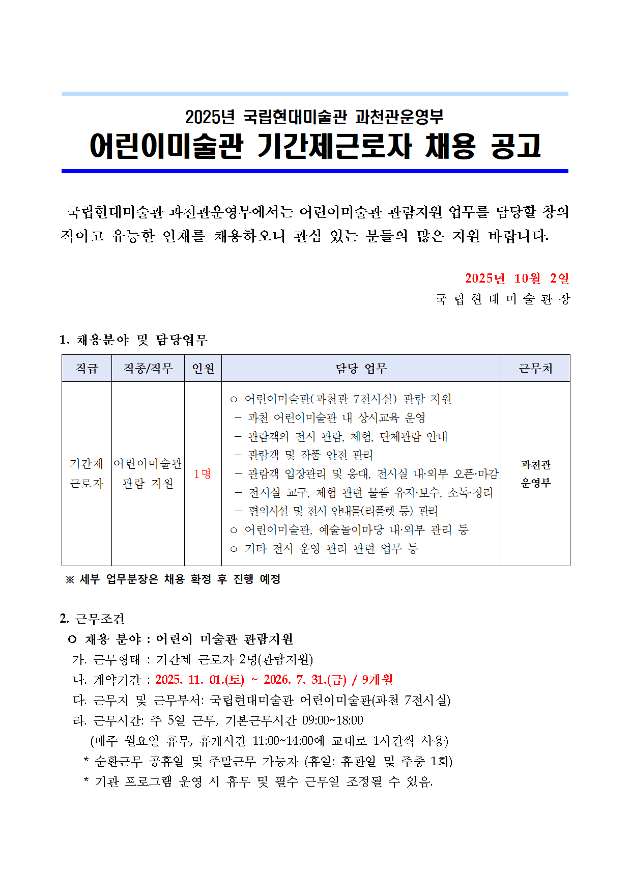 2025³â ±¹¸³Çö´ë¹Ì¼ú°ü °úõ°ü¿î¿µºÎ ¾î¸°À̹̼ú°ü ±â°£Á¦±Ù·ÎÀÚ Ã¤¿ë °ø°í ±¹¸³Çö´ë¹Ì¼ú°ü °úõ°ü¿î¿µºÎ¿¡¼´Â ¾î¸°À̹̼ú°ü °ü¶÷Áö¿ø ¾÷¹«¸¦ ´ã´çÇÒ Ã¢ÀÇ ÀûÀ̰í À¯´ÉÇÑ ÀÎÀ縦 ä¿ëÇÏ¿À´Ï °ü½É ÀÖ´Â ºÐµéÀÇ ¸¹Àº Áö¿ø ¹Ù¶ø´Ï´Ù. 2025³â 10¿ù 2ÀÏ ±¹ ¸³ Çö ´ë ¹Ì ¼ú °ü Àå 1. ä¿ëºÐ¾ß ¹× ´ã´ç¾÷¹« Á÷±Þ Á÷Á¾/Á÷¹« Àοø ´ã´ç ¾÷¹« ±Ù¹«Ã³ ±â°£Á¦ ±Ù·ÎÀÚ ¾î¸°À̹̼ú°ü °ü¶÷ Áö¿ø 1¸í ¤· ¾î¸°À̹̼ú°ü(°úõ°ü 7Àü½Ã½Ç) °ü¶÷ Áö¿ø - °úõ ¾î¸°À̹̼ú°ü ³» »ó½Ã±³À° ¿î¿µ - °ü¶÷°´ÀÇ Àü½Ã °ü¶÷, üÇè, ´Üü°ü¶÷ ¾È³» - °ü¶÷°´ ¹× ÀÛǰ ¾ÈÀü °ü¸® - °ü¶÷°´ ÀÔÀå°ü¸® ¹× ÀÀ´ë, Àü½Ã½Ç ³»¡¤¿ÜºÎ ¿ÀÇ¡¤¸¶°¨ - Àü½Ã½Ç ±³±¸, üÇè °ü·Ã ¹°Ç° À¯Áö¡¤º¸¼ö, ¼Òµ¶¡¤Á¤¸® - ÆíÀǽü³ ¹× Àü½Ã ¾È³»¹°(¸®Ç÷¿ µî) °ü¸® ¤· ¾î¸°À̹̼ú°ü, ¿¹¼ú³îÀ̸¶´ç ³»¡¤¿ÜºÎ °ü¸® µî ¤· ±âŸ Àü½Ã ¿î¿µ °ü¸® °ü·Ã ¾÷¹« µî °úõ°ü ¿î¿µºÎ ¡Ø ¼¼ºÎ ¾÷¹«ºÐÀåÀº ä¿ë È®Á¤ ÈÄ ÁøÇà ¿¹Á¤