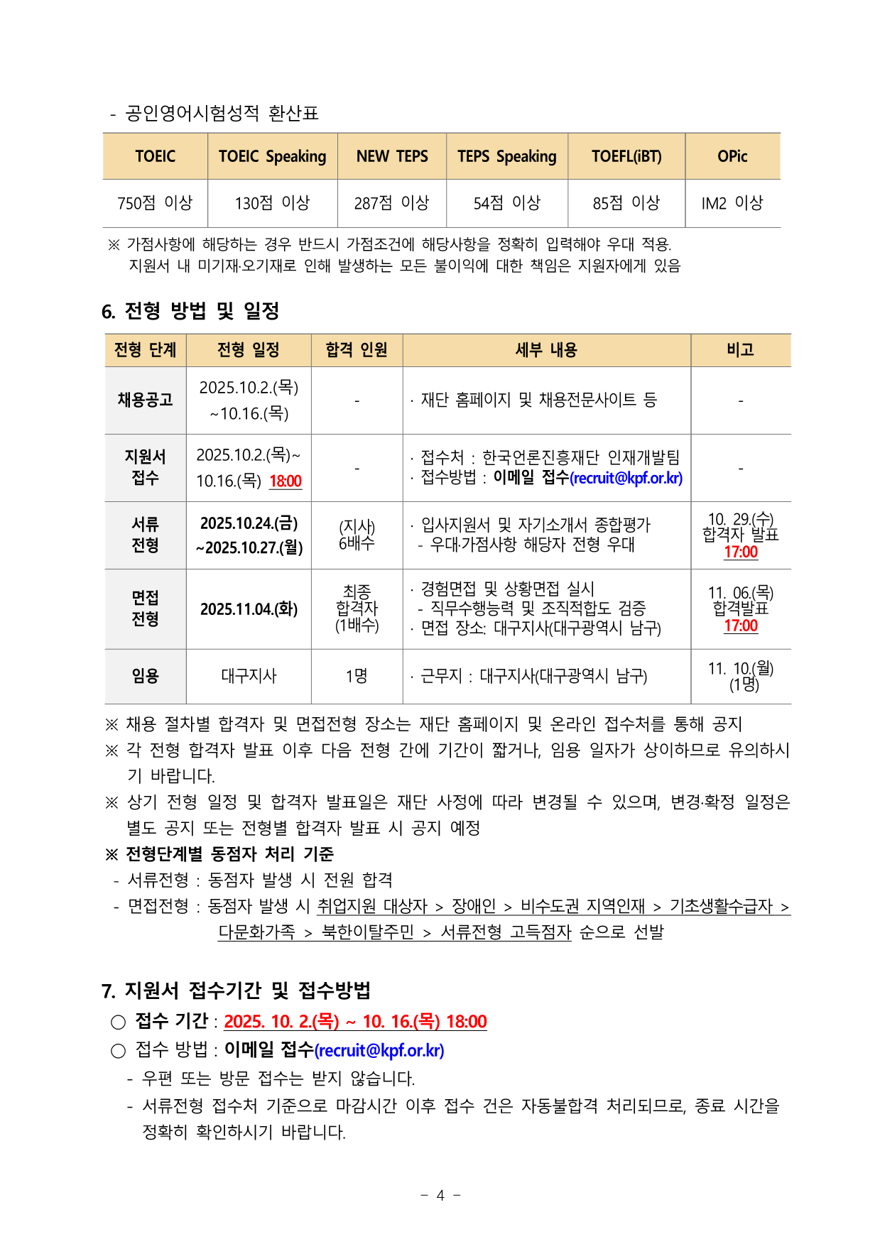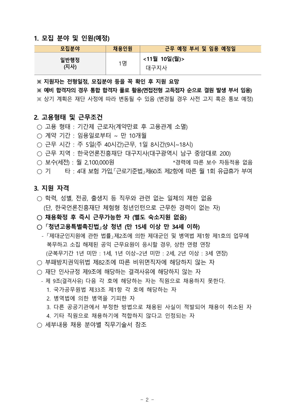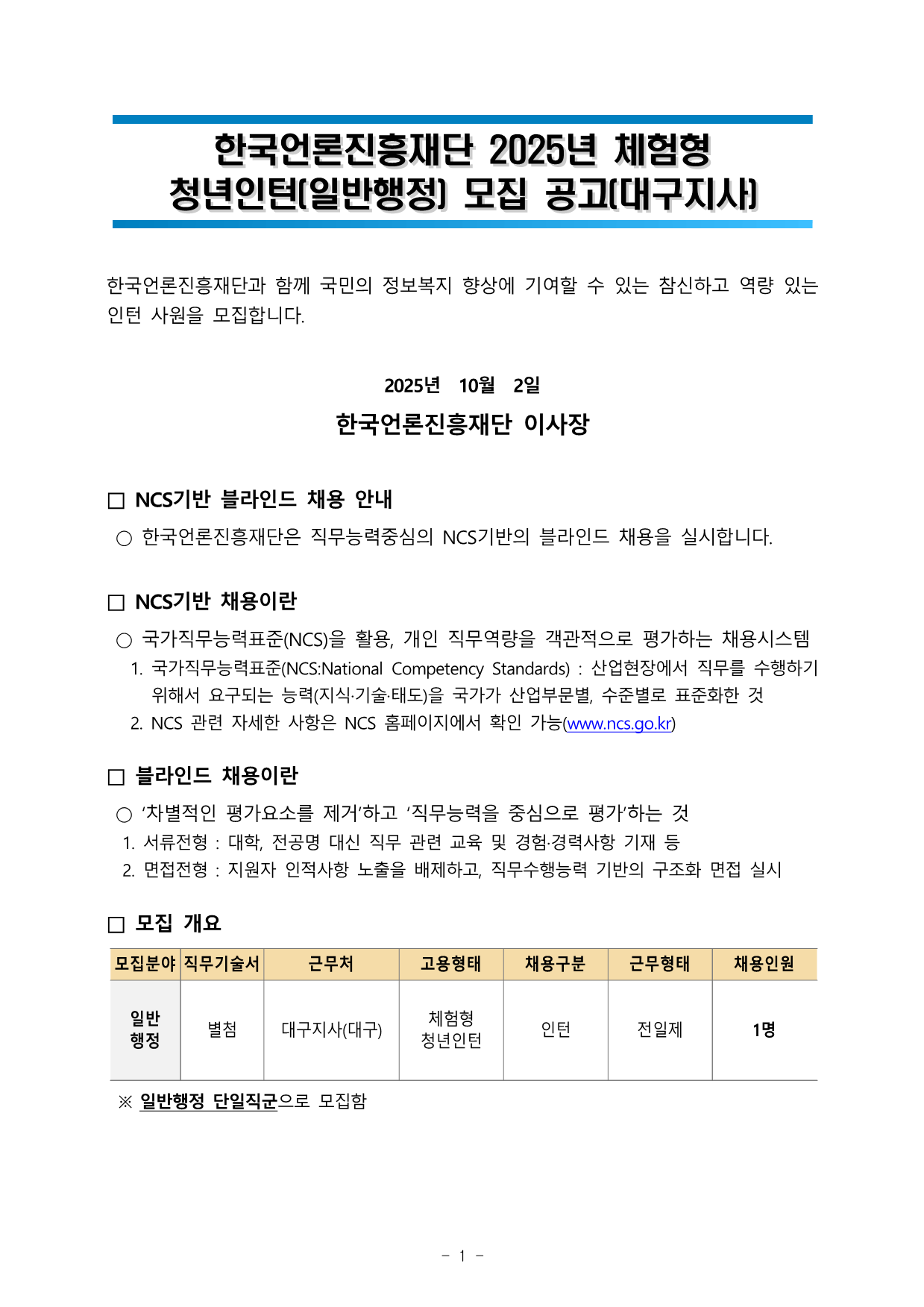 Çѱ¹¾ð·ÐÁøÈïÀç´Ü 2025³â üÇèÇü û³âÀÎÅÏ Ã»³âÀÎÅÏ((ÀϹÝÇàÁ¤ ÀϹÝÇàÁ¤) ) ¸ðÁý ¸ðÁý °ø°í°ø°í((´ë±¸Áö»ç´ë±¸Áö»ç)) ․ Çѱ¹¾ð·ÐÁøÈïÀç´Ü°ú ÇÔ²² ±¹¹ÎÀÇ Á¤º¸º¹Áö Çâ»ó¿¡ ±â¿©ÇÒ ¼ö ÀÖ´Â Âü½ÅÇÏ°í ¿ª·® ÀÖ´Â ÀÎÅÏ »ç¿øÀ» ¸ðÁýÇÕ´Ï´Ù. 2025³â 10¿ù 2ÀÏ Çѱ¹¾ð·ÐÁøÈïÀç´Ü ÀÌ»çÀå ¡à NCS±â¹Ý ºí¶óÀεå ä¿ë ¾È³» ¡Û Çѱ¹¾ð·ÐÁøÈïÀç´ÜÀº Á÷¹«´É·ÂÁß½ÉÀÇ NCS±â¹ÝÀÇ ºí¶óÀεå ä¿ëÀ» ½Ç½ÃÇÕ´Ï´Ù. ¡à NCS±â¹Ý ä¿ëÀ̶õ ¡Û ±¹°¡Á÷¹«´É·ÂÇ¥ÁØ(NCS)À» Ȱ¿ë, °³ÀÎ Á÷¹«¿ª·®À» °´°üÀûÀ¸·Î Æò°¡Çϴ ä¿ë½Ã½ºÅÛ 1. ±¹°¡Á÷¹«´É·ÂÇ¥ÁØ(NCS:National Competency Standards) : »ê¾÷ÇöÀå¿¡¼ Á÷¹«¸¦ ¼öÇàÇϱâ À§Çؼ ¿ä±¸µÇ´Â ´É·Â(Áö½Ä¡¤±â¼ú¡¤Åµµ)À» ±¹°¡°¡ »ê¾÷ºÎ¹®º°, ¼öÁغ°·Î Ç¥ÁØÈÇÑ °Í 2. NCS °ü·Ã ÀÚ¼¼ÇÑ »çÇ×Àº NCS ȨÆäÀÌÁö¿¡¼ È®ÀÎ °¡´É(www.ncs.go.kr) ¡à ºí¶óÀεå ä¿ëÀ̶õ ¡Û ¡®Â÷º°ÀûÀÎ Æò°¡¿ä¼Ò¸¦ Á¦°Å¡¯ÇÏ°í ¡®Á÷¹«´É·ÂÀ» Áß½ÉÀ¸·Î Æò°¡¡¯ÇÏ´Â °Í 1. ¼·ùÀüÇü : ´ëÇÐ, Àü°ø¸í ´ë½Å Á÷¹« °ü·Ã ±³À° ¹× °æÇ衤°æ·Â»çÇ× ±âÀç µî 2. ¸éÁ¢ÀüÇü : Áö¿øÀÚ ÀÎÀû»çÇ× ³ëÃâÀ» ¹èÁ¦Çϰí, Á÷¹«¼öÇà´É·Â ±â¹ÝÀÇ ±¸Á¶È ¸éÁ¢ ½Ç½Ã ¡à ¸ðÁý °³¿ä ¸ðÁýºÐ¾ß Á÷¹«±â¼ú¼ ±Ù¹«Ã³ °í¿ëÇüÅ ä¿ë±¸ºÐ ±Ù¹«ÇüÅ ä¿ëÀοø ÀÏ¹Ý ÇàÁ¤ º°Ã· ´ë±¸Áö»ç(´ë±¸) üÇèÇü û³âÀÎÅÏ ÀÎÅÏ ÀüÀÏÁ¦ 1¸í ¡Ø ÀϹÝÇàÁ¤ ´ÜÀÏÁ÷±ºÀ¸·Î ¸ðÁýÇÔ