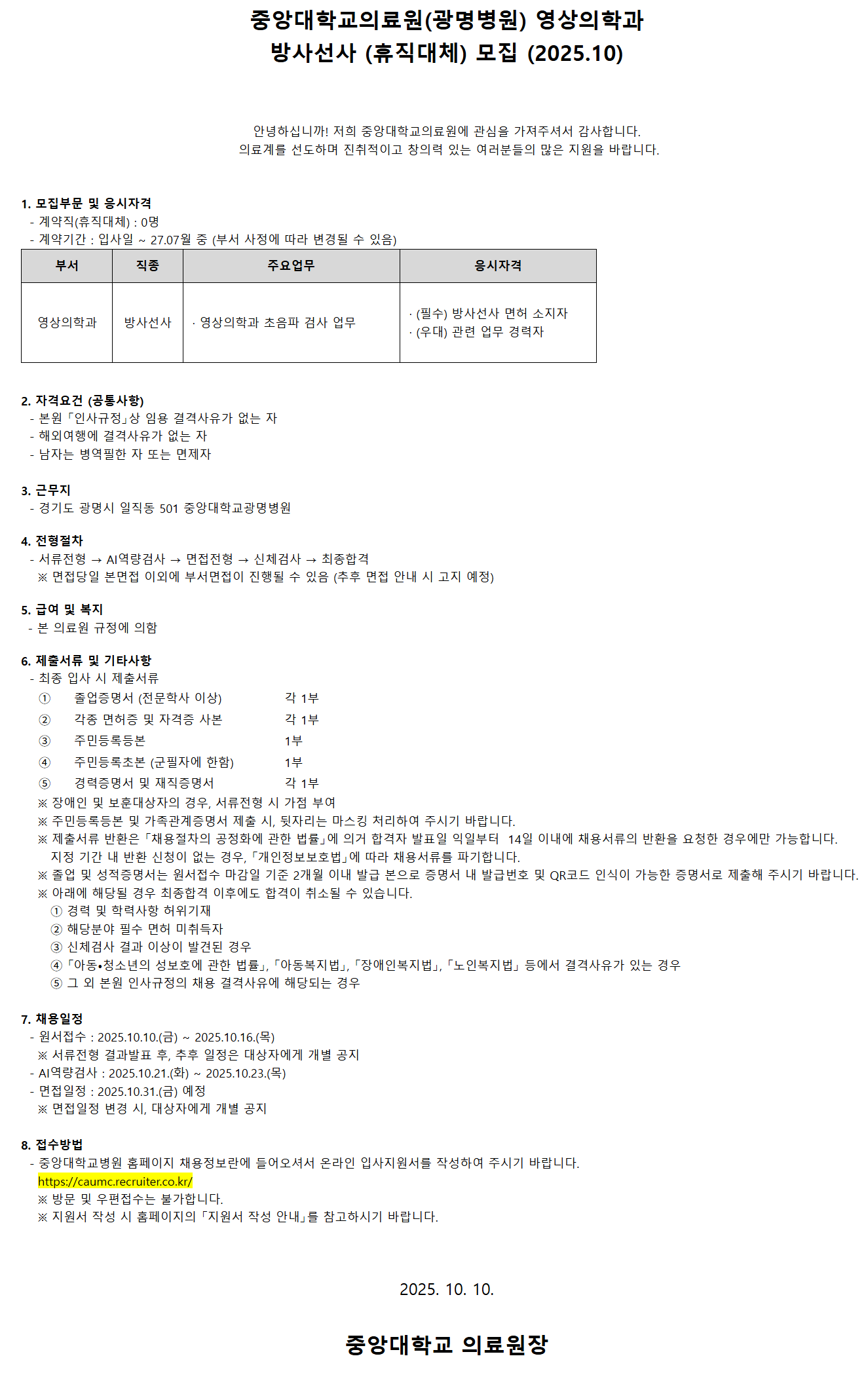 Áß¾Ó´ëÇб³ÀÇ·á¿ø(±¤¸íº´¿ø) ¿µ»óÀÇÇаú ¹æ»ç¼±»ç (ÈÞÁ÷´ëü) ¸ðÁý (2025.10) ¾È³çÇϽʴϱî! ÀúÈñ Áß¾Ó´ëÇб³ÀÇ·á¿ø¿¡ °ü½ÉÀ» °¡Á®Áּż­ °¨»çÇÕ´Ï´Ù. ÀÇ·á°è¸¦ ¼±µµÇϸç ÁøÃëÀûÀ̰í âÀÇ·Â ÀÖ´Â ¿©·¯ºÐµéÀÇ ¸¹Àº Áö¿øÀ» ¹Ù¶ø´Ï´Ù. 1. ¸ðÁýºÎ¹® ¹× ÀÀ½ÃÀÚ°Ý - °è¾àÁ÷(ÈÞÁ÷´ëü) : 0¸í - °è¾à±â°£ : ÀÔ»çÀÏ ~ 27.07¿ù Áß (ºÎ¼­ »çÁ¤¿¡ µû¶ó º¯°æµÉ ¼ö ÀÖÀ½) ºÎ¼­ Á÷Á¾ ÁÖ¿ä¾÷¹« ÀÀ½ÃÀÚ°Ý ¿µ»óÀÇÇаú ¹æ»ç¼±»ç ¡¤ ¿µ»óÀÇÇаú ÃÊÀ½ÆÄ °Ë»ç ¾÷¹« ¡¤ (Çʼö) ¹æ»ç¼±»ç ¸éÇã ¼ÒÁöÀÚ ¡¤ (¿ì´ë) °ü·Ã ¾÷¹« °æ·ÂÀÚ 2. ÀÚ°Ý¿ä°Ç (°øÅë»çÇ×) - º»¿ø ¡¸Àλç±ÔÁ¤¡¹»ó ÀÓ¿ë °á°Ý»çÀ¯°¡ ¾ø´Â ÀÚ - ÇØ¿Ü¿©Çà¿¡ °á°Ý»çÀ¯°¡ ¾ø´Â ÀÚ - ³²ÀÚ´Â º´¿ªÇÊÇÑ ÀÚ ¶Ç´Â ¸éÁ¦ÀÚ 3. ±Ù¹«Áö - °æ±âµµ ±¤¸í½Ã ÀÏÁ÷µ¿ 501 Áß¾Ó´ëÇб³±¤¸íº´¿ø 4. ÀüÇüÀýÂ÷ - ¼­·ùÀüÇü ¡æ AI¿ª·®°Ë»ç ¡æ ¸éÁ¢ÀüÇü ¡æ ½Åü°Ë»ç ¡æ ÃÖÁ¾ÇÕ°Ý ¡Ø ¸éÁ¢´çÀÏ º»¸éÁ¢ À̿ܿ¡ ºÎ¼­¸éÁ¢ÀÌ ÁøÇàµÉ ¼ö ÀÖÀ½ (ÃßÈÄ ¸éÁ¢ ¾È³» ½Ã °íÁö ¿¹Á¤) 5. ±Þ¿© ¹× º¹Áö - º» ÀÇ·á¿ø ±ÔÁ¤¿¡ ÀÇÇÔ 6. Á¦Ãâ¼­·ù ¹× ±âŸ»çÇ× - ÃÖÁ¾ ÀÔ»ç ½Ã Á¦Ãâ¼­·ù ➀ Á¹¾÷Áõ¸í¼­ (Àü¹®Çлç ÀÌ»ó) °¢ 1ºÎ ➁ °¢Á¾ ¸éÇãÁõ ¹× ÀÚ°ÝÁõ »çº» °¢ 1ºÎ ➂ Áֹεî·Ïµîº» 1ºÎ ➃ Áֹεî·ÏÃʺ» (±ºÇÊÀÚ¿¡ ÇÑÇÔ) 1ºÎ ➄ °æ·ÂÁõ¸í¼­ ¹× ÀçÁ÷Áõ¸í¼­ °¢ 1ºÎ ¡Ø Àå¾ÖÀÎ ¹× º¸ÈÆ´ë»óÀÚÀÇ °æ¿ì, ¼­·ùÀüÇü ½Ã °¡Á¡ ºÎ¿© ¡Ø Áֹεî·Ïµîº» ¹× °¡Á·°ü°èÁõ¸í¼­ Á¦Ãâ ½Ã, µÞÀÚ¸®´Â ¸¶½ºÅ· ó¸®ÇÏ¿© Áֽñ⠹ٶø´Ï´Ù. ¡Ø Á¦Ãâ¼­·ù ¹ÝȯÀº ¡¸Ã¤¿ëÀýÂ÷ÀÇ °øÁ¤È­¿¡ °üÇÑ ¹ý·ü¡¹¿¡ ÀǰŠÇÕ°ÝÀÚ ¹ßÇ¥ÀÏ ÀÍÀϺÎÅÍ 14ÀÏ À̳»¿¡ ä¿ë¼­·ùÀÇ ¹ÝȯÀ» ¿äûÇÑ °æ¿ì¿¡¸¸ °¡´ÉÇÕ´Ï´Ù. ÁöÁ¤ ±â°£ ³» ¹Ýȯ ½ÅûÀÌ ¾ø´Â °æ¿ì, ¡¸°³ÀÎÁ¤º¸º¸È£¹ý¡¹¿¡ µû¶ó ä¿ë¼­·ù¸¦ ÆÄ±âÇÕ´Ï´Ù. ¡Ø Á¹¾÷ ¹× ¼ºÀûÁõ¸í¼­´Â ¿ø¼­Á¢¼ö ¸¶°¨ÀÏ ±âÁØ 2°³¿ù À̳» ¹ß±Þ º»À¸·Î Áõ¸í¼­ ³» ¹ß±Þ¹øÈ£ ¹× QRÄÚµå ÀνÄÀÌ °¡´ÉÇÑ Áõ¸í¼­·Î Á¦ÃâÇØ Áֽñ⠹ٶø´Ï´Ù. ¡Ø ¾Æ·¡¿¡ ÇØ´çµÉ °æ¿ì ÃÖÁ¾ÇÕ°Ý ÀÌÈÄ¿¡µµ ÇÕ°ÝÀÌ Ãë¼ÒµÉ ¼ö ÀÖ½À´Ï´Ù. ➀ °æ·Â ¹× Çз»çÇ× ÇãÀ§±âÀç ➁ ÇØ´çºÐ¾ß Çʼö ¸éÇã ¹ÌÃëµæÀÚ ➂ ½Åü°Ë»ç °á°ú ÀÌ»óÀÌ ¹ß°ßµÈ °æ¿ì ➃ ¡¸¾Æµ¿•û¼Ò³âÀÇ ¼ºº¸È£¿¡ °üÇÑ ¹ý·ü¡¹, ¡¸¾Æµ¿º¹Áö¹ý¡¹, ¡¸Àå¾ÖÀκ¹Áö¹ý¡¹, ¡¸³ëÀκ¹Áö¹ý¡¹ µî¿¡¼­ °á°Ý»çÀ¯°¡ ÀÖ´Â °æ¿ì ➄ ±× ¿Ü º»¿ø Àλç±ÔÁ¤ÀÇ Ã¤¿ë °á°Ý»çÀ¯¿¡ ÇØ´çµÇ´Â °æ¿ì 7. ä¿ëÀÏÁ¤ - ¿ø¼­Á¢¼ö : 2025.10.10.(±Ý) ~ 2025.10.16.(¸ñ) ¡Ø ¼­·ùÀüÇü °á°ú¹ßÇ¥ ÈÄ, ÃßÈÄ ÀÏÁ¤Àº ´ë»óÀÚ¿¡°Ô °³º° °øÁö - AI¿ª·®°Ë»ç : 2025.10.21.(È­) ~ 2025.10.23.(¸ñ) - ¸éÁ¢ÀÏÁ¤ : 2025.10.31.(±Ý) ¿¹Á¤ ¡Ø ¸éÁ¢ÀÏÁ¤ º¯°æ ½Ã, ´ë»óÀÚ¿¡°Ô °³º° °øÁö 8. Á¢¼ö¹æ¹ý - Áß¾Ó´ëÇб³º´¿ø ȨÆäÀÌÁö ä¿ëÁ¤º¸¶õ¿¡ µé¾î¿À¼Å¼­ ¿Â¶óÀÎ ÀÔ»çÁö¿ø¼­¸¦ ÀÛ¼ºÇÏ¿© Áֽñ⠹ٶø´Ï´Ù. https://caumc.recruiter.co.kr/ ¡Ø ¹æ¹® ¹× ¿ìÆíÁ¢¼ö´Â ºÒ°¡ÇÕ´Ï´Ù. ¡Ø Áö¿ø¼­ ÀÛ¼º ½Ã ȨÆäÀÌÁöÀÇ ¡¸Áö¿ø¼­ ÀÛ¼º ¾È³»¡¹¸¦ Âü°íÇϽñ⠹ٶø´Ï´Ù. 2025. 10. 10. Áß¾Ó´ëÇб³ ÀÇ·á¿øÀå