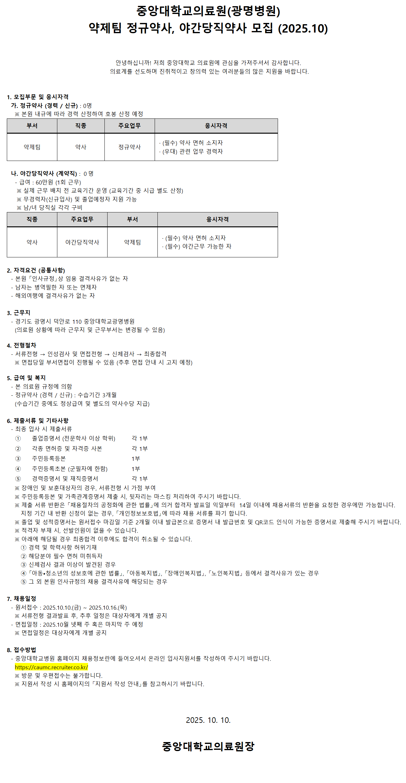 ¾àÁ¦ÆÀ Á¤±Ô¾à»ç, ¾ß°£´çÁ÷¾à»ç ¸ðÁý (2025.10)