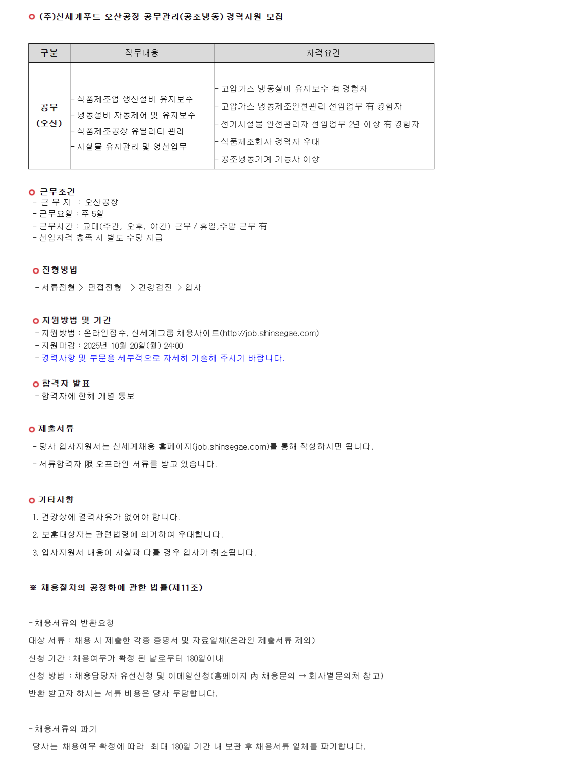 (ÁÖ)½Å¼¼°èǪµå ¿À»ê°øÀå °ø¹«°ü¸®(°øÁ¶³Ãµ¿) °æ·Â»ç¿ø ¸ðÁý