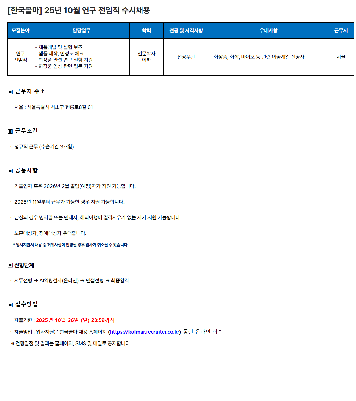 ¤ý Á¦Ãâ¹æ¹ý : ÀÔ»çÁö¿øÀº Çѱ¹Äݸ¶ ä¿ë ȨÆäÀÌÁö (https://kolmar.recruiter.co.kr) ÅëÇÑ ¿Â¶óÀÎ Á¢¼ö