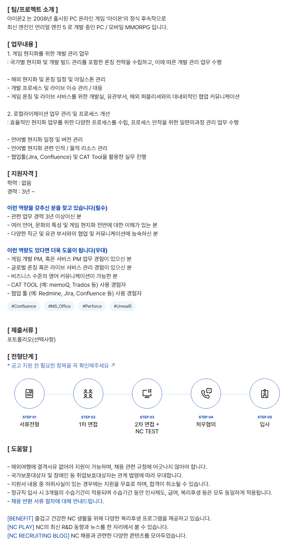 [ ÆÀ/ÇÁ·ÎÁ§Æ® ¼Ò°³ ] ¾ÆÀÌ¿Â2 ´Â 2008³â Ãâ½ÃµÈ PC ¿Â¶óÀÎ °ÔÀÓ '¾ÆÀÌ¿Â'ÀÇ Á¤½Ä ÈļÓÀÛÀ¸·Î ÃֽŠ¿£ÁøÀÎ ¾ð¸®¾ó ¿£Áø 5 ·Î °³¹ß ÁßÀÎ PC / ¸ð¹ÙÀÏ MMORPG ÀÔ´Ï´Ù. [ ¾÷¹«³»¿ë ] 1. °ÔÀÓ ÇöÁöÈ­¸¦ À§ÇÑ °³¹ß °ü¸® ¾÷¹« : ±¹°¡º° ÇöÁöÈ­ ¹× °³¹ß ºôµå °ü¸®¸¦ Æ÷ÇÔÇÑ ·ÐĪ Àü·«À» ¼ö¸³Çϰí, ÀÌ¿¡ µû¸¥ °³¹ß °ü¸® ¾÷¹« ¼öÇà - ÇØ¿Ü ÇöÁöÈ­ ¹× ·ÐĪ ÀÏÁ¤ ¹× ¸¶ÀϽºÅæ °ü¸® - °³¹ß ÇÁ·Î¼¼½º ¹× ¶óÀ̺ê À̽´ °ü¸® / ´ëÀÀ - °ÔÀÓ ·ÐĪ ¹× ¶óÀÌºê ¼­ºñ½º¸¦ À§ÇÑ °³¹ß½Ç, À¯°üºÎ¼­, ÇØ¿Ü ÆÛºí¸®¼Å¿ÍÀÇ ´ë³»¿ÜÀûÀÎ Çù¾÷ Ä¿¹Â´ÏÄÉÀÌ¼Ç 2. ·ÎÄöóÀÌÁ¦ÀÌ¼Ç ¾÷¹« °ü¸® ¹× ÇÁ·Î¼¼½º °³¼± : È¿À²ÀûÀÎ ÇöÁöÈ­ ¾÷¹«¸¦ À§ÇÑ ´Ù¾çÇÑ ÇÁ·Î¼¼½º¸¦ ¼ö¸³, ÇÁ·Î¼¼½º ¾ÈÂøÀ» À§ÇÑ ÀÏ·ÃÀǰúÁ¤ °ü¸® ¾÷¹« ¼öÇà - ¾ð¾îº° ÇöÁöÈ­ ÀÏÁ¤ ¹× ¹öÀü °ü¸® - ¾ð¾îº° ÇöÁöÈ­ °ü·Ã ÀÎÀû / ¹°Àû ¸®¼Ò½º °ü¸® - Çù¾÷Åø(Jira, Confluence) ¹× CAT ToolÀ» Ȱ¿ëÇÑ ½Ç¹« ÁøÇà [ Áö¿øÀÚ°Ý ] Çз : ¾øÀ½ °æ·Â : 3³â ~ ÀÌ·± ¿ª·®À» °®Ã߽ŠºÐÀ» ã°í ÀÖ½À´Ï´Ù(Çʼö) - °ü·Ã ¾÷¹« °æ·Â 3³â ÀÌ»óÀ̽ŠºÐ - ¿©·¯ ¾ð¾î, ¹®È­ÀÇ Æ¯¼º ¹× °ÔÀÓ ÇöÁöÈ­ Àü¹Ý¿¡ ´ëÇÑ ÀÌÇØ°¡ ÀÖ´Â ºÐ - ´Ù¾çÇÑ Á÷±º ¹× À¯°ü ºÎ¼­¿ÍÀÇ Çù¾÷ ¹× Ä¿¹Â´ÏÄÉÀ̼ǿ¡ ´É¼÷ÇϽŠºÐ ÀÌ·± ¿ª·®µµ ÀÖ´Ù¸é ´õ¿í µµ¿òÀÌ µË´Ï´Ù(¿ì´ë) - °ÔÀÓ °³¹ß PM, ȤÀº ¼­ºñ½º PM ¾÷¹« °æÇèÀÌ ÀÖÀ¸½Å ºÐ - ±Û·Î¹ú ·ÐĪ ȤÀº ¶óÀÌºê ¼­ºñ½º °ü¸® °æÇèÀÌ ÀÖÀ¸½Å ºÐ - ºñÁî´Ï½º ¼öÁØÀÇ ¿µ¾î Ä¿¹Â´ÏÄÉÀ̼ÇÀÌ °¡´ÉÇÑ ºÐ - CAT TOOL (¿¹: memoQ, Trados µî) »ç¿ë °æÇèÀÚ - Çù¾÷ Åø (¿¹: Redmine, Jira, Confluence µî) »ç¿ë °æÇèÀÚ Confluence MS_Office Perforce Unreal5 [ Á¦Ãâ¼­·ù ] Æ÷Æ®Æú¸®¿À(¼±ÅûçÇ×)