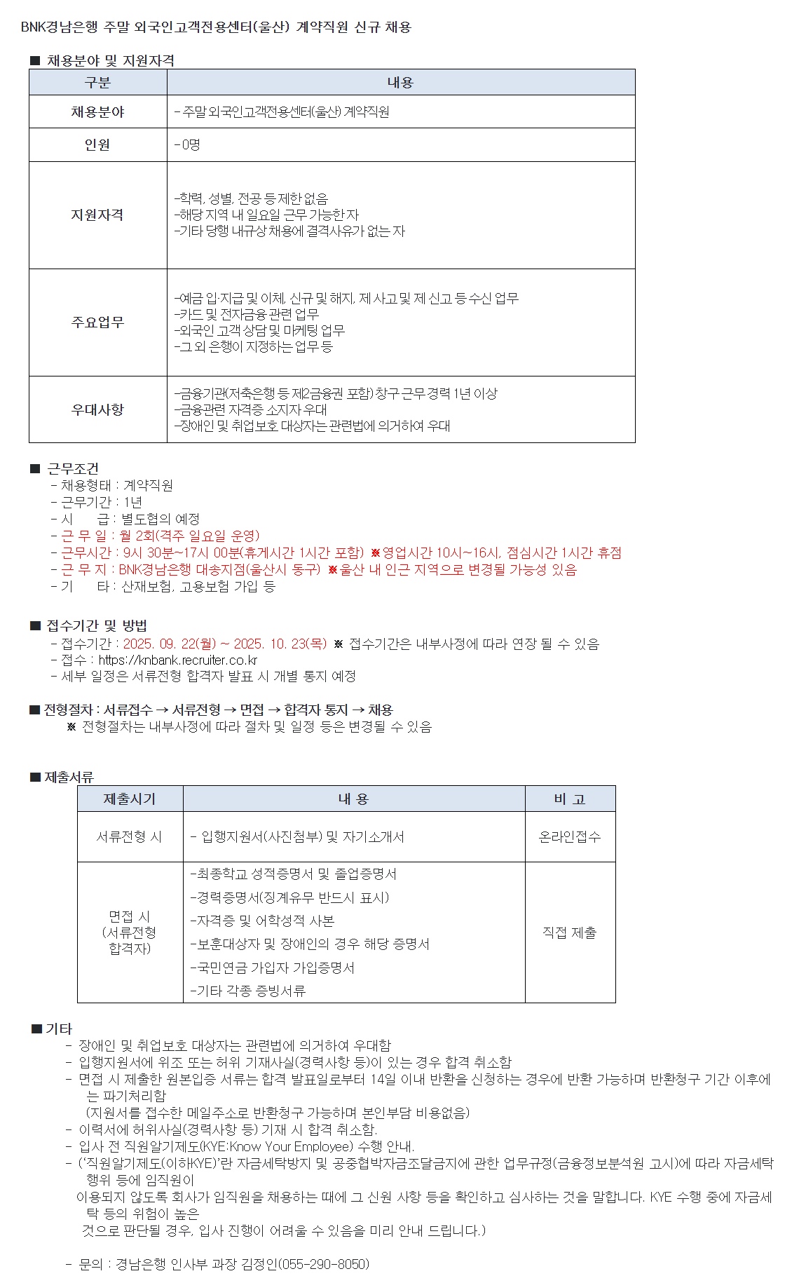 BNK°æ³²ÀºÇà ÁÖ¸» ¿Ü±¹ÀÎ°í°´Àü¿ë¼¾ÅÍ(¿ï»ê) °è¾àÁ÷¿ø ½Å±Ô ä¿ë(±â°£¿¬Àå) BNK°æ³²ÀºÇà ÁÖ¸» ¿Ü±¹ÀÎ°í°´Àü¿ë¼¾ÅÍ(¿ï»ê) °è¾àÁ÷¿ø ½Å±Ô ä¿ë ¡á ä¿ëºÐ¾ß ¹× Áö¿øÀÚ°Ý ±¸ºÐ ³»¿ë ä¿ëºÐ¾ß - ÁÖ¸» ¿Ü±¹ÀÎ°í°´Àü¿ë¼¾ÅÍ(¿ï»ê) °è¾àÁ÷¿ø Àοø - 0¸í Áö¿øÀÚ°Ý -ÇзÂ, ¼ºº°, Àü°ø µî Á¦ÇÑ ¾øÀ½ -ÇØ´ç Áö¿ª ³» ÀÏ¿äÀÏ ±Ù¹« °¡´ÉÇÑ ÀÚ -±âŸ ´çÇà ³»±Ô»ó ä¿ë¿¡ °á°Ý»çÀ¯°¡ ¾ø´Â ÀÚ ÁÖ¿ä¾÷¹« -¿¹±Ý ÀÔ¡¤Áö±Þ ¹× ÀÌü, ½Å±Ô ¹× ÇØÁö, Á¦ »ç°í ¹× Á¦ ½Å°í µî ¼ö½Å ¾÷¹« -Ä«µå ¹× ÀüÀÚ±ÝÀ¶ °ü·Ã ¾÷¹« -¿Ü±¹ÀÎ °í°´ »ó´ã ¹× ¸¶ÄÉÆÃ ¾÷¹« -±× ¿Ü ÀºÇàÀÌ ÁöÁ¤ÇÏ´Â ¾÷¹« µî ¿ì´ë»çÇ× -±ÝÀ¶±â°ü(ÀúÃàÀºÇà µî Á¦2±ÝÀ¶±Ç Æ÷ÇÔ) ⱸ ±Ù¹« °æ·Â 1³â ÀÌ»ó -±ÝÀ¶°ü·Ã ÀÚ°ÝÁõ ¼ÒÁöÀÚ ¿ì´ë -Àå¾ÖÀÎ ¹× Ãë¾÷º¸È£ ´ë»óÀÚ´Â °ü·Ã¹ý¿¡ ÀǰÅÇÏ¿© ¿ì´ë ¡á ±Ù¹«Á¶°Ç - ä¿ëÇüÅ : °è¾àÁ÷¿ø - ±Ù¹«±â°£ : 1³â - ½Ã ±Þ : º°µµÇùÀÇ ¿¹Á¤ - ±Ù ¹« ÀÏ : ¿ù 2ȸ(°ÝÁÖ ÀÏ¿äÀÏ ¿î¿µ) - ±Ù¹«½Ã°£ : 9½Ã 30ºÐ~17½Ã 00ºÐ(ÈްԽð£ 1½Ã°£ Æ÷ÇÔ) ¡Ø¿µ¾÷½Ã°£ 10½Ã~16½Ã, Á¡½É½Ã°£ 1½Ã°£ ÈÞÁ¡ - ±Ù ¹« Áö : BNK°æ³²ÀºÇà ´ë¼ÛÁöÁ¡(¿ï»ê½Ã µ¿±¸) ¡Ø¿ï»ê ³» Àα٠Áö¿ªÀ¸·Î º¯°æµÉ °¡´É¼º ÀÖÀ½ - ±â Ÿ : »êÀ纸Çè, °í¿ëº¸Çè °¡ÀÔ µî ¡á Á¢¼ö±â°£ ¹× ¹æ¹ý - Á¢¼ö±â°£ : 2025. 09. 22(¿ù) ~ 2025. 10. 23(¸ñ) ¡Ø Á¢¼ö±â°£Àº ³»ºÎ»çÁ¤¿¡ µû¶ó ¿¬Àå µÉ ¼ö ÀÖÀ½ - Á¢¼ö : https://knbank.recruiter.co.kr - ¼¼ºÎ ÀÏÁ¤Àº ¼­·ùÀüÇü ÇÕ°ÝÀÚ ¹ßÇ¥ ½Ã °³º° ÅëÁö ¿¹Á¤ ¡á ÀüÇüÀýÂ÷ : ¼­·ùÁ¢¼ö ¡æ ¼­·ùÀüÇü ¡æ ¸éÁ¢ ¡æ ÇÕ°ÝÀÚ ÅëÁö ¡æ ä¿ë ¡Ø ÀüÇüÀýÂ÷´Â ³»ºÎ»çÁ¤¿¡ µû¶ó ÀýÂ÷ ¹× ÀÏÁ¤ µîÀº º¯°æµÉ ¼ö ÀÖÀ½ ¡á Á¦Ãâ¼­·ù Á¦Ãâ½Ã±â ³» ¿ë ºñ °í ¼­·ùÀüÇü ½Ã - ÀÔÇàÁö¿ø¼­(»çÁøÃ·ºÎ) ¹× ÀÚ±â¼Ò°³¼­ ¿Â¶óÀÎÁ¢¼ö ¸éÁ¢ ½Ã (¼­·ùÀüÇü ÇÕ°ÝÀÚ) -ÃÖÁ¾Çб³ ¼ºÀûÁõ¸í¼­ ¹× Á¹¾÷Áõ¸í¼­ -°æ·ÂÁõ¸í¼­(¡°èÀ¯¹« ¹Ýµå½Ã Ç¥½Ã) -ÀÚ°ÝÁõ ¹× ¾îÇмºÀû »çº» -º¸ÈÆ´ë»óÀÚ ¹× Àå¾ÖÀÎÀÇ °æ¿ì ÇØ´ç Áõ¸í¼­ -±¹¹Î¿¬±Ý °¡ÀÔÀÚ °¡ÀÔÁõ¸í¼­ -±âŸ °¢Á¾ Áõºù¼­·ù Á÷Á¢ Á¦Ãâ ¡á ±âŸ - Àå¾ÖÀÎ ¹× Ãë¾÷º¸È£ ´ë»óÀÚ´Â °ü·Ã¹ý¿¡ ÀǰÅÇÏ¿© ¿ì´ëÇÔ - ÀÔÇàÁö¿ø¼­¿¡ À§Á¶ ¶Ç´Â ÇãÀ§ ±âÀç»ç½Ç(°æ·Â»çÇ× µî)ÀÌ ÀÖ´Â °æ¿ì ÇÕ°Ý Ãë¼ÒÇÔ - ¸éÁ¢ ½Ã Á¦ÃâÇÑ ¿øº»ÀÔÁõ ¼­·ù´Â ÇÕ°Ý ¹ßÇ¥ÀϷκÎÅÍ 14ÀÏ À̳» ¹ÝȯÀ» ½ÅûÇÏ´Â °æ¿ì¿¡ ¹Ýȯ °¡´ÉÇÏ¸ç ¹Ýȯû±¸ ±â°£ ÀÌÈÄ¿¡´Â ÆÄ±âó¸®ÇÔ (Áö¿ø¼­¸¦ Á¢¼öÇÑ ¸ÞÀÏÁÖ¼Ò·Î ¹Ýȯû±¸ °¡´ÉÇÏ¸ç º»Àκδ㠺ñ¿ë¾øÀ½) - À̷¼­¿¡ ÇãÀ§»ç½Ç(°æ·Â»çÇ× µî) ±âÀç ½Ã ÇÕ°Ý Ãë¼ÒÇÔ. - ÀÔ»ç Àü Á÷¿ø¾Ë±âÁ¦µµ(KYE:Know Your Employee) ¼öÇà ¾È³». - (¡®Á÷¿ø¾Ë±âÁ¦µµ(ÀÌÇÏKYE)¡¯¶õ Àڱݼ¼Å¹¹æÁö ¹× °øÁßÇù¹ÚÀÚ±ÝÁ¶´Þ±ÝÁö¿¡ °üÇÑ ¾÷¹«±ÔÁ¤(±ÝÀ¶Á¤º¸ºÐ¼®¿ø °í½Ã)¿¡ µû¶ó Àڱݼ¼Å¹ÇàÀ§ µî¿¡ ÀÓÁ÷¿øÀÌ ÀÌ¿ëµÇÁö ¾Êµµ·Ï ȸ»ç°¡ ÀÓÁ÷¿øÀ» ä¿ëÇÏ´Â ¶§¿¡ ±× ½Å¿ø »çÇ× µîÀ» È®ÀÎÇÏ°í ½É»çÇÏ´Â °ÍÀ» ¸»ÇÕ´Ï´Ù. KYE ¼öÇà Áß¿¡ Àڱݼ¼Å¹ µîÀÇ À§ÇèÀÌ ³ôÀº °ÍÀ¸·Î ÆÇ´ÜµÉ °æ¿ì, ÀÔ»ç ÁøÇàÀÌ ¾î·Á¿ï ¼ö ÀÖÀ½À» ¹Ì¸® ¾È³» µå¸³´Ï´Ù.) - ¹®ÀÇ : °æ³²ÀºÇà ÀλçºÎ °úÀå ±èÁ¤ÀÎ(***-****-****)
