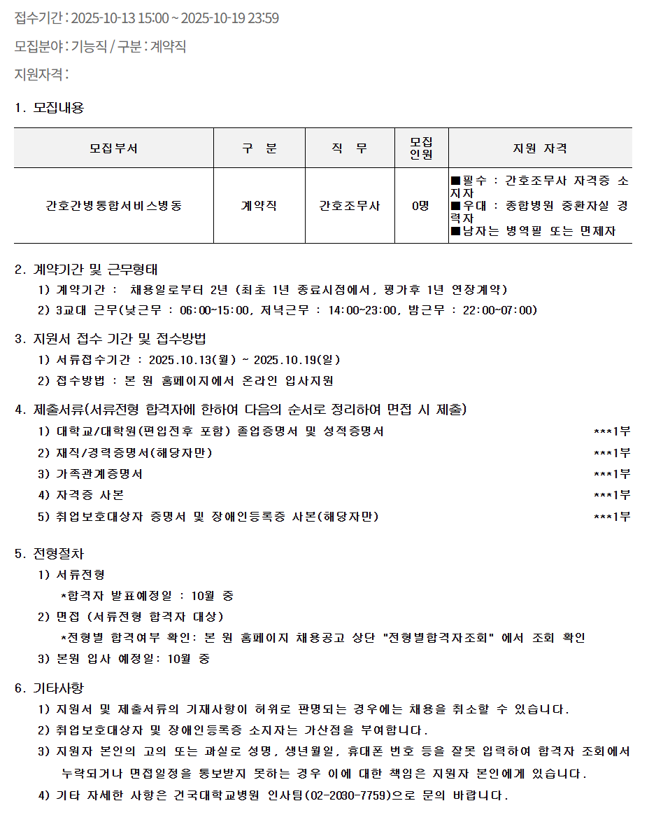Á¢¼ö±â°£ : 2025-10-13 15:00 ~ 2025-10-19 23:59 ¸ðÁýºÐ¾ß : ±â´ÉÁ÷ / ±¸ºÐ : °è¾àÁ÷ Áö¿øÀÚ°Ý : 1. ¸ðÁý³»¿ë ¸ðÁýºÎ¼­ ±¸ ºÐ Á÷ ¹« ¸ðÁý Àοø Áö¿ø ÀÚ°Ý °£È£°£º´ÅëÇÕ¼­ºñ½ºº´µ¿ °è¾àÁ÷ °£È£Á¶¹«»ç 0¸í ¡áÇʼö : °£È£Á¶¹«»ç ÀÚ°ÝÁõ ¼ÒÁöÀÚ ¡á¿ì´ë : Á¾ÇÕº´¿ø ÁßȯÀÚ½Ç °æ·ÂÀÚ ¡á³²ÀÚ´Â º´¿ªÇÊ ¶Ç´Â ¸éÁ¦ÀÚ 2. °è¾à±â°£ ¹× ±Ù¹«ÇüÅ 1) °è¾à±â°£ : ä¿ëÀϷκÎÅÍ 2³â (ÃÖÃÊ 1³â Á¾·á½ÃÁ¡¿¡¼­, Æò°¡ÈÄ 1³â ¿¬Àå°è¾à) 2) 3±³´ë ±Ù¹«(³·±Ù¹« : 06:00~15:00, Àú³á±Ù¹« : 14:00~23:00, ¹ã±Ù¹« : 22:00~07:00) 3. Áö¿ø¼­ Á¢¼ö ±â°£ ¹× Á¢¼ö¹æ¹ý 1) ¼­·ùÁ¢¼ö±â°£ : 2025.10.13(¿ù) ~ 2025.10.19(ÀÏ) 2) Á¢¼ö¹æ¹ý : º» ¿ø ȨÆäÀÌÁö¿¡¼­ ¿Â¶óÀÎ ÀÔ»çÁö¿ø 4. Á¦Ãâ¼­·ù(¼­·ùÀüÇü ÇÕ°ÝÀÚ¿¡ ÇÑÇÏ¿© ´ÙÀ½ÀÇ ¼ø¼­·Î Á¤¸®ÇÏ¿© ¸éÁ¢ ½Ã Á¦Ãâ) 1) ´ëÇб³/´ëÇпø(ÆíÀÔÀüÈÄ Æ÷ÇÔ) Á¹¾÷Áõ¸í¼­ ¹× ¼ºÀûÁõ¸í¼­ ***1ºÎ 2) ÀçÁ÷/°æ·ÂÁõ¸í¼­(ÇØ´çÀÚ¸¸) ***1ºÎ 3) °¡Á·°ü°èÁõ¸í¼­ ***1ºÎ 4) ÀÚ°ÝÁõ »çº» ***1ºÎ 5) Ãë¾÷º¸È£´ë»óÀÚ Áõ¸í¼­ ¹× Àå¾ÖÀεî·ÏÁõ »çº»(ÇØ´çÀÚ¸¸) ***1ºÎ 5. ÀüÇüÀýÂ÷ 1) ¼­·ùÀüÇü *ÇÕ°ÝÀÚ ¹ßÇ¥¿¹Á¤ÀÏ : 10¿ù Áß 2) ¸éÁ¢ (¼­·ùÀüÇü ÇÕ°ÝÀÚ ´ë»ó) *ÀüÇüº° ÇÕ°Ý¿©ºÎ È®ÀÎ: º» ¿ø ȨÆäÀÌÁö ä¿ë°ø°í »ó´Ü "ÀüÇüº°ÇÕ°ÝÀÚÁ¶È¸" ¿¡¼­ Á¶È¸ È®ÀÎ 3) º»¿ø ÀÔ»ç ¿¹Á¤ÀÏ: 10¿ù Áß 6. ±âŸ»çÇ× 1) Áö¿ø¼­ ¹× Á¦Ãâ¼­·ùÀÇ ±âÀç»çÇ×ÀÌ ÇãÀ§·Î ÆÇ¸íµÇ´Â °æ¿ì¿¡´Â ä¿ëÀ» Ãë¼ÒÇÒ ¼ö ÀÖ½À´Ï´Ù. 2) Ãë¾÷º¸È£´ë»óÀÚ ¹× Àå¾ÖÀεî·ÏÁõ ¼ÒÁöÀÚ´Â °¡»êÁ¡À» ºÎ¿©ÇÕ´Ï´Ù. 3) Áö¿øÀÚ º»ÀÎÀÇ °íÀÇ ¶Ç´Â °ú½Ç·Î ¼º¸í, »ý³â¿ùÀÏ, ÈÞ´ëÆù ¹øÈ£ µîÀ» À߸ø ÀÔ·ÂÇÏ¿© ÇÕ°ÝÀÚ Á¶È¸¿¡¼­ ´©¶ôµÇ°Å³ª ¸éÁ¢ÀÏÁ¤À» Å뺸¹ÞÁö ¸øÇÏ´Â °æ¿ì ÀÌ¿¡ ´ëÇÑ Ã¥ÀÓÀº Áö¿øÀÚ º»Àο¡°Ô ÀÖ½À´Ï´Ù. 4) ±âŸ ÀÚ¼¼ÇÑ »çÇ×Àº °Ç±¹´ëÇб³º´¿ø ÀλçÆÀ(***-****-****)À¸·Î ¹®ÀÇ ¹Ù¶ø´Ï´Ù.