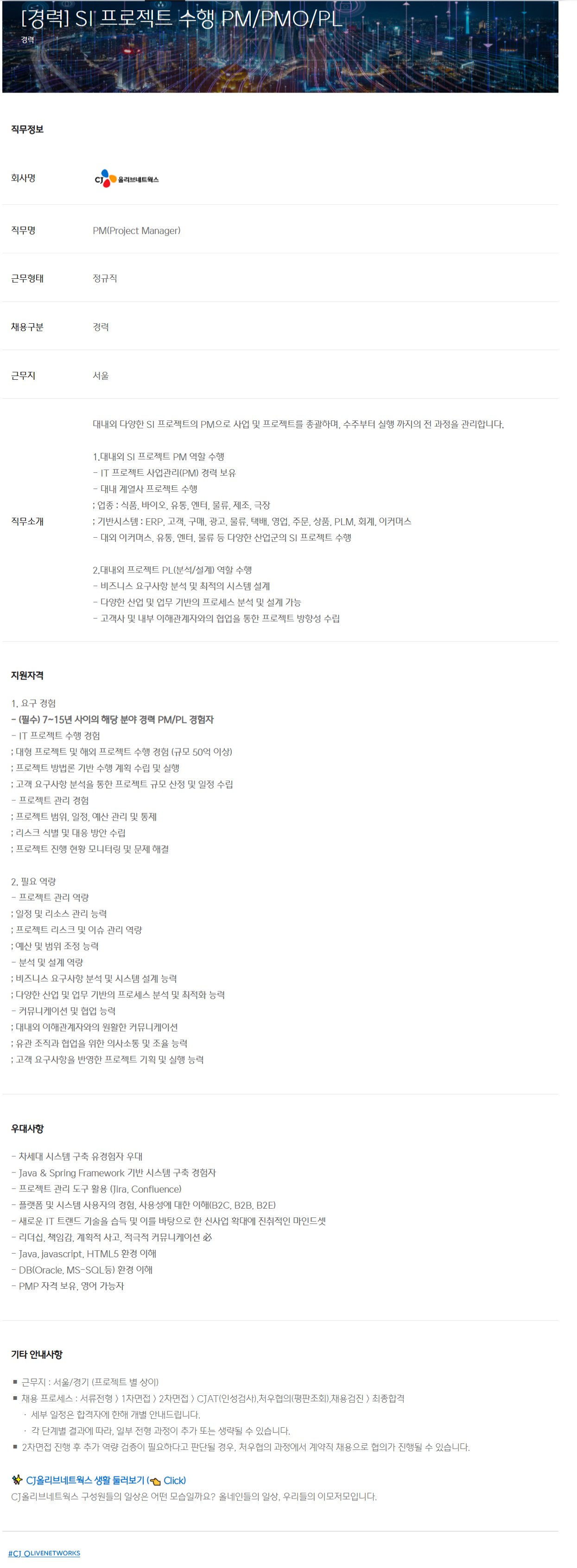 Á÷¹«¸í PM(Project Manager) ±Ù¹«ÇüÅ Á¤±ÔÁ÷ ä¿ë±¸ºÐ °æ·Â ±Ù¹«Áö ¼­¿ï Á÷¹«¼Ò°³ ´ë³»¿Ü ´Ù¾çÇÑ SI ÇÁ·ÎÁ§Æ®ÀÇ PMÀ¸·Î »ç¾÷ ¹× ÇÁ·ÎÁ§Æ®¸¦ ÃѰýÇϸç, ¼öÁÖºÎÅÍ ½ÇÇà ±îÁöÀÇ Àü °úÁ¤À» °ü¸®ÇÕ´Ï´Ù. 1.´ë³»¿Ü SI ÇÁ·ÎÁ§Æ® PM ¿ªÇÒ ¼öÇà - IT ÇÁ·ÎÁ§Æ® »ç¾÷°ü¸®(PM) °æ·Â º¸À¯ - ´ë³» °è¿­»ç ÇÁ·ÎÁ§Æ® ¼öÇà ; ¾÷Á¾ : ½Äǰ, ¹ÙÀÌ¿À, À¯Åë, ¿£ÅÍ, ¹°·ù, Á¦Á¶, ±ØÀå ; ±â¹Ý½Ã½ºÅÛ : ERP, °í°´, ±¸¸Å, ±¤°í, ¹°·ù, Åùè, ¿µ¾÷, ÁÖ¹®, »óǰ, PLM, ȸ°è, ÀÌÄ¿¸Ó½º - ´ë¿Ü ÀÌÄ¿¸Ó½º, À¯Åë, ¿£ÅÍ, ¹°·ù µî ´Ù¾çÇÑ »ê¾÷±ºÀÇ SI ÇÁ·ÎÁ§Æ® ¼öÇà 2.´ë³»¿Ü ÇÁ·ÎÁ§Æ® PL(ºÐ¼®/¼³°è) ¿ªÇÒ ¼öÇà - ºñÁî´Ï½º ¿ä±¸»çÇ× ºÐ¼® ¹× ÃÖÀûÀÇ ½Ã½ºÅÛ ¼³°è - ´Ù¾çÇÑ »ê¾÷ ¹× ¾÷¹« ±â¹ÝÀÇ ÇÁ·Î¼¼½º ºÐ¼® ¹× ¼³°è °¡´É - °í°´»ç ¹× ³»ºÎ ÀÌÇØ°ü°èÀÚ¿ÍÀÇ Çù¾÷À» ÅëÇÑ ÇÁ·ÎÁ§Æ® ¹æÇ⼺ ¼ö¸³