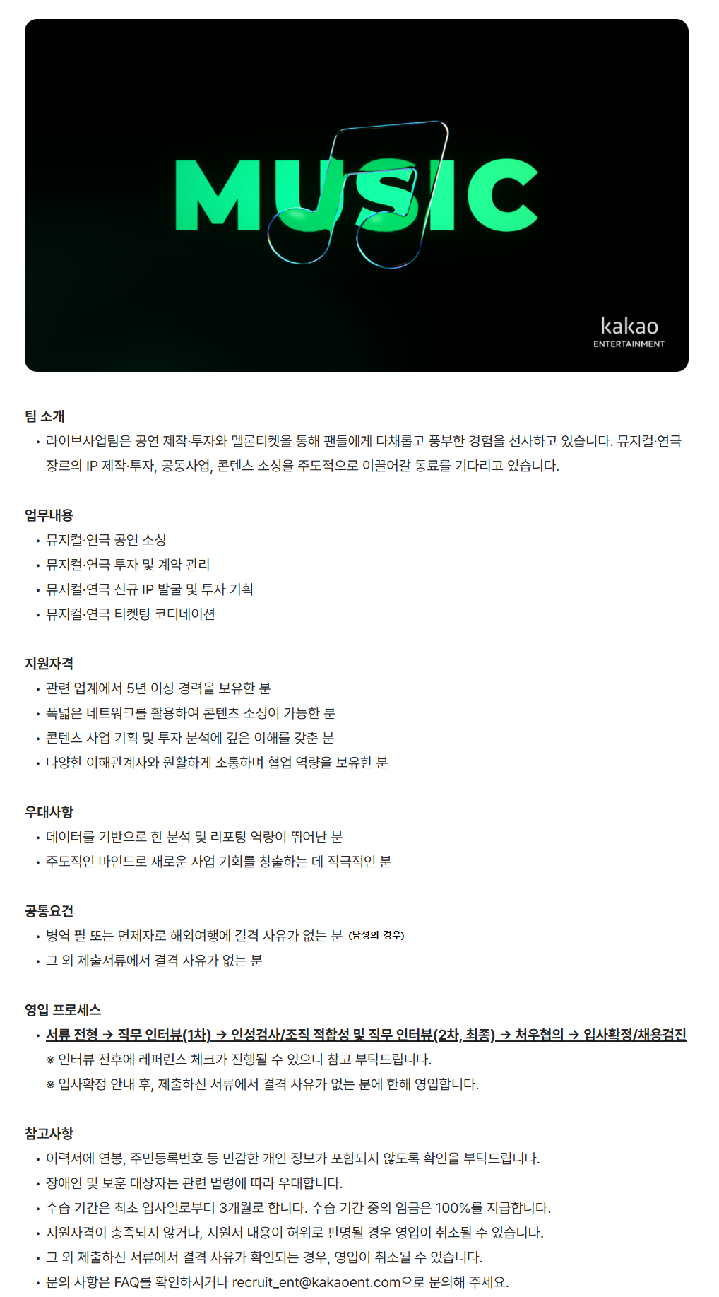 ¹®ÀÇ »çÇ×Àº FAQ¸¦ È®ÀÎÇϽðųª recruit_ent@kakaoent.com******@*******.***À¸·Î ¹®ÀÇÇØ ÁÖ¼¼¿ä.