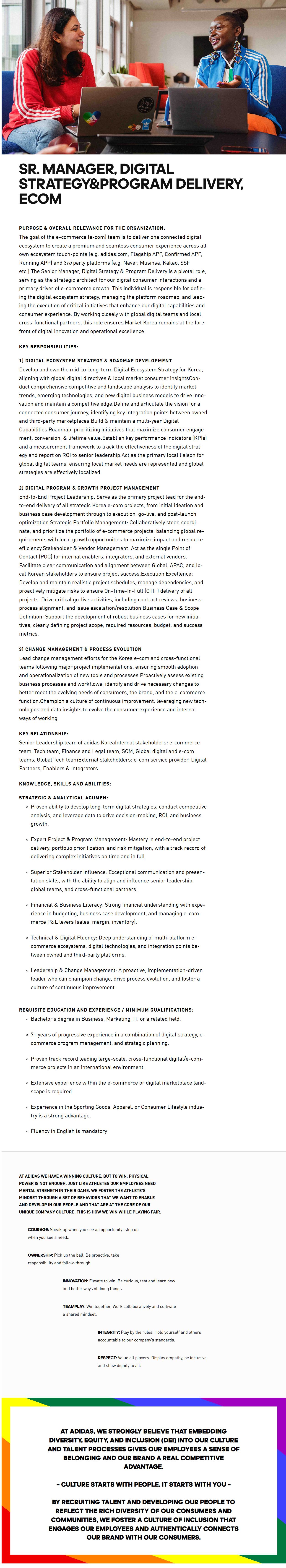 The goal of the e-commerce (e-com) team is to deliver one connected digital ecosystem to create a premium and seamless consumer experience across all own ecosystem touch-points (e.g. adidas.com, Flagship APP, Confirmed APP, Running APP) and 3rd party platforms (e.g. Naver, Musinsa, Kakao, SSF etc.).The Senior Manager, Digital Strategy & Program Delivery is a pivotal role, serving as the strategic architect for our digital consumer interactions and a primary driver of e-commerce growth. This individual is responsible for defining the digital ecosystem strategy, managing the platform roadmap, and leading the execution of critical initiatives that enhance our digital capabilities and consumer experience. By working closely with global digital teams and local cross-functional partners, this role ensures Market Korea remains at the forefront of digital innovation and operational excellence.