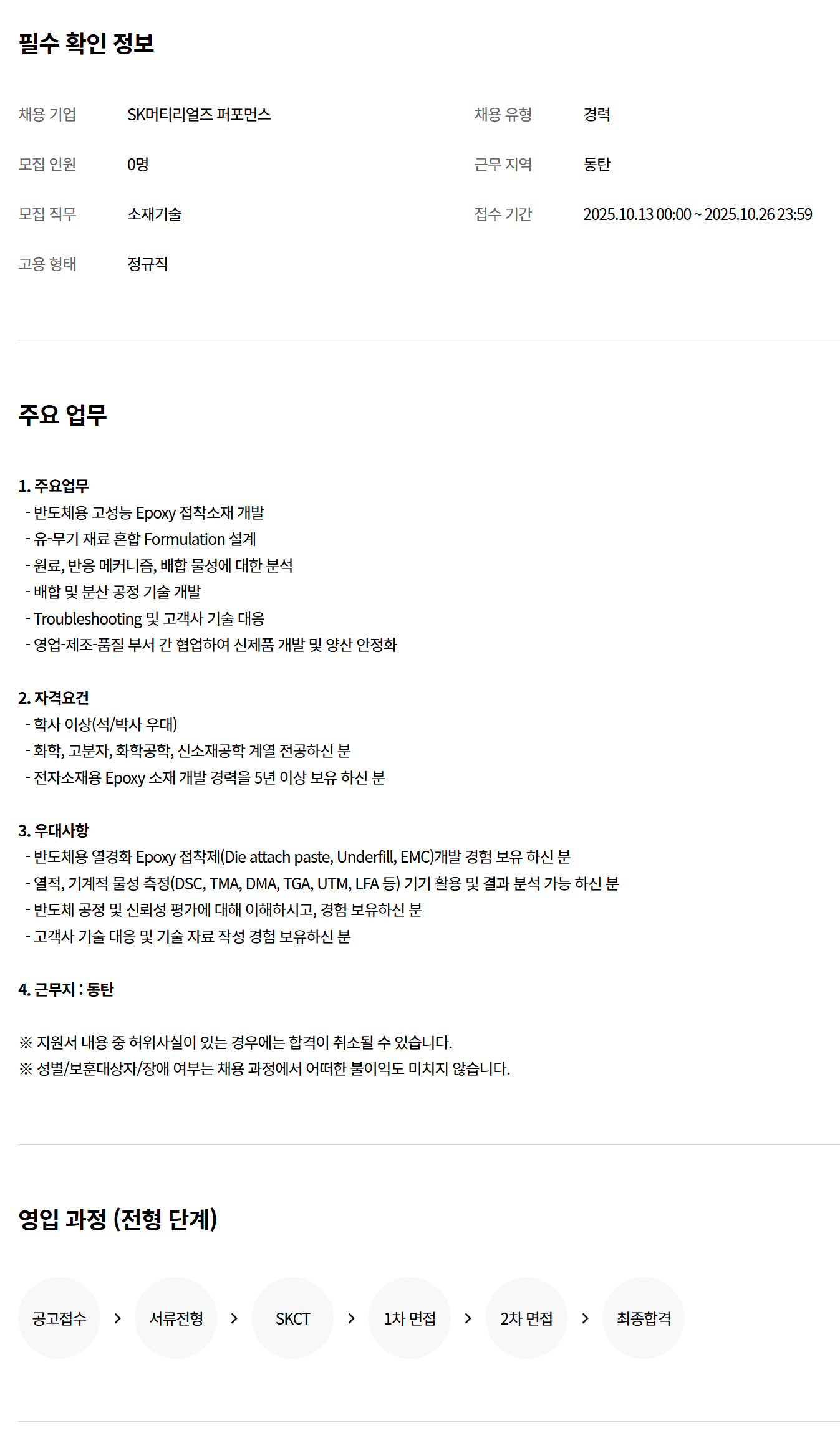 Çʼö È®ÀÎ Á¤º¸ ä¿ë ±â¾÷ SK¸ÓƼ¸®¾óÁî ÆÛÆ÷¸Õ½º ä¿ë À¯Çü °æ·Â ¸ðÁý Àοø 0¸í ±Ù¹« Áö¿ª µ¿Åº ¸ðÁý Á÷¹« ¼ÒÀç±â¼ú Á¢¼ö ±â°£ 2025.10.13 00:00 ~ 2025.10.26 23:59 °í¿ë ÇüÅ Á¤±ÔÁ÷ ÁÖ¿ä ¾÷¹« 1. ÁÖ¿ä¾÷¹« - ¹ÝµµÃ¼¿ë °í¼º´É Epoxy Á¢Âø¼ÒÀç °³¹ß - À¯-¹«±â Àç·á È¥ÇÕ Formulation ¼³°è - ¿ø·á, ¹ÝÀÀ ¸ÞÄ¿´ÏÁò, ¹èÇÕ ¹°¼º¿¡ ´ëÇÑ ºÐ¼® - ¹èÇÕ ¹× ºÐ»ê °øÁ¤ ±â¼ú °³¹ß - Troubleshooting ¹× °í°´»ç ±â¼ú ´ëÀÀ - ¿µ¾÷-Á¦Á¶-ǰÁú ºÎ¼­ °£ Çù¾÷ÇÏ¿© ½ÅÁ¦Ç° °³¹ß ¹× ¾ç»ê ¾ÈÁ¤È­ 2. ÀÚ°Ý¿ä°Ç - Çлç ÀÌ»ó(¼®/¹Ú»ç ¿ì´ë) - È­ÇÐ, °íºÐÀÚ, È­ÇаøÇÐ, ½Å¼ÒÀç°øÇÐ °è¿­ Àü°øÇϽŠºÐ - ÀüÀÚ¼ÒÀç¿ë Epoxy ¼ÒÀç °³¹ß °æ·ÂÀ» 5³â ÀÌ»ó º¸À¯ ÇϽŠºÐ 3. ¿ì´ë»çÇ× - ¹ÝµµÃ¼¿ë ¿­°æÈ­ Epoxy Á¢ÂøÁ¦(Die attach paste, Underfill, EMC)°³¹ß °æÇè º¸À¯ ÇϽŠºÐ - ¿­Àû, ±â°èÀû ¹°¼º ÃøÁ¤(DSC, TMA, DMA, TGA, UTM, LFA µî) ±â±â Ȱ¿ë ¹× °á°ú ºÐ¼® °¡´É ÇϽŠºÐ - ¹ÝµµÃ¼ °øÁ¤ ¹× ½Å·Ú¼º Æò°¡¿¡ ´ëÇØ ÀÌÇØÇϽðí, °æÇè º¸À¯ÇϽŠºÐ - °í°´»ç ±â¼ú ´ëÀÀ ¹× ±â¼ú ÀÚ·á ÀÛ¼º °æÇè º¸À¯ÇϽŠºÐ 4. ±Ù¹«Áö : µ¿Åº ¡Ø Áö¿ø¼­ ³»¿ë Áß ÇãÀ§»ç½ÇÀÌ ÀÖ´Â °æ¿ì¿¡´Â ÇÕ°ÝÀÌ Ãë¼ÒµÉ ¼ö ÀÖ½À´Ï´Ù. ¡Ø ¼ºº°/º¸ÈÆ´ë»óÀÚ/Àå¾Ö ¿©ºÎ´Â ä¿ë °úÁ¤¿¡¼­ ¾î¶°ÇÑ ºÒÀÌÀ͵µ ¹ÌÄ¡Áö ¾Ê½À´Ï´Ù.