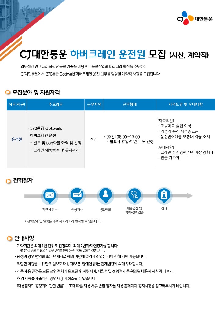CJ´ëÇÑÅë¿î ÇϹöÅ©·¹ÀÎ ¿îÀü¿ø ¸ðÁý (¼»ê, °è¾àÁ÷)