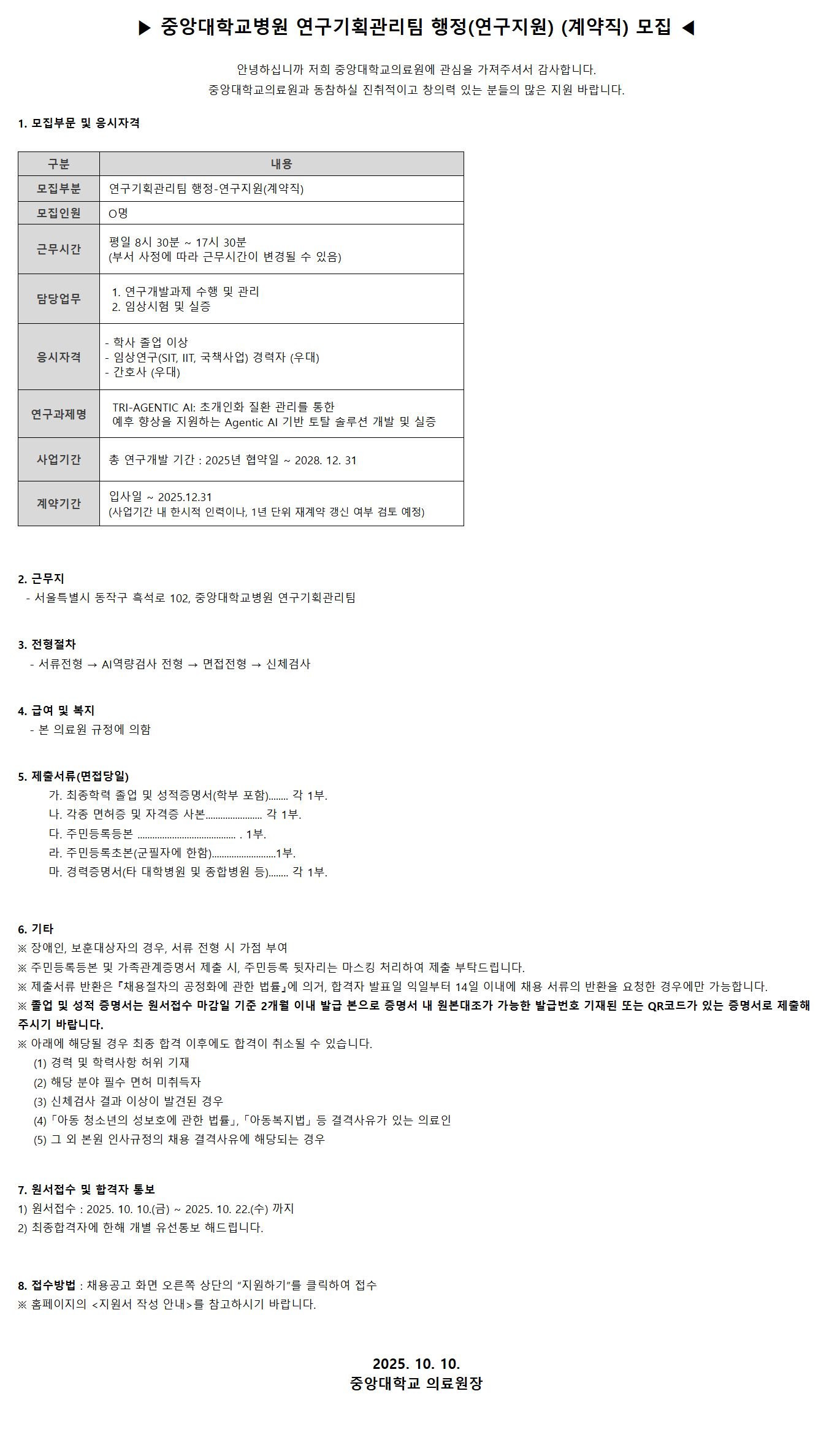 ¢º Áß¾Ó´ëÇб³º´¿ø ¿¬±¸±âȹ°ü¸®ÆÀ ÇàÁ¤(¿¬±¸Áö¿ø) (°è¾àÁ÷) ¸ðÁý ¢¸