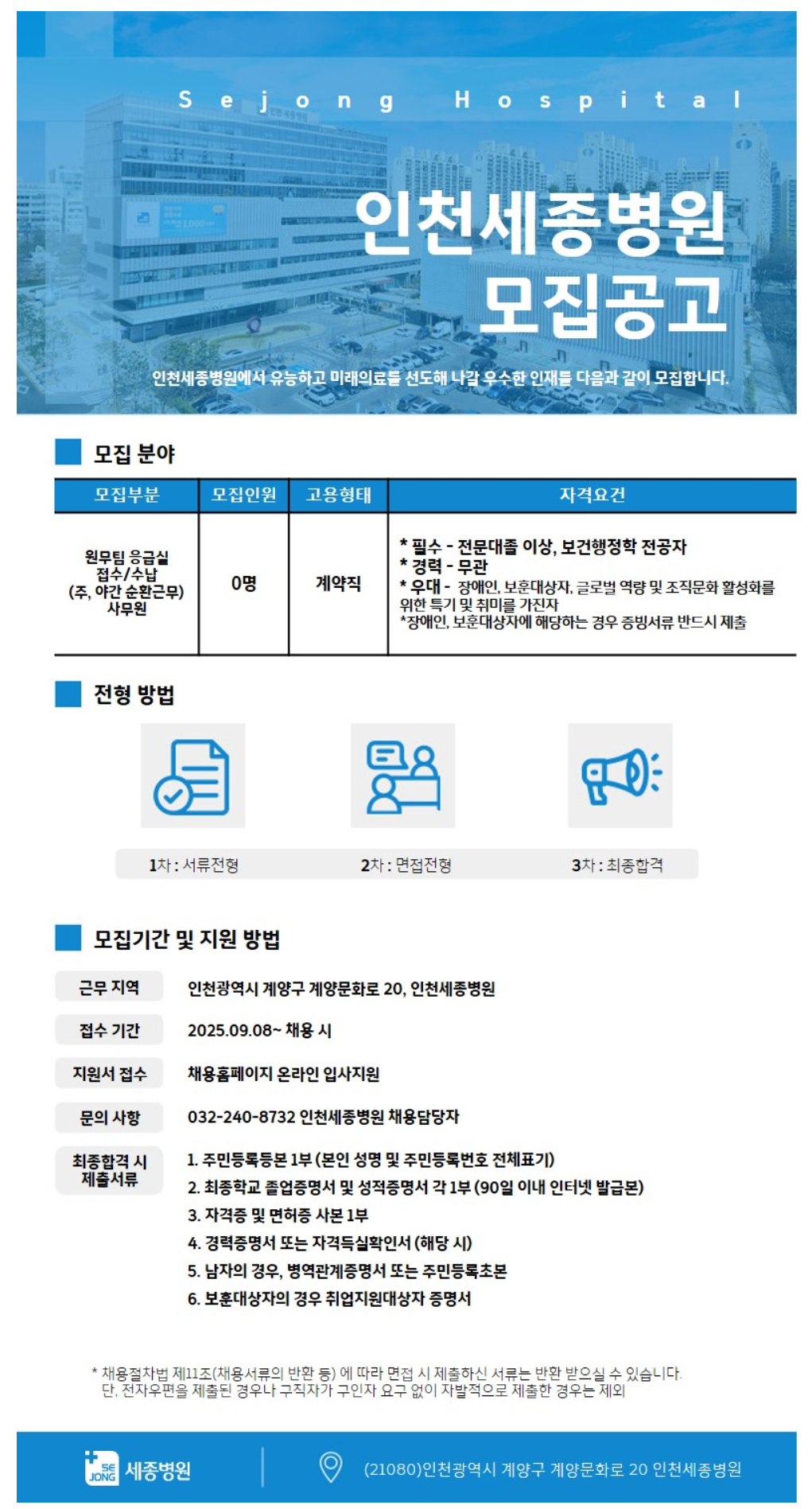 [ÀÎõ¼¼Á¾º´¿ø] ¿ø¹«ÆÀ ÀÀ±Þ½Ç Á¢¼ö/¼ö³³ »ç¹«¿ø ä¿ë(°è¾àÁ÷)
