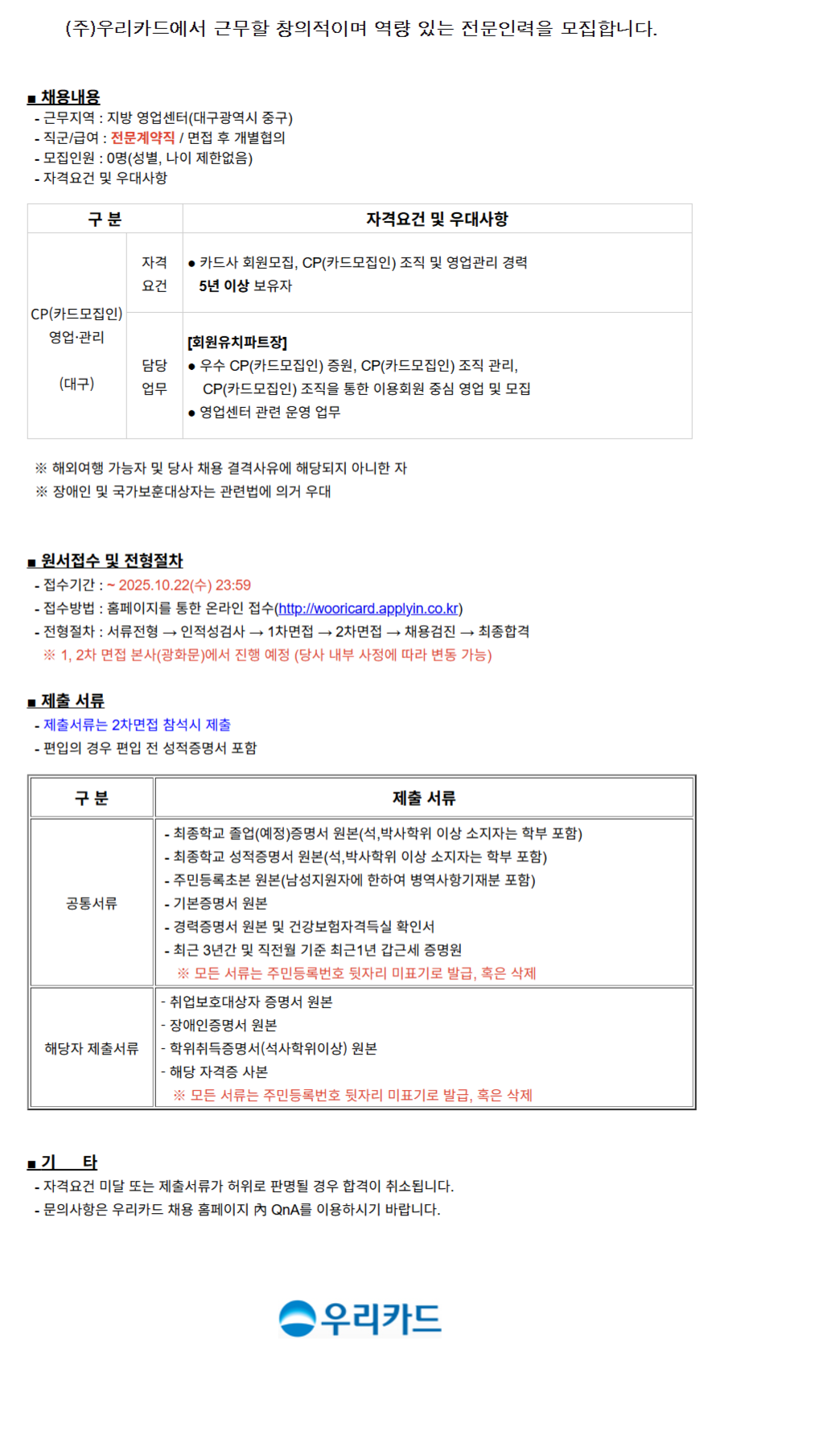 ¿ì¸®Ä«µå °æ·ÂÁ÷ ä¿ë°ø°í(´ë±¸-CP(Ä«µå¸ðÁýÀÎ)¿µ¾÷¡¤°ü¸®)