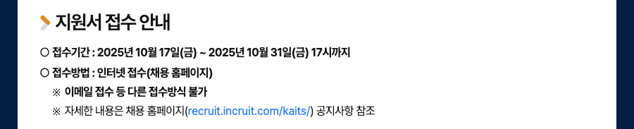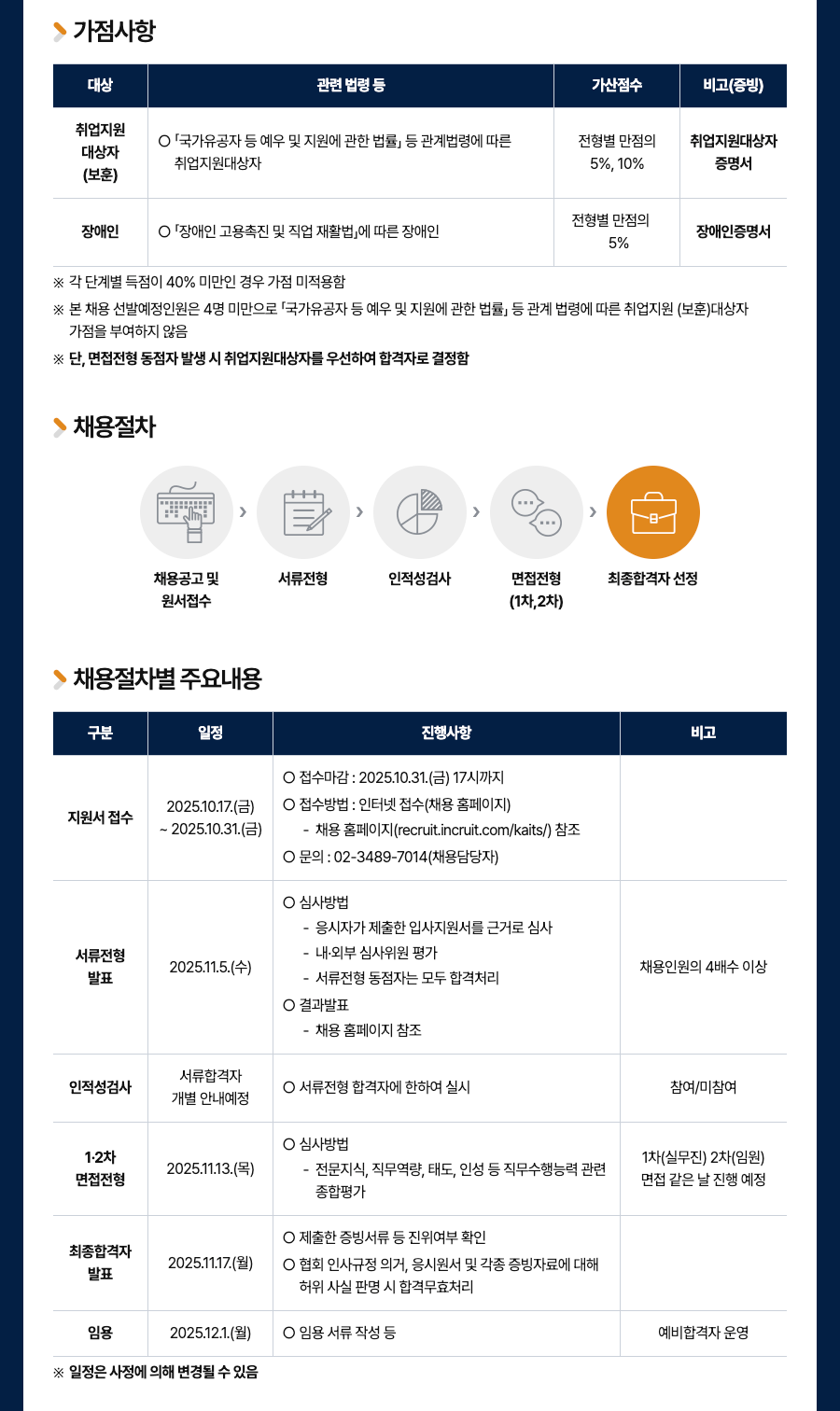 ¡Ø ÀÚ¼¼ÇÑ ³»¿ëÀº ä¿ë ȨÆäÀÌÁö (recruit.incruit.com/kaits/) °øÁö»çÇ× ÂüÁ¶