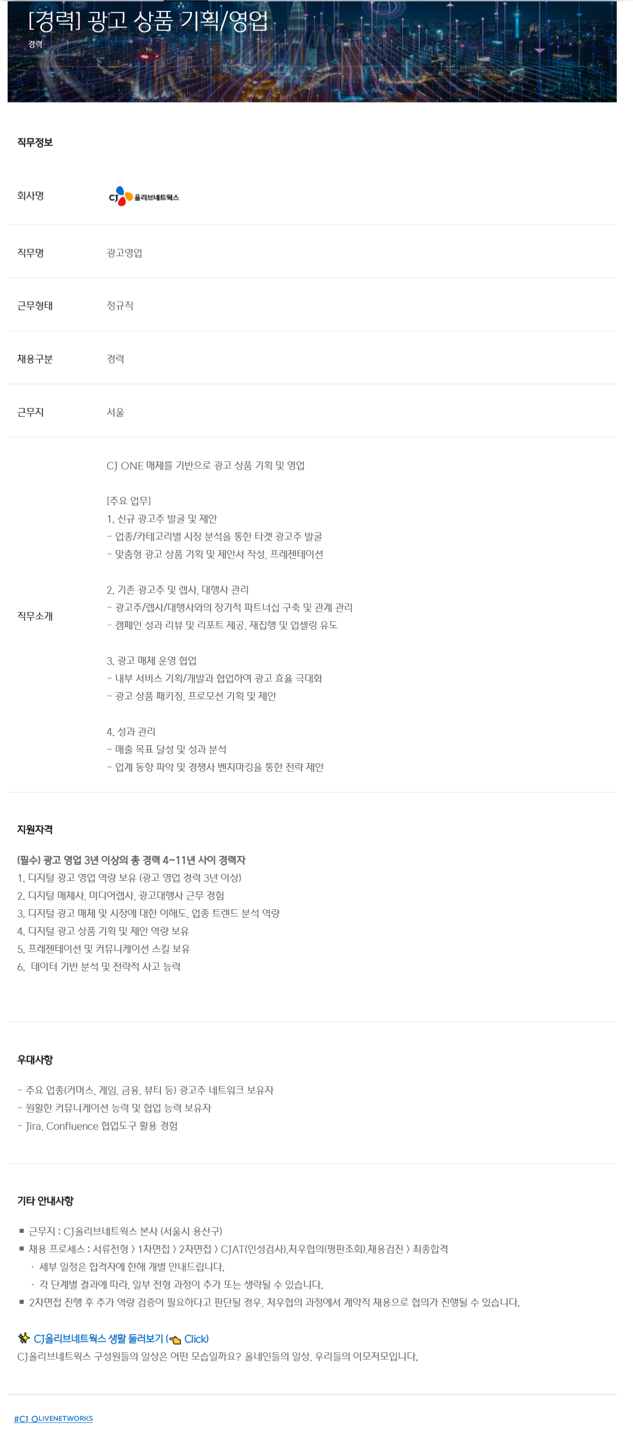 Á÷¹«¼Ò°³ CJ ONE ¸Åü¸¦ ±â¹ÝÀ¸·Î ±¤°í »óǰ ±âȹ ¹× ¿µ¾÷