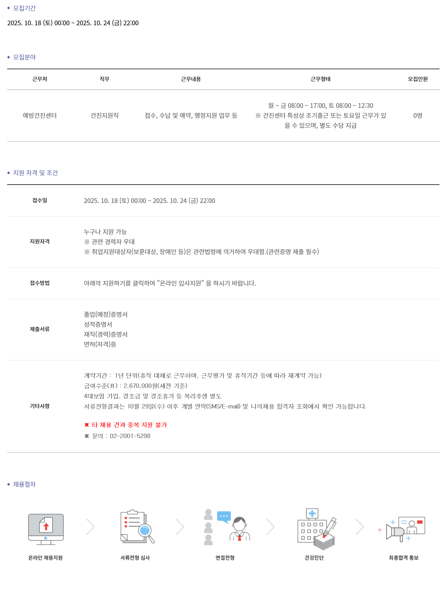 ±Ù¹«Ã³ Á÷¹« ±Ù¹«³»¿ë ±Ù¹«ÇüÅ ¸ðÁýÀοø ¿¹¹æ°ÇÁø¼¾ÅÍ °ÇÁøÁö¿øÁ÷ Á¢¼ö, ¼ö³³ ¹× ¿¹¾à, ÇàÁ¤Áö¿ø ¾÷¹« µî ¿ù ~ ±Ý 08:00 ~ 17:00, Åä 08:00 ~ 12:30 ¡Ø °ÇÁø¼¾ÅÍ Æ¯¼º»ó Á¶±âÃâ±Ù ¶Ç´Â Åä¿äÀÏ ±Ù¹«°¡ ÀÖÀ» ¼ö ÀÖÀ¸¸ç, º°µµ ¼ö´ç Áö±Þ 0¸í