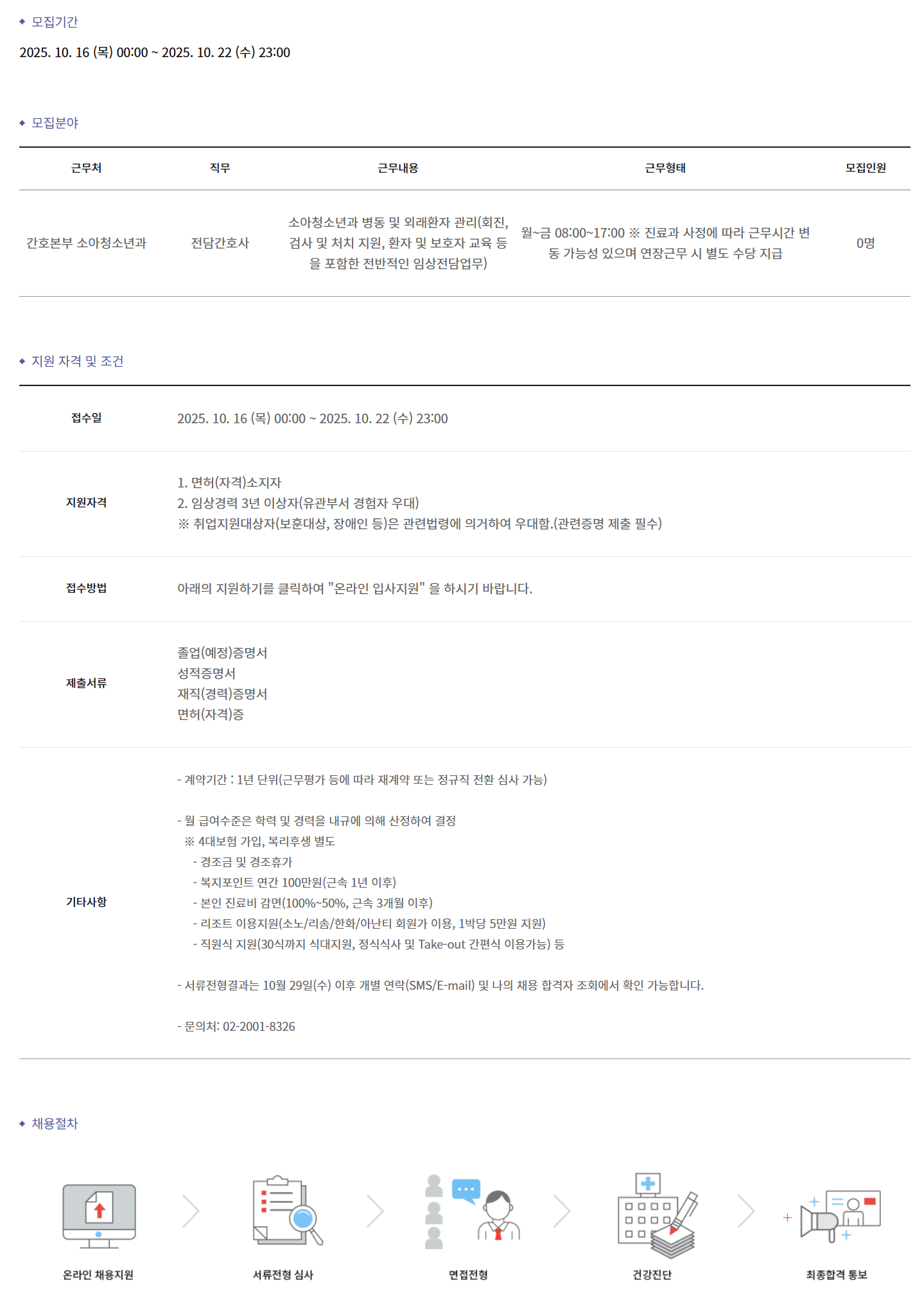 °£È£º»ºÎ ¼Ò¾ÆÃ»¼Ò³â°ú Àü´ã°£È£»ç ¼Ò¾ÆÃ»¼Ò³â°ú º´µ¿ ¹× ¿Ü·¡È¯ÀÚ °ü¸®(ȸÁø, °Ë»ç ¹× óġ Áö¿ø, ȯÀÚ ¹× º¸È£ÀÚ ±³À° µîÀ» Æ÷ÇÔÇÑ Àü¹ÝÀûÀÎ ÀÓ»óÀü´ã¾÷¹«) ¿ù~±Ý 08:00~17:00 ¡Ø Áø·á°ú »çÁ¤¿¡ µû¶ó ±Ù¹«½Ã°£ º¯µ¿ °¡´É¼º ÀÖÀ¸¸ç ¿¬Àå±Ù¹« ½Ã º°µµ ¼ö´ç Áö±Þ 0¸í
