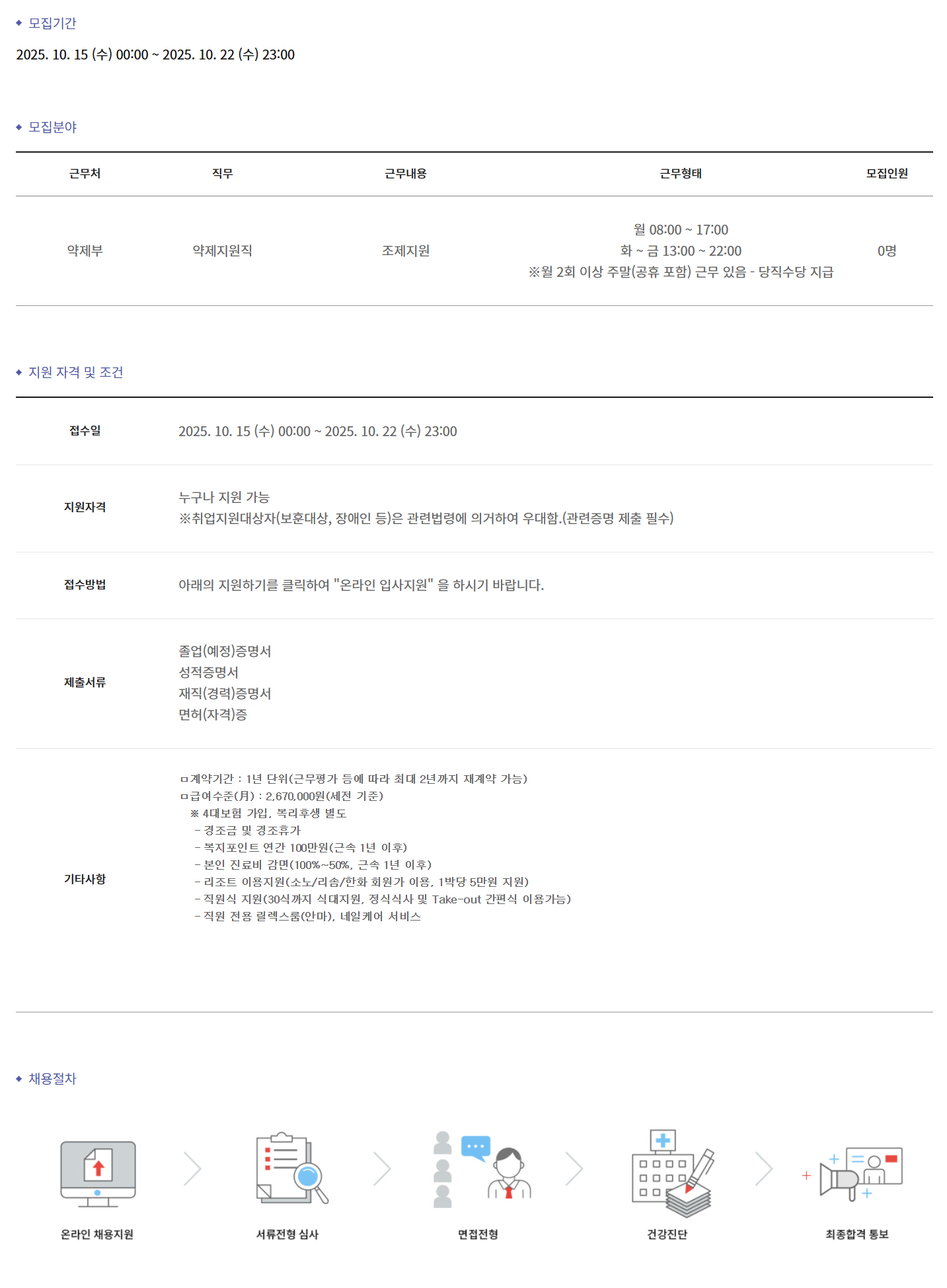 ±Ù¹«Ã³ Á÷¹« ±Ù¹«³»¿ë ±Ù¹«ÇüÅ ¸ðÁýÀοø ¾àÁ¦ºÎ ¾àÁ¦Áö¿øÁ÷ Á¶Á¦Áö¿ø ¿ù 08:00 ~ 17:00 È ~ ±Ý 13:00 ~ 22:00 ¡Ø¿ù 2ȸ ÀÌ»ó ÁÖ¸»(°øÈÞ Æ÷ÇÔ) ±Ù¹« ÀÖÀ½ - ´çÁ÷¼ö´ç Áö±Þ 0¸í