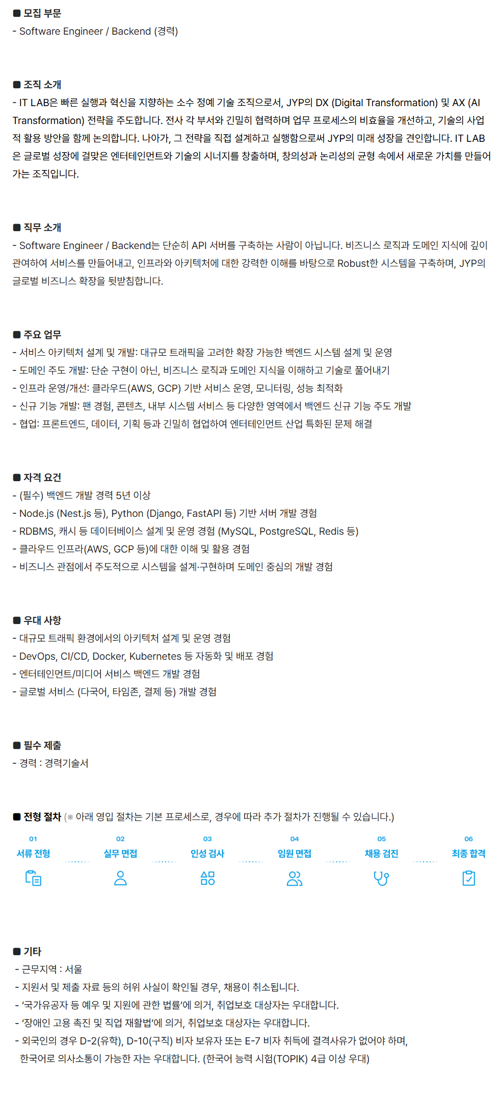 [JYP ENTERTAINMENT] Software Engineer / Backend (°æ·Â)