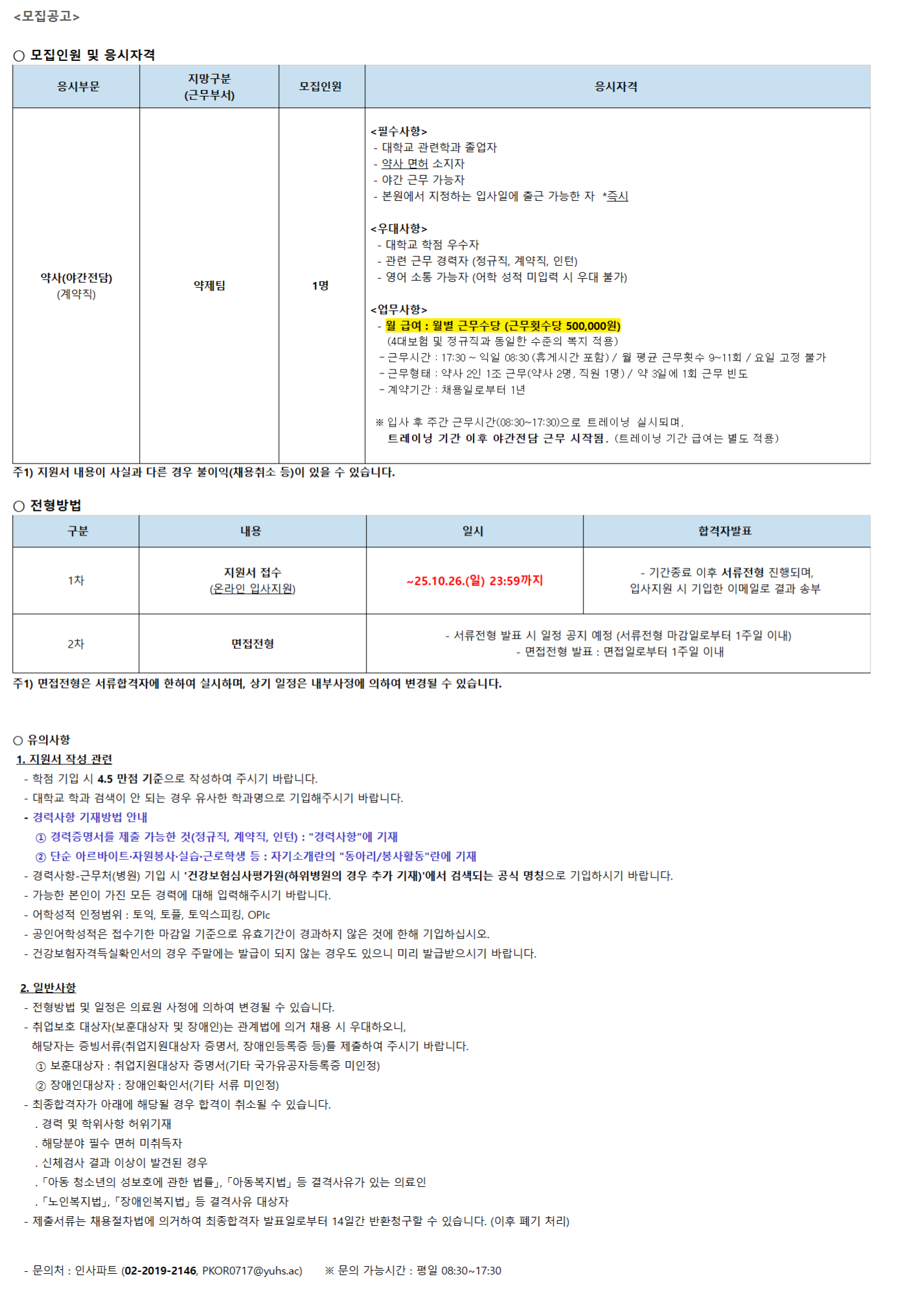 [ÀϹÝ-°³²] ¾à»ç(°è¾àÁ÷;¾ß°£Àü´ã) ¾àÁ¦ÆÀ 25.10-1 ¸ðÁý