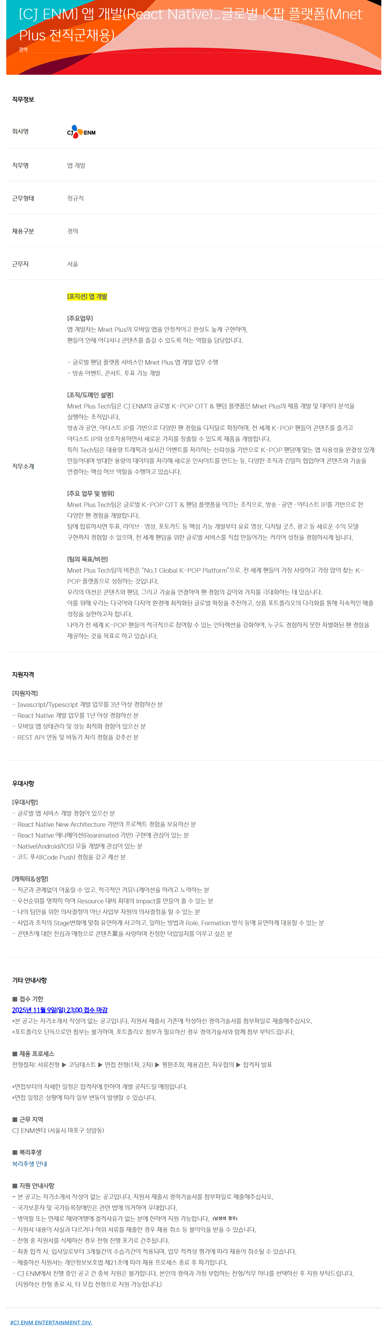 Mnet Plus TechÆÀÀº CJ ENMÀÇ ±Û·Î¹ú K-POP OTT & ÆÒ´ý Ç÷§ÆûÀÎ Mnet PlusÀÇ Á¦Ç° °³¹ß ¹× µ¥ÀÌÅÍ ºÐ¼®À» ½ÇÇàÇÏ´Â Á¶Á÷ÀÔ´Ï´Ù.