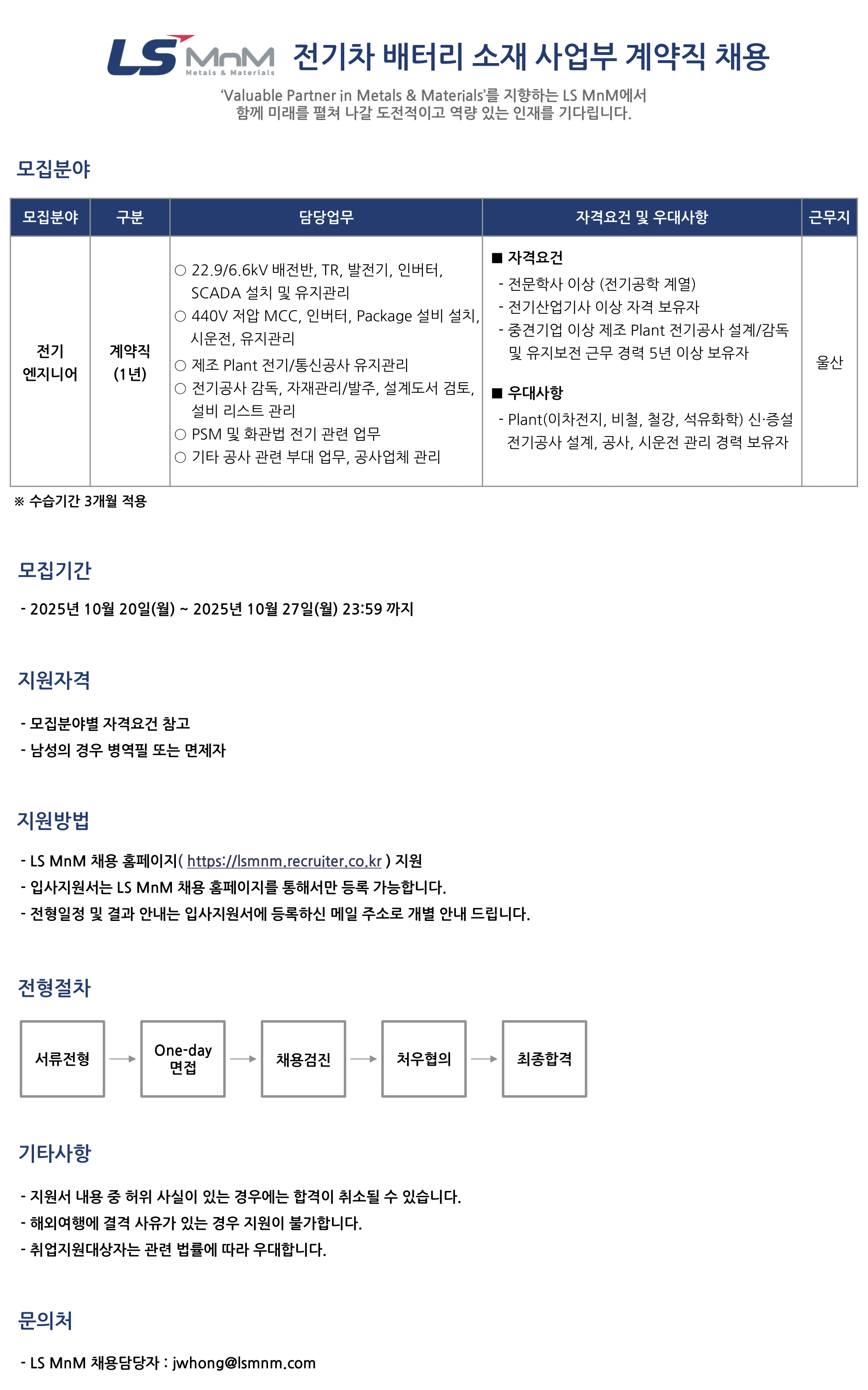 Àü±âÂ÷ ¹èÅ͸® ¼ÒÀç »ç¾÷ºÎ °è¾àÁ÷ ä¿ë [Àü±â ¿£Áö´Ï¾î]