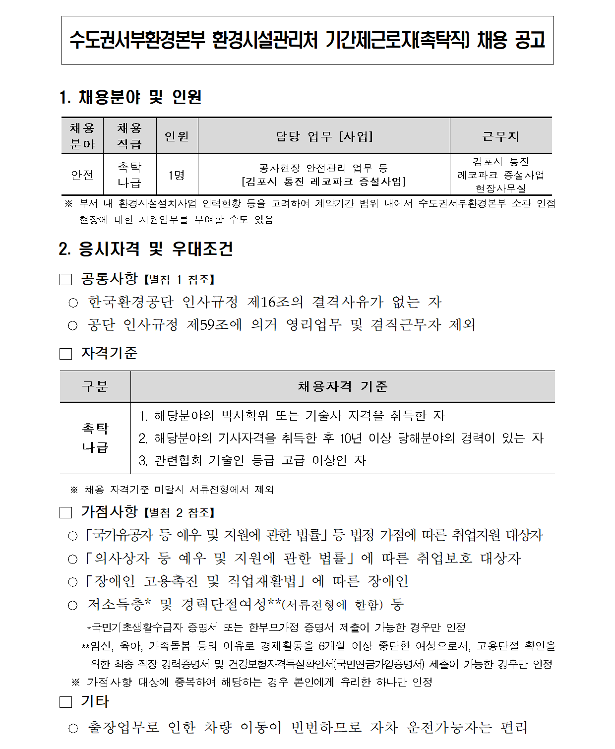 Çѱ¹È¯°æ°ø´Ü ¼öµµ±Ç¼ºÎȯ°æº»ºÎ ȯ°æ½Ã¼³°ü¸®Ã³ ±â°£Á¦±Ù·ÎÀÚ(ÃËŹÁ÷) ä¿ë °ø°í