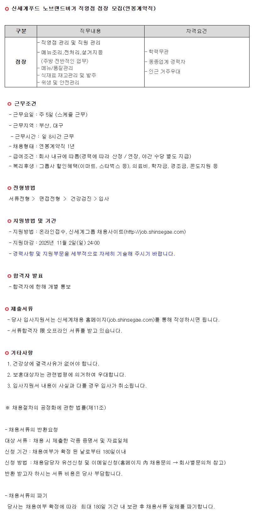 ½Å¼¼°èǪµå ³ëºê·£µå¹ö°Å Á÷¿µÁ¡ Á¡Àå ¸ðÁý(¿¬ºÀ°è¾àÁ÷) ±¸ºÐ Á÷¹«³»¿ë ÀÚ°Ý¿ä°Ç Á¡Àå - Á÷¿µÁ¡ °ü¸® ¹× Á÷¿ø °ü¸® - ¸Þ´ºÁ¶¸®,Àüó¸®,¼³°ÅÁöµî (ÁÖ¹æ Àü¹ÝÀûÀÎ ¾÷¹«) - ¸Þ´º/ǰÁú°ü¸® - ½ÄÀç·á Àç°í°ü¸® ¹× ¹ßÁÖ - À§»ý ¹× ¾ÈÀü°ü¸® - Çз¹«°ü - µ¿Á¾¾÷°è °æ·ÂÀÚ - Àα٠°ÅÁÖ¿ì´ë