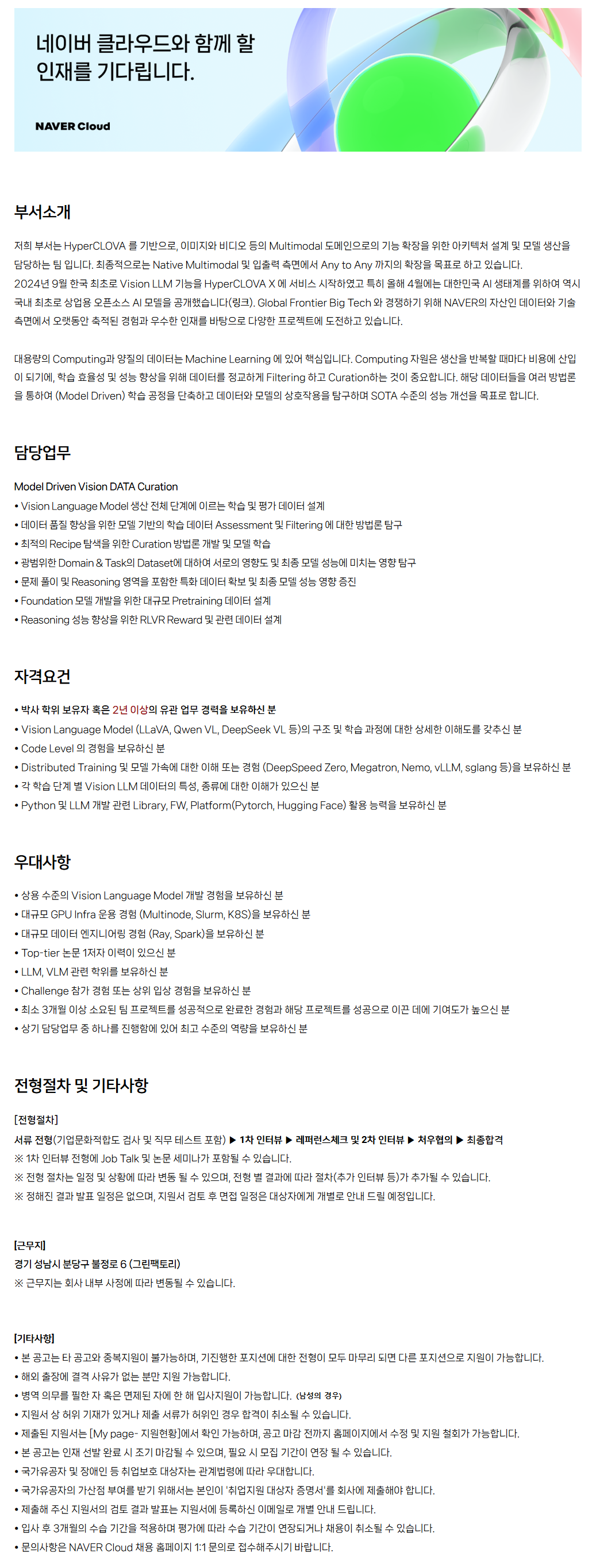 2024³â 9¿ù Çѱ¹ ÃÖÃÊ·Î Vision LLM ±â´ÉÀ» HyperCLOVA X ¿¡ ¼ºñ½º ½ÃÀÛÇÏ¿´°í ƯÈ÷ ¿ÃÇØ 4¿ù¿¡´Â ´ëÇѹα¹ AI »ýŰ踦 À§ÇÏ¿© ¿ª½Ã ±¹³» ÃÖÃÊ·Î »ó¾÷¿ë ¿ÀǼҽº AI ¸ðµ¨À» °ø°³Çß½À´Ï´Ù(¸µÅ©). Global Frontier Big Tech ¿Í °æÀïÇϱâ À§ÇØ NAVERÀÇ ÀÚ»êÀÎ µ¥ÀÌÅÍ¿Í ±â¼ú Ãø¸é¿¡¼ ¿À·§µ¿¾È ÃàÀûµÈ °æÇè°ú ¿ì¼öÇÑ ÀÎÀ縦 ¹ÙÅÁÀ¸·Î ´Ù¾çÇÑ ÇÁ·ÎÁ§Æ®¿¡ µµÀüÇϰí ÀÖ½À´Ï´Ù.