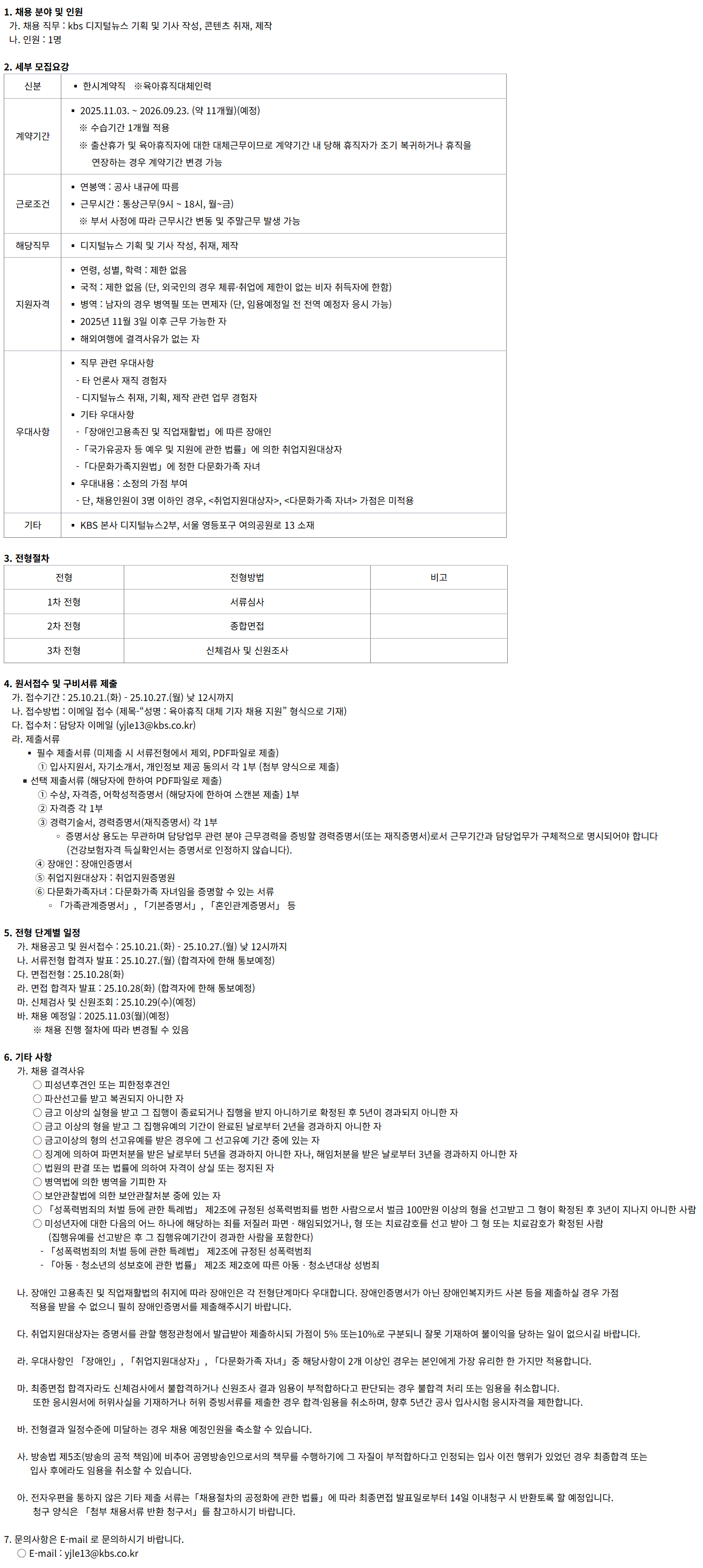 °¡. ä¿ë Á÷¹« : kbs µðÁöÅдº½º ±âȹ ¹× ±â»ç ÀÛ¼º, ÄÜÅÙÃ÷ ÃëÀç, Á¦ÀÛ