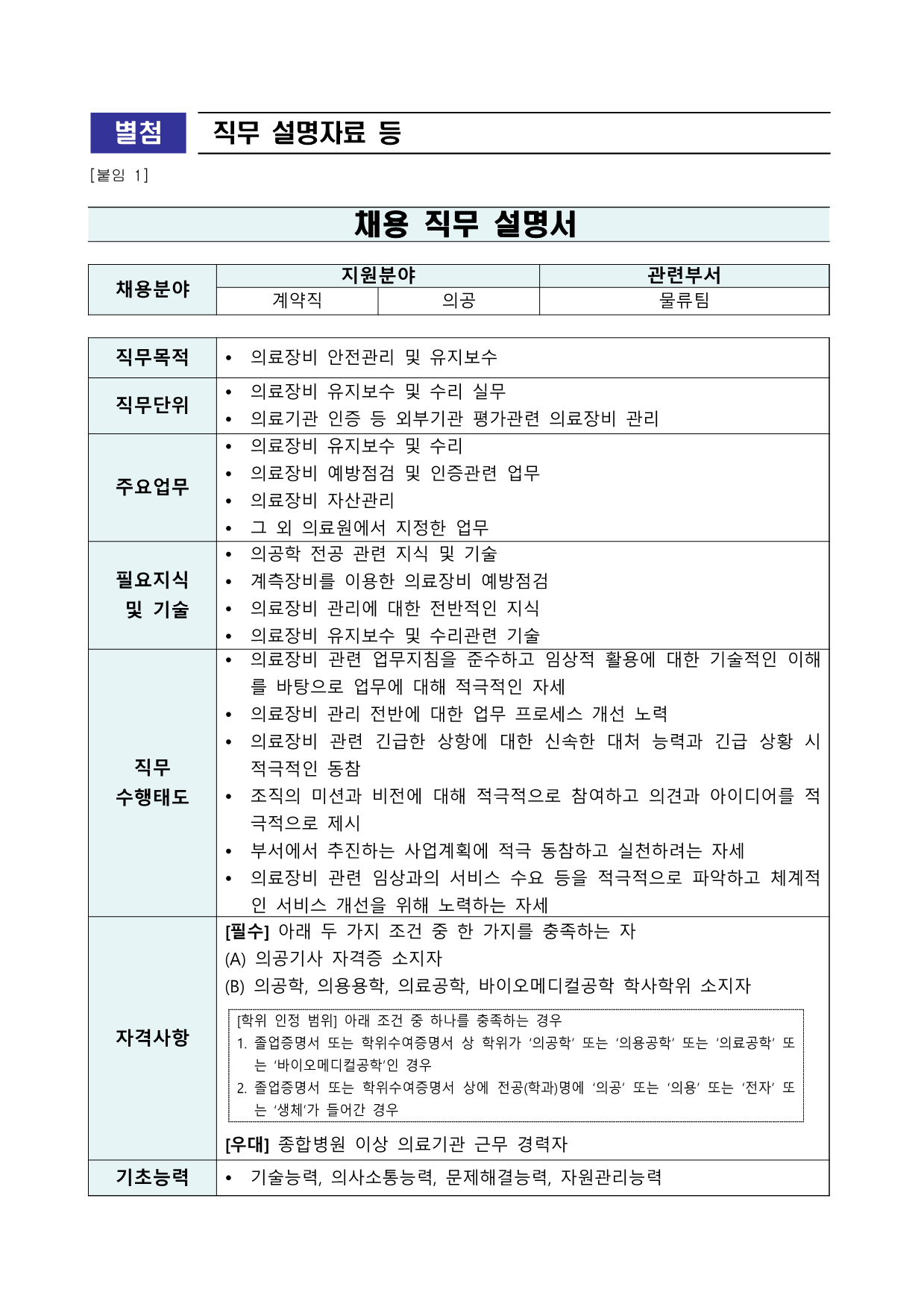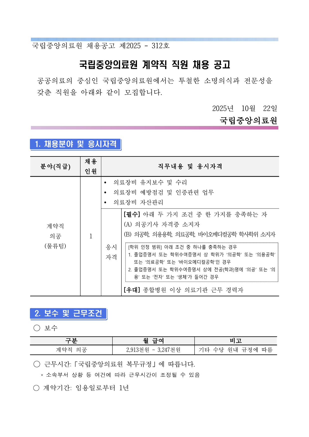 ±¹¸³Áß¾ÓÀÇ·á¿ø ä¿ë°ø°í Á¦2025 - 312È£ ±¹¸³Áß¾ÓÀÇ·á¿ø °è¾àÁ÷ Á÷¿ø ä¿ë °ø°í °ø°øÀÇ·áÀÇ Áß½ÉÀÎ ±¹¸³Áß¾ÓÀÇ·á¿ø¿¡¼´Â ÅõöÇÑ ¼Ò¸íÀǽİú Àü¹®¼ºÀ»°®Ãá Á÷¿øÀ» ¾Æ·¡¿Í °°ÀÌ ¸ðÁýÇÕ´Ï´Ù. 2025³â 10¿ù 22Àϱ¹¸³Áß¾ÓÀÇ·á¿ø1. ä¿ëºÐ¾ß ¹× ÀÀ½ÃÀÚ°Ý 2. º¸¼ö ¹× ±Ù¹«Á¶°Ç ¡Û º¸¼ö ¡Û ±Ù¹«½Ã°£:¡¸±¹¸³Áß¾ÓÀÇ·á¿ø º¹¹«±ÔÁ¤¡¹¿¡ µû¸¨´Ï´Ù. * ¼Ò¼ÓºÎ¼ »óȲ µî ¿©°Ç¿¡ µû¶ó ±Ù¹«½Ã°£ÀÌ Á¶Á¤µÉ ¼ö ÀÖÀ½ ¡Û °è¾à±â°£: ÀÓ¿ëÀϷκÎÅÍ 1³â ±¸ºÐ ¿ù ±Þ¿© ºñ°í °è¾àÁ÷ Àǰø 2,913õ¿ø ~ 3,247õ¿ø ±âŸ ¼ö´ç ¿ø³» ±ÔÁ¤¿¡ µû¸§ºÐ¾ß(Á÷±Þ) ä¿ë Àοø Á÷¹«³»¿ë ¹× ÀÀ½ÃÀÚ°Ý °è¾àÁ÷ Àǰø (¹°·ùÆÀ) 1 Ÿ ÀÇ·áÀåºñ À¯Áöº¸¼ö ¹× ¼ö¸® Ÿ ÀÇ·áÀåºñ ¿¹¹æÁ¡°Ë ¹× ÀÎÁõ°ü·Ã ¾÷¹« Ÿ ÀÇ·áÀåºñ ÀÚ»ê°ü¸® ÀÀ½Ã ÀÚ°Ý [Çʼö] ¾Æ·¡ µÎ °¡Áö Á¶°Ç Áß ÇÑ °¡Áö¸¦ ÃæÁ·ÇÏ´Â ÀÚ(A) Àǰø±â»ç ÀÚ°ÝÁõ ¼ÒÁöÀÚ (B) ÀǰøÇÐ, ÀÇ¿ë¿ëÇÐ, ÀÇ·á°øÇÐ, ¹ÙÀÌ¿À¸ÞµðÄðøÇÐ ÇлçÇÐÀ§ ¼ÒÁöÀÚ [ÇÐÀ§ ÀÎÁ¤ ¹üÀ§] ¾Æ·¡ Á¶°Ç Áß Çϳª¸¦ ÃæÁ·ÇÏ´Â °æ¿ì 1. Á¹¾÷Áõ¸í¼ ¶Ç´Â ÇÐÀ§¼ö¿©Áõ¸í¼ »ó ÇÐÀ§°¡ ¡®ÀǰøÇС¯ ¶Ç´Â ¡®ÀÇ¿ë°øÇС¯ ¶Ç´Â ¡®ÀÇ·á°øÇС¯ ¶Ç´Â ¡®¹ÙÀÌ¿À¸ÞµðÄðøÇС¯ÀÎ °æ¿ì 2. Á¹¾÷Áõ¸í¼ ¶Ç´Â ÇÐÀ§¼ö¿©Áõ¸í¼ »ó¿¡ Àü°ø(Çаú)¸í¿¡ ¡®Àǰø¡¯ ¶Ç´Â ¡®Àǿ롯 ¶Ç´Â ¡®ÀüÀÚ¡¯ ¶Ç´Â ¡®»ýü¡¯°¡ µé¾î°£ °æ¿ì [¿ì´ë] Á¾ÇÕº´¿ø ÀÌ»ó ÀÇ·á±â°ü ±Ù¹« °æ·ÂÀÚ