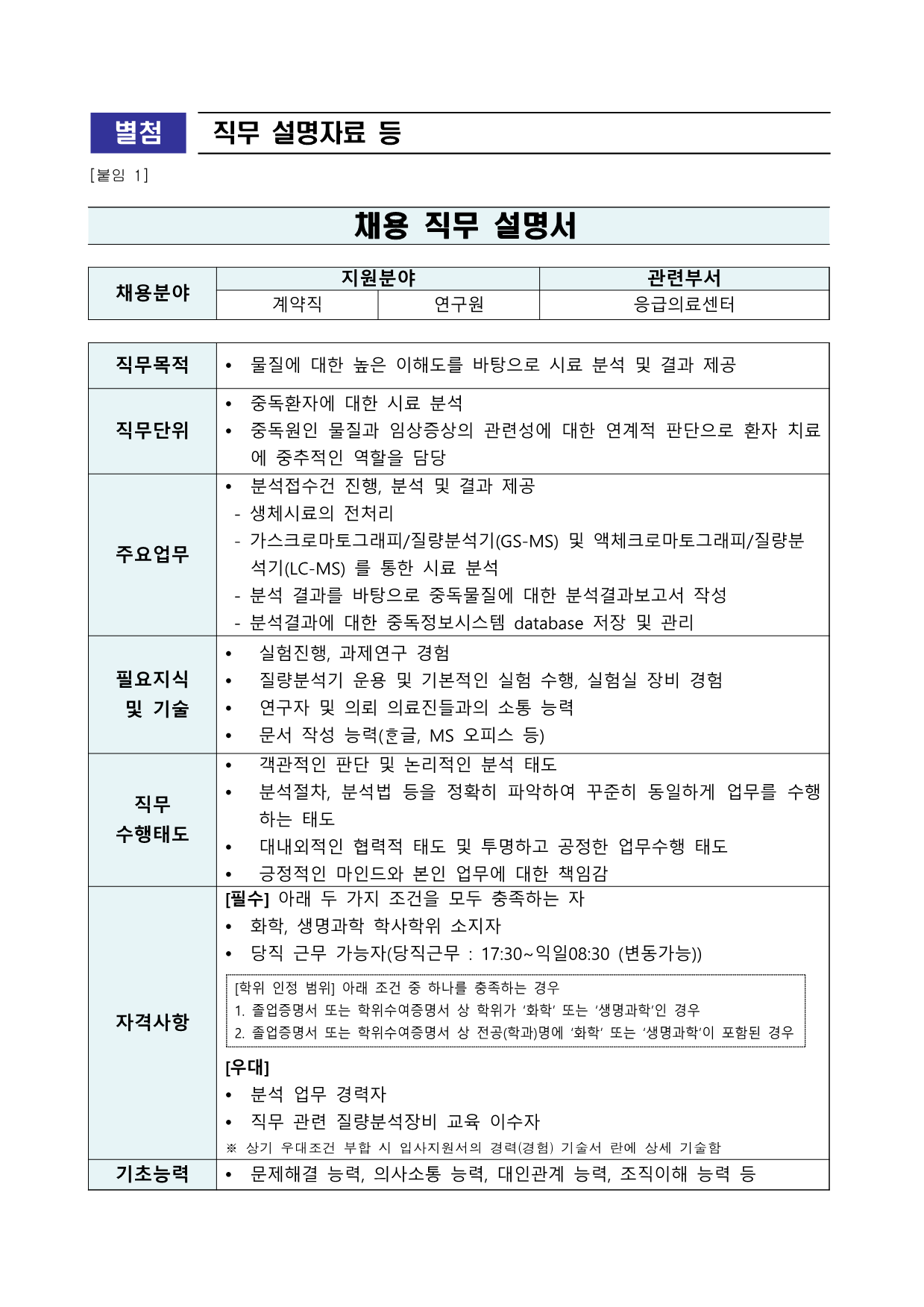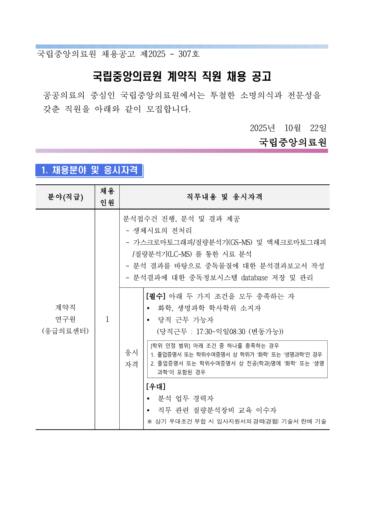 ±¹¸³Áß¾ÓÀÇ·á¿ø ä¿ë°ø°í Á¦2025 - 307È£ ±¹¸³Áß¾ÓÀÇ·á¿ø °è¾àÁ÷ Á÷¿ø ä¿ë °ø°í °ø°øÀÇ·áÀÇ Áß½ÉÀÎ ±¹¸³Áß¾ÓÀÇ·á¿ø¿¡¼´Â ÅõöÇÑ ¼Ò¸íÀǽİú Àü¹®¼ºÀ»°®Ãá Á÷¿øÀ» ¾Æ·¡¿Í °°ÀÌ ¸ðÁýÇÕ´Ï´Ù. 2025³â 10¿ù 22Àϱ¹¸³Áß¾ÓÀÇ·á¿ø1. ä¿ëºÐ¾ß ¹× ÀÀ½ÃÀÚ°Ý ºÐ¾ß(Á÷±Þ) ä¿ë Àοø Á÷¹«³»¿ë ¹× ÀÀ½ÃÀÚ°Ý °è¾àÁ÷ ¿¬±¸¿ø (ÀÀ±ÞÀÇ·á¼¾ÅÍ) 1 ºÐ¼®Á¢¼ö°Ç ÁøÇà, ºÐ¼® ¹× °á°ú Á¦°ø - »ýü½Ã·áÀÇ Àüó¸® - °¡½ºÅ©·Î¸¶Åä±×·¡ÇÇ/Áú·®ºÐ¼®±â(GS-MS) ¹× ¾×üũ·Î¸¶Åä±×·¡ÇÇ /Áú·®ºÐ¼®±â(LC-MS) ¸¦ ÅëÇÑ ½Ã·á ºÐ¼® - ºÐ¼® °á°ú¸¦ ¹ÙÅÁÀ¸·Î Áßµ¶¹°Áú¿¡ ´ëÇÑ ºÐ¼®°á°úº¸°í¼ ÀÛ¼º- ºÐ¼®°á°ú¿¡ ´ëÇÑ Áßµ¶Á¤º¸½Ã½ºÅÛ database ÀúÀå ¹× °ü¸®ÀÀ½Ã ÀÚ°Ý [Çʼö] ¾Æ·¡ µÎ °¡Áö Á¶°ÇÀ» ¸ðµÎ ÃæÁ·ÇÏ´Â ÀÚ Ÿ ÈÇÐ, »ý¸í°úÇÐ ÇлçÇÐÀ§ ¼ÒÁöÀÚ Ÿ ´çÁ÷ ±Ù¹« °¡´ÉÀÚ (´çÁ÷±Ù¹« : 17:30~ÀÍÀÏ08:30 (º¯µ¿°¡´É)) [ÇÐÀ§ ÀÎÁ¤ ¹üÀ§] ¾Æ·¡ Á¶°Ç Áß Çϳª¸¦ ÃæÁ·ÇÏ´Â °æ¿ì 1. Á¹¾÷Áõ¸í¼ ¶Ç´Â ÇÐÀ§¼ö¿©Áõ¸í¼ »ó ÇÐÀ§°¡ ¡®ÈÇС¯ ¶Ç´Â ¡®»ý¸í°úÇС¯ÀÎ °æ¿ì 2. Á¹¾÷Áõ¸í¼ ¶Ç´Â ÇÐÀ§¼ö¿©Áõ¸í¼ »ó Àü°ø(Çаú)¸í¿¡ ¡®ÈÇС¯ ¶Ç´Â ¡®»ý¸í°úÇС¯ÀÌ Æ÷ÇÔµÈ °æ¿ì [¿ì´ë] Ÿ ºÐ¼® ¾÷¹« °æ·ÂÀÚ Ÿ Á÷¹« °ü·Ã Áú·®ºÐ¼®Àåºñ ±³À° À̼öÀÚ ¡Ø »ó±â ¿ì´ëÁ¶°Ç ºÎÇÕ ½Ã ÀÔ»çÁö¿ø¼ÀÇ °æ·Â(°æÇè) ±â¼ú¼ ¶õ¿¡ ±â¼ú
