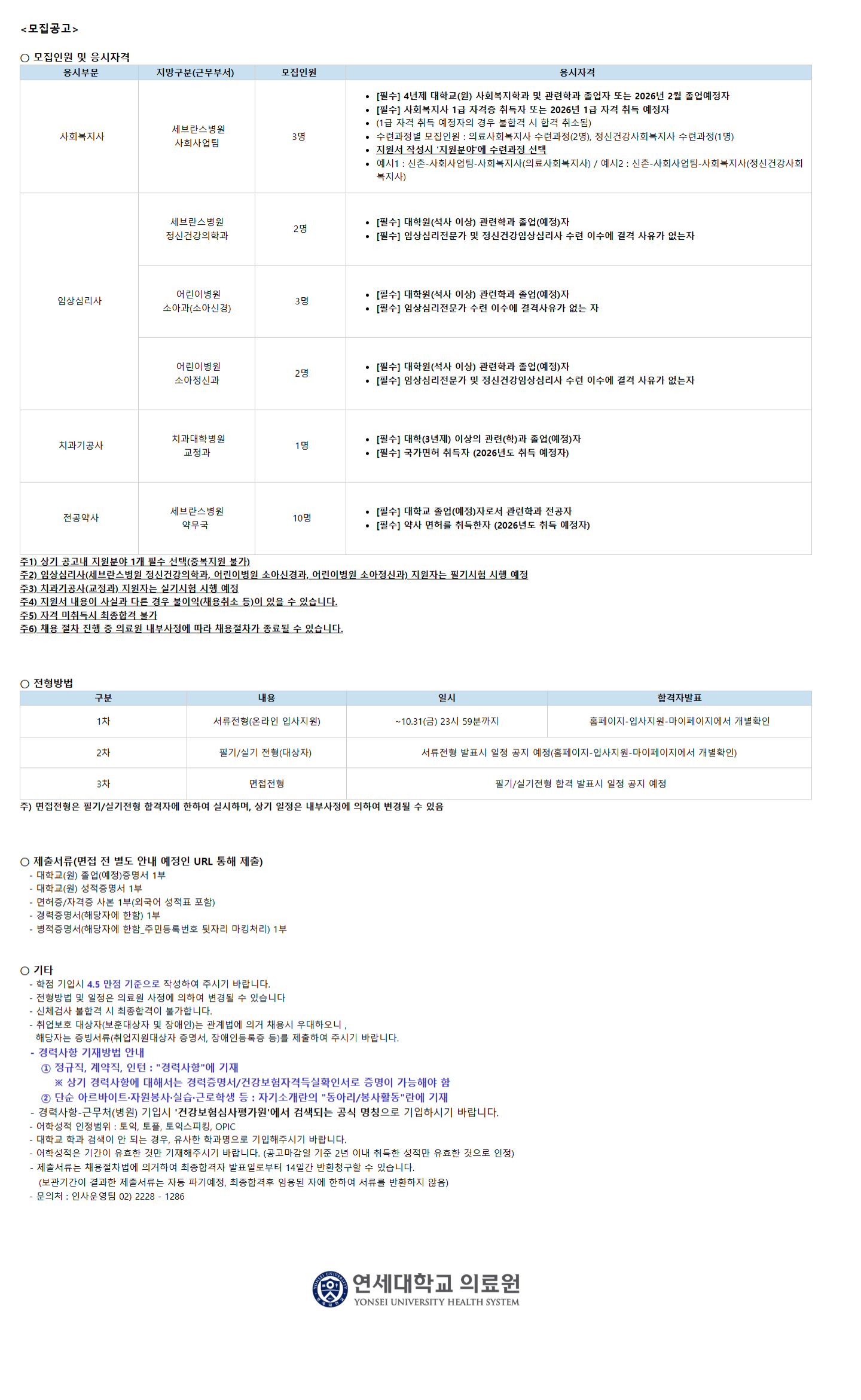 ÀÀ½ÃºÎ¹® Áö¸Á±¸ºÐ(±Ù¹«ºÎ¼­) ¸ðÁýÀοø ÀÀ½ÃÀÚ°Ý »çȸº¹Áö»ç ¼¼ºê¶õ½ºº´¿ø »çȸ»ç¾÷ÆÀ 3¸í [Çʼö] 4³âÁ¦ ´ëÇб³(¿ø) »çȸº¹ÁöÇаú ¹× °ü·ÃÇаú Á¹¾÷ÀÚ ¶Ç´Â 2026³â 2¿ù Á¹¾÷¿¹Á¤ÀÚ [Çʼö] »çȸº¹Áö»ç 1±Þ ÀÚ°ÝÁõ ÃëµæÀÚ ¶Ç´Â 2026³â 1±Þ ÀÚ°Ý Ãëµæ ¿¹Á¤ÀÚ (1±Þ ÀÚ°Ý Ãëµæ ¿¹Á¤ÀÚÀÇ °æ¿ì ºÒÇÕ°Ý ½Ã ÇÕ°Ý Ãë¼ÒµÊ) ¼ö·Ã°úÁ¤º° ¸ðÁýÀοø : ÀÇ·á»çȸº¹Áö»ç ¼ö·Ã°úÁ¤(2¸í), Á¤½Å°Ç°­»çȸº¹Áö»ç ¼ö·Ã°úÁ¤(1¸í) Áö¿ø¼­ ÀÛ¼º½Ã 'Áö¿øºÐ¾ß'¿¡ ¼ö·Ã°úÁ¤ ¼±Åà ¿¹½Ã1 : ½ÅÃÌ-»çȸ»ç¾÷ÆÀ-»çȸº¹Áö»ç(ÀÇ·á»çȸº¹Áö»ç) / ¿¹½Ã2 : ½ÅÃÌ-»çȸ»ç¾÷ÆÀ-»çȸº¹Áö»ç(Á¤½Å°Ç°­»çȸº¹Áö»ç) ÀÓ»ó½É¸®»ç ¼¼ºê¶õ½ºº´¿ø Á¤½Å°Ç°­ÀÇÇаú 2¸í [Çʼö] ´ëÇпø(¼®»ç ÀÌ»ó) °ü·ÃÇаú Á¹¾÷(¿¹Á¤)ÀÚ [Çʼö] ÀÓ»ó½É¸®Àü¹®°¡ ¹× Á¤½Å°Ç°­ÀÓ»ó½É¸®»ç ¼ö·Ã À̼ö¿¡ °á°Ý »çÀ¯°¡ ¾ø´ÂÀÚ ¾î¸°À̺´¿ø ¼Ò¾Æ°ú(¼Ò¾Æ½Å°æ) 3¸í [Çʼö] ´ëÇпø(¼®»ç ÀÌ»ó) °ü·ÃÇаú Á¹¾÷(¿¹Á¤)ÀÚ [Çʼö] ÀÓ»ó½É¸®Àü¹®°¡ ¼ö·Ã À̼ö¿¡ °á°Ý»çÀ¯°¡ ¾ø´Â ÀÚ ¾î¸°À̺´¿ø ¼Ò¾ÆÁ¤½Å°ú 2¸í [Çʼö] ´ëÇпø(¼®»ç ÀÌ»ó) °ü·ÃÇаú Á¹¾÷(¿¹Á¤)ÀÚ [Çʼö] ÀÓ»ó½É¸®Àü¹®°¡ ¹× Á¤½Å°Ç°­ÀÓ»ó½É¸®»ç ¼ö·Ã À̼ö¿¡ °á°Ý »çÀ¯°¡ ¾ø´ÂÀÚ Ä¡°ú±â°ø»ç Ä¡°ú´ëÇк´¿ø ±³Á¤°ú 1¸í [Çʼö] ´ëÇÐ(3³âÁ¦) ÀÌ»óÀÇ °ü·Ã(ÇÐ)°ú Á¹¾÷(¿¹Á¤)ÀÚ [Çʼö] ±¹°¡¸éÇã ÃëµæÀÚ (2026³âµµ Ãëµæ ¿¹Á¤ÀÚ) Àü°ø¾à»ç ¼¼ºê¶õ½ºº´¿ø ¾à¹«±¹ 10¸í [Çʼö] ´ëÇб³ Á¹¾÷(¿¹Á¤)Àڷμ­ °ü·ÃÇаú Àü°øÀÚ [Çʼö] ¾à»ç ¸éÇ㸦 ÃëµæÇÑÀÚ (2026³âµµ Ãëµæ ¿¹Á¤ÀÚ)