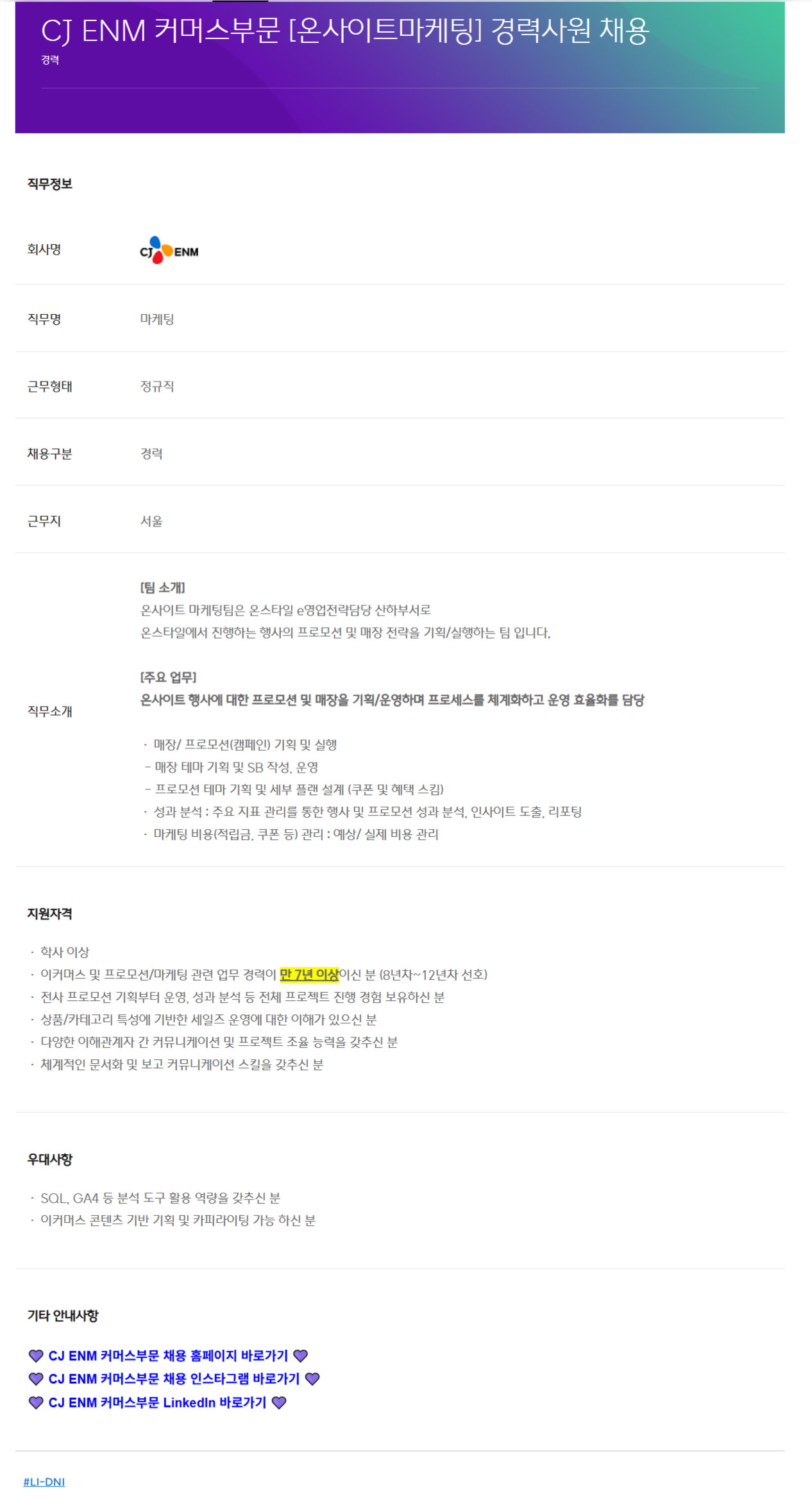 CJ ENM Ä¿¸Ó½ººÎ¹® [¿Â»çÀÌÆ®¸¶ÄÉÆÃ] °æ·Â»ç¿ø ä¿ë