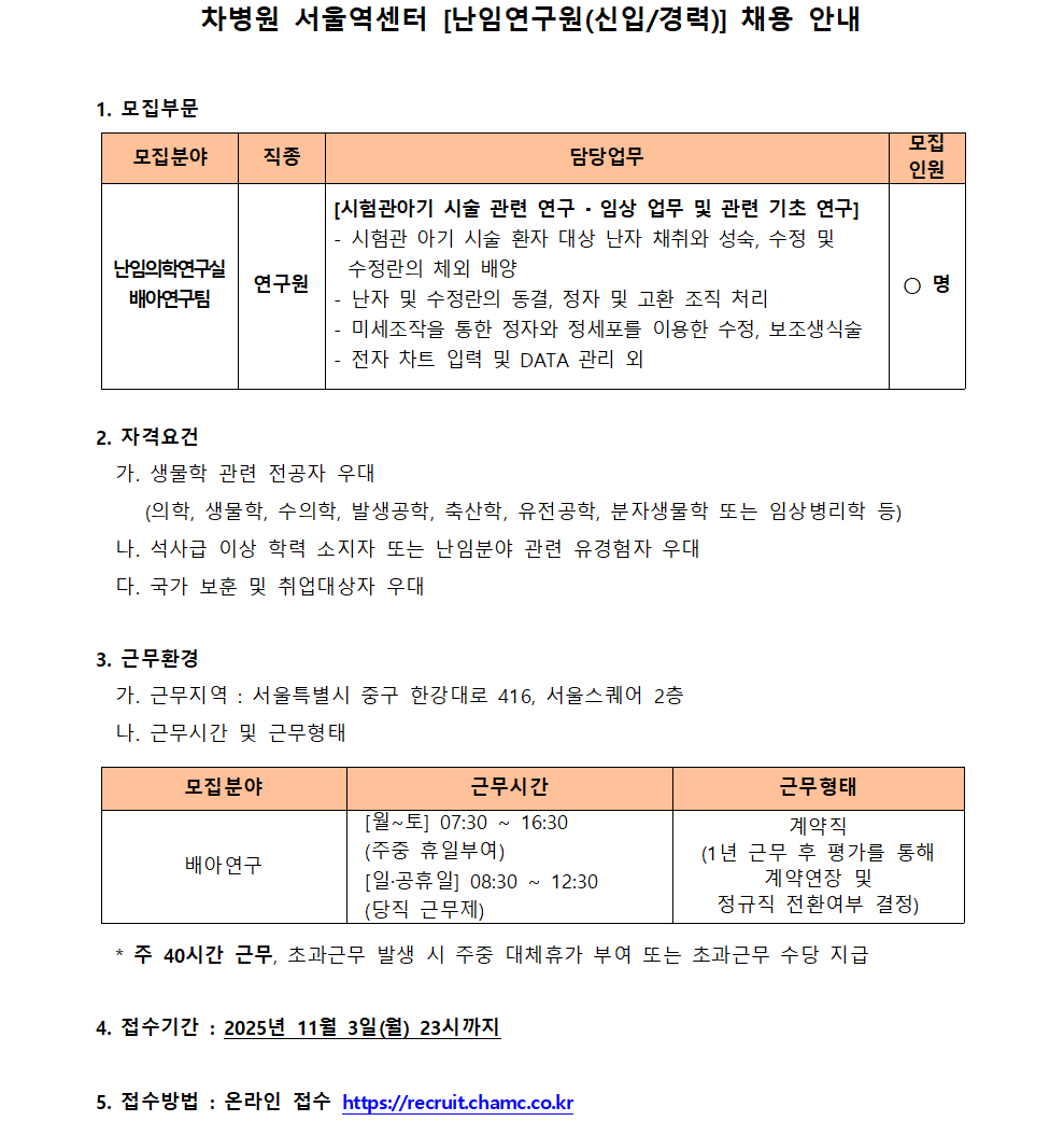 [Â÷¿©¼ºÀÇÇבּ¸¼Ò ¼­¿ï¿ª¼¾ÅÍ] Â÷º´¿ø ¼­¿ï¿ª¼¾ÅÍ ³­ÀÓ¿¬±¸¿ø ä¿ë ¾È³»