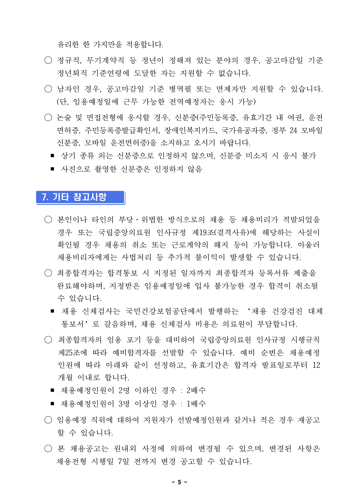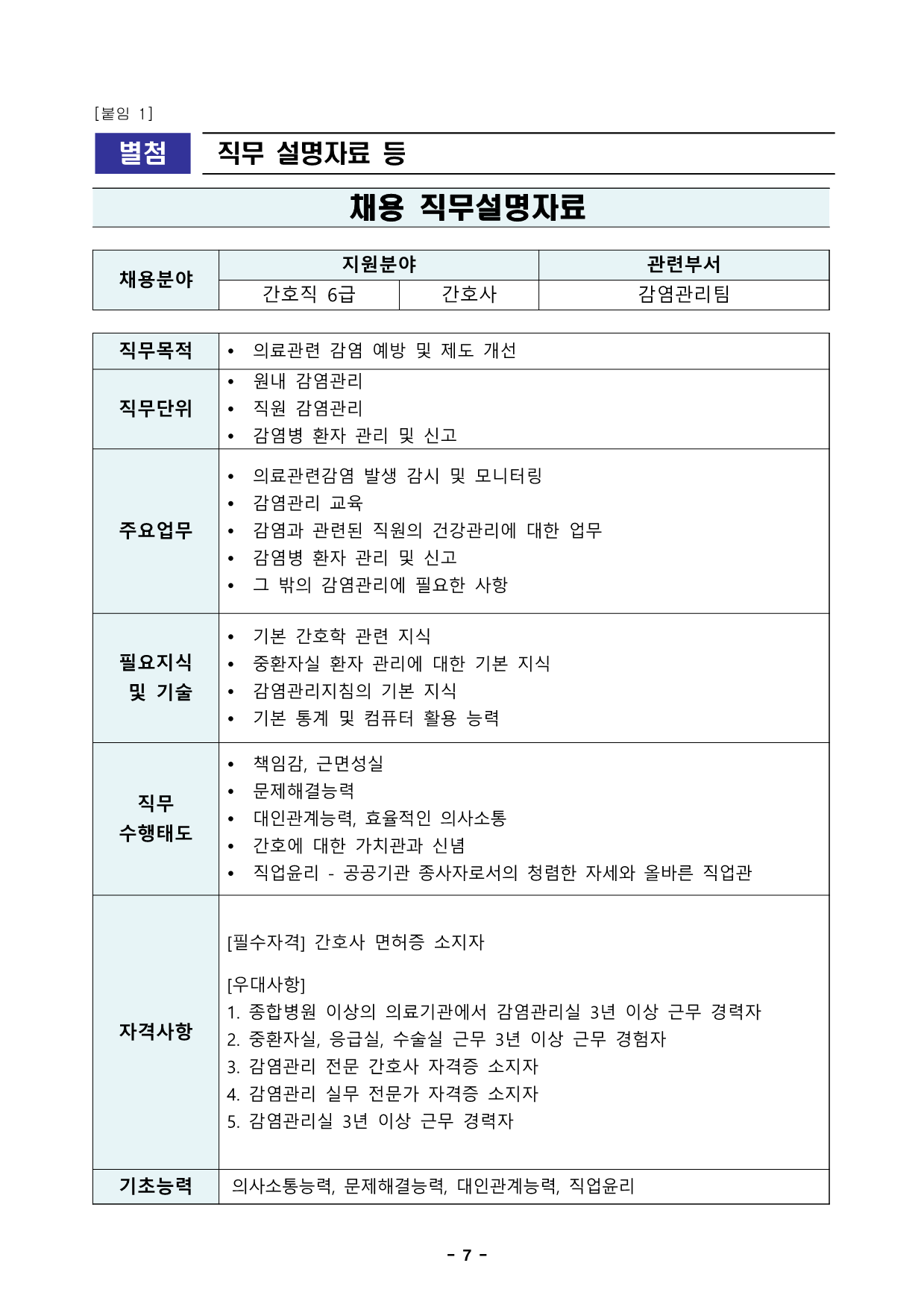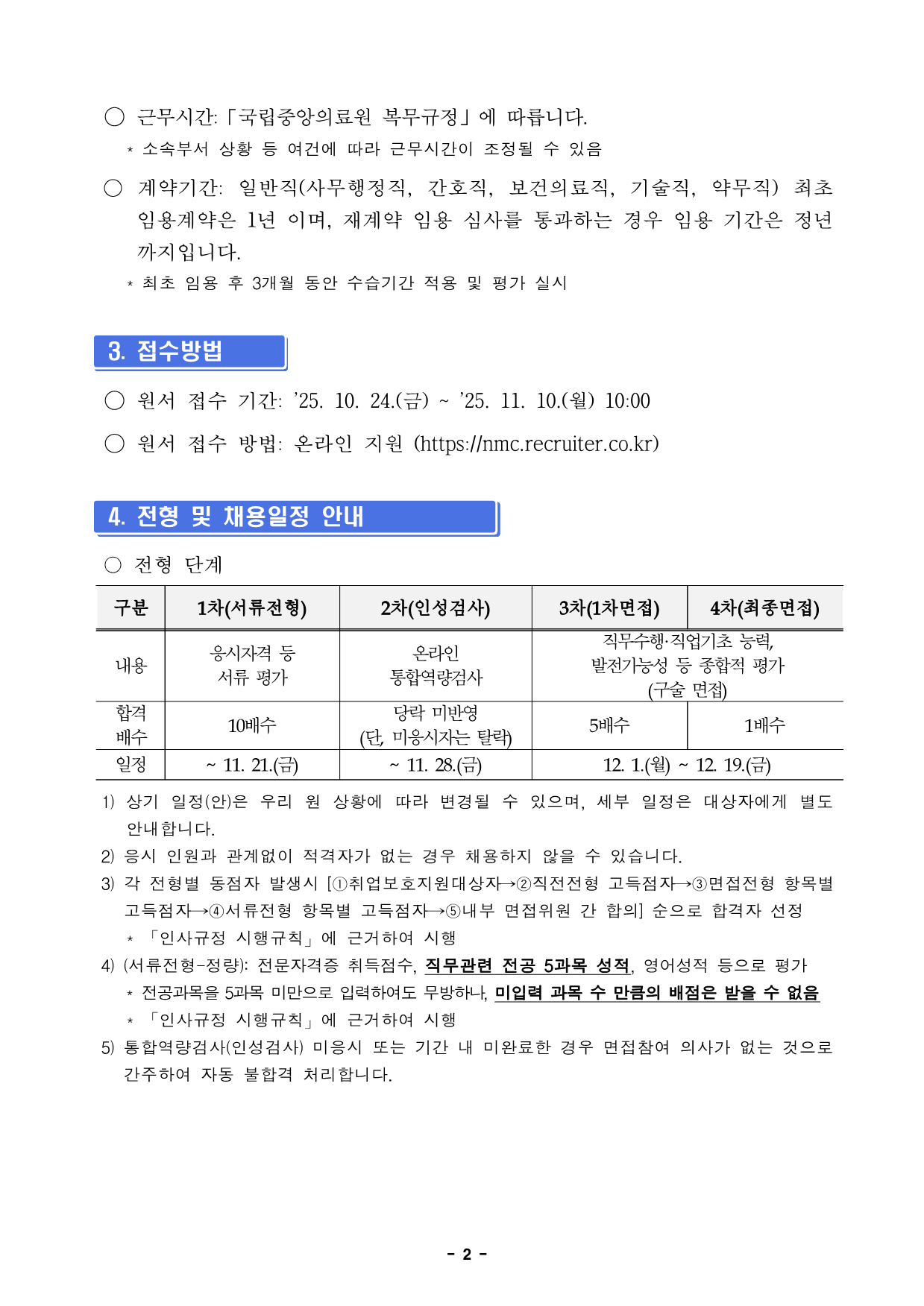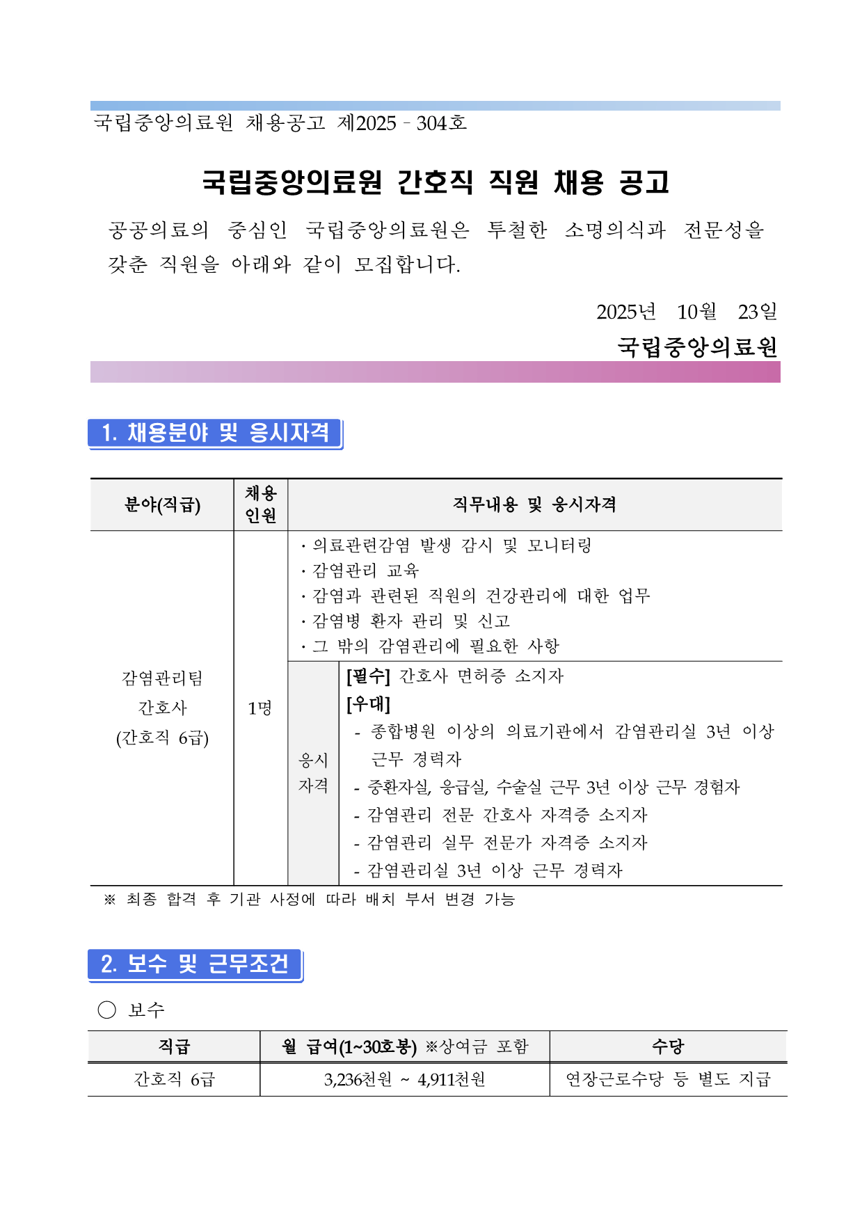 ±¹¸³Áß¾ÓÀÇ·á¿ø ä¿ë°ø°í Á¦2025–304È£ ±¹¸³Áß¾ÓÀÇ·á¿ø °£È£Á÷ Á÷¿ø ä¿ë °ø°í °ø°øÀÇ·áÀÇ Áß½ÉÀÎ ±¹¸³Áß¾ÓÀÇ·á¿øÀº ÅõöÇÑ ¼Ò¸íÀǽİú Àü¹®¼ºÀ» °®Ãá Á÷¿øÀ» ¾Æ·¡¿Í °°ÀÌ ¸ðÁýÇÕ´Ï´Ù. 2025³â 10¿ù 23Àϱ¹¸³Áß¾ÓÀÇ·á¿ø1. ä¿ëºÐ¾ß ¹× ÀÀ½ÃÀÚ°Ý 2. º¸¼ö ¹× ±Ù¹«Á¶°Ç ¡Û º¸¼ö Á÷±Þ ¿ù ±Þ¿©(1~30È£ºÀ) ¡Ø»ó¿©±Ý Æ÷ÇÔ ¼ö´ç °£È£Á÷ 6±Þ 3,236õ¿ø ~ 4,911õ¿ø ¿¬Àå±Ù·Î¼ö´ç µî º°µµ Áö±ÞºÐ¾ß(Á÷±Þ) ä¿ë Àοø Á÷¹«³»¿ë ¹× ÀÀ½ÃÀÚ°Ý °¨¿°°ü¸®ÆÀ °£È£»ç (°£È£Á÷ 6±Þ) 1¸í ¤ýÀÇ·á°ü·Ã°¨¿° ¹ß»ý °¨½Ã ¹× ¸ð´ÏÅ͸µ ¤ý°¨¿°°ü¸® ±³À° ¤ý°¨¿°°ú °ü·ÃµÈ Á÷¿øÀÇ °Ç°°ü¸®¿¡ ´ëÇÑ ¾÷¹« ¤ý°¨¿°º´ ȯÀÚ °ü¸® ¹× ½Å°í ¤ý±× ¹ÛÀÇ °¨¿°°ü¸®¿¡ ÇÊ¿äÇÑ »çÇ× ÀÀ½Ã ÀÚ°Ý [Çʼö] °£È£»ç ¸éÇãÁõ ¼ÒÁöÀÚ [¿ì´ë] - Á¾ÇÕº´¿ø ÀÌ»óÀÇ ÀÇ·á±â°ü¿¡¼ °¨¿°°ü¸®½Ç 3³â ÀÌ»ó ±Ù¹« °æ·ÂÀÚ - ÁßȯÀÚ½Ç, ÀÀ±Þ½Ç, ¼ö¼ú½Ç ±Ù¹« 3³â ÀÌ»ó ±Ù¹« °æÇèÀÚ- °¨¿°°ü¸® Àü¹® °£È£»ç ÀÚ°ÝÁõ ¼ÒÁöÀÚ - °¨¿°°ü¸® ½Ç¹« Àü¹®°¡ ÀÚ°ÝÁõ ¼ÒÁöÀÚ - °¨¿°°ü¸®½Ç 3³â ÀÌ»ó ±Ù¹« °æ·ÂÀÚ ¡Ø ÃÖÁ¾ ÇÕ°Ý ÈÄ ±â°ü »çÁ¤¿¡ µû¶ó ¹èÄ¡ ºÎ¼ º¯°æ °¡´É