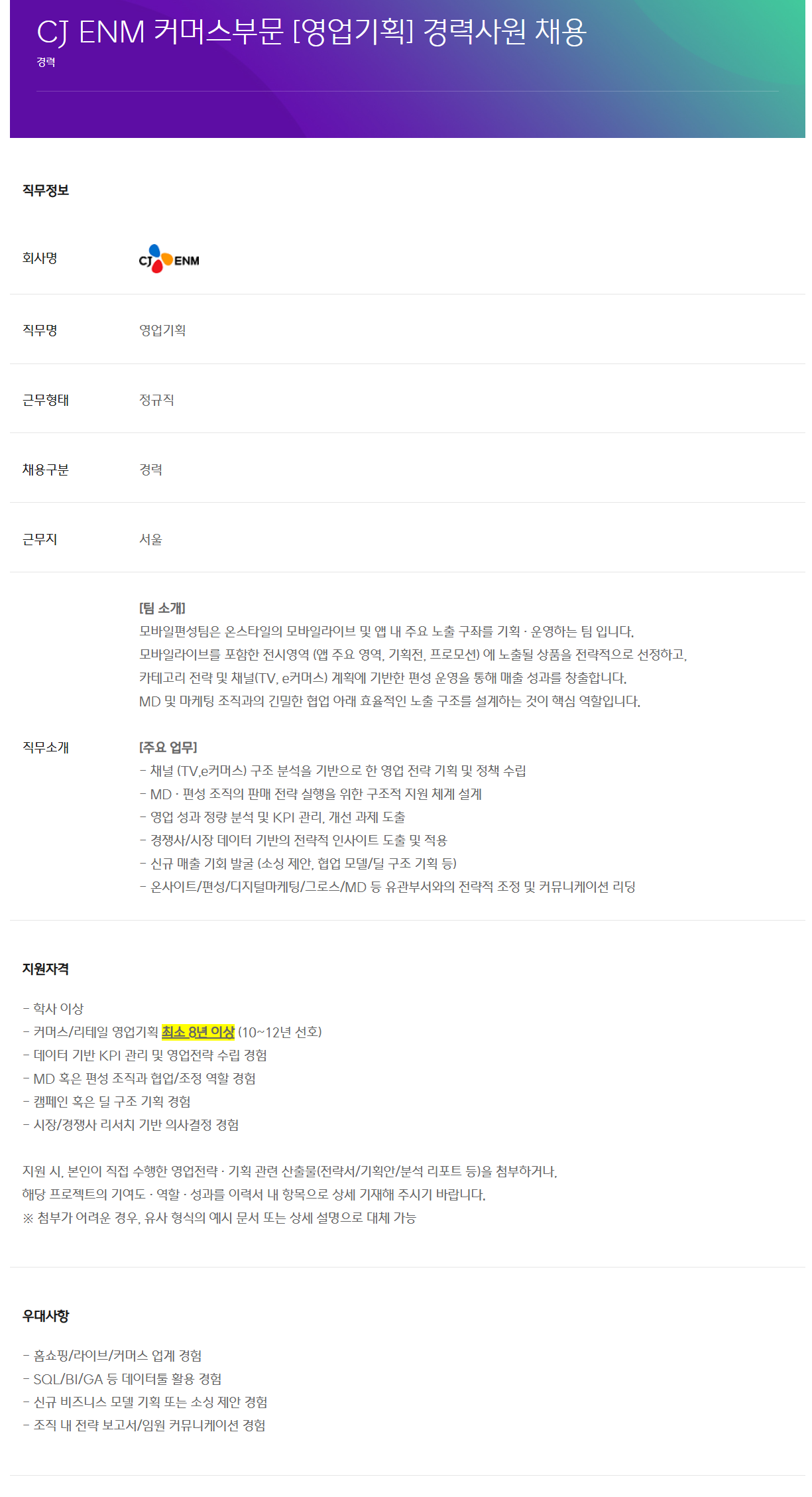 CJ ENM Ä¿¸Ó½ººÎ¹® [¿µ¾÷±âȹ] °æ·Â»ç¿ø ä¿ë